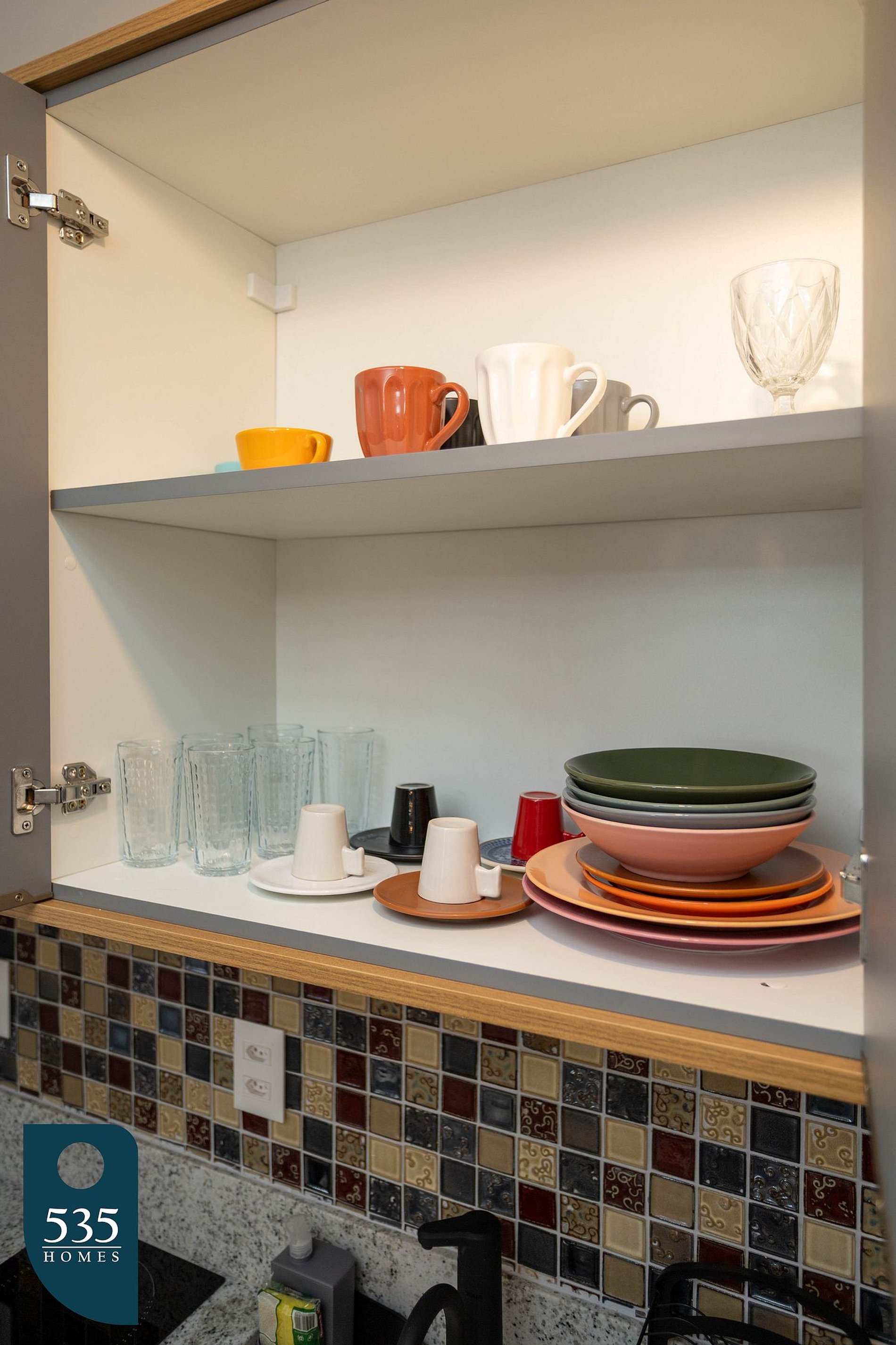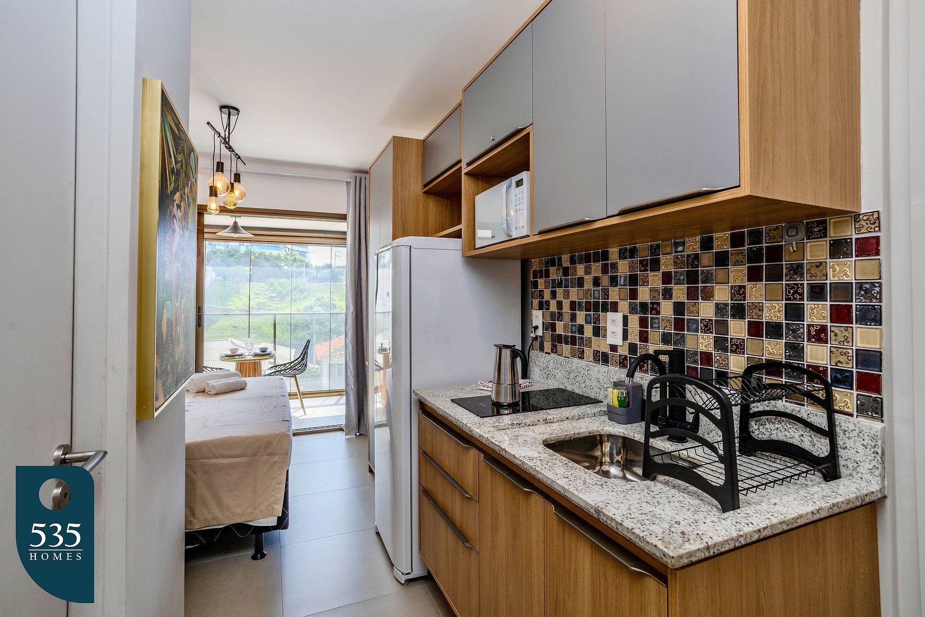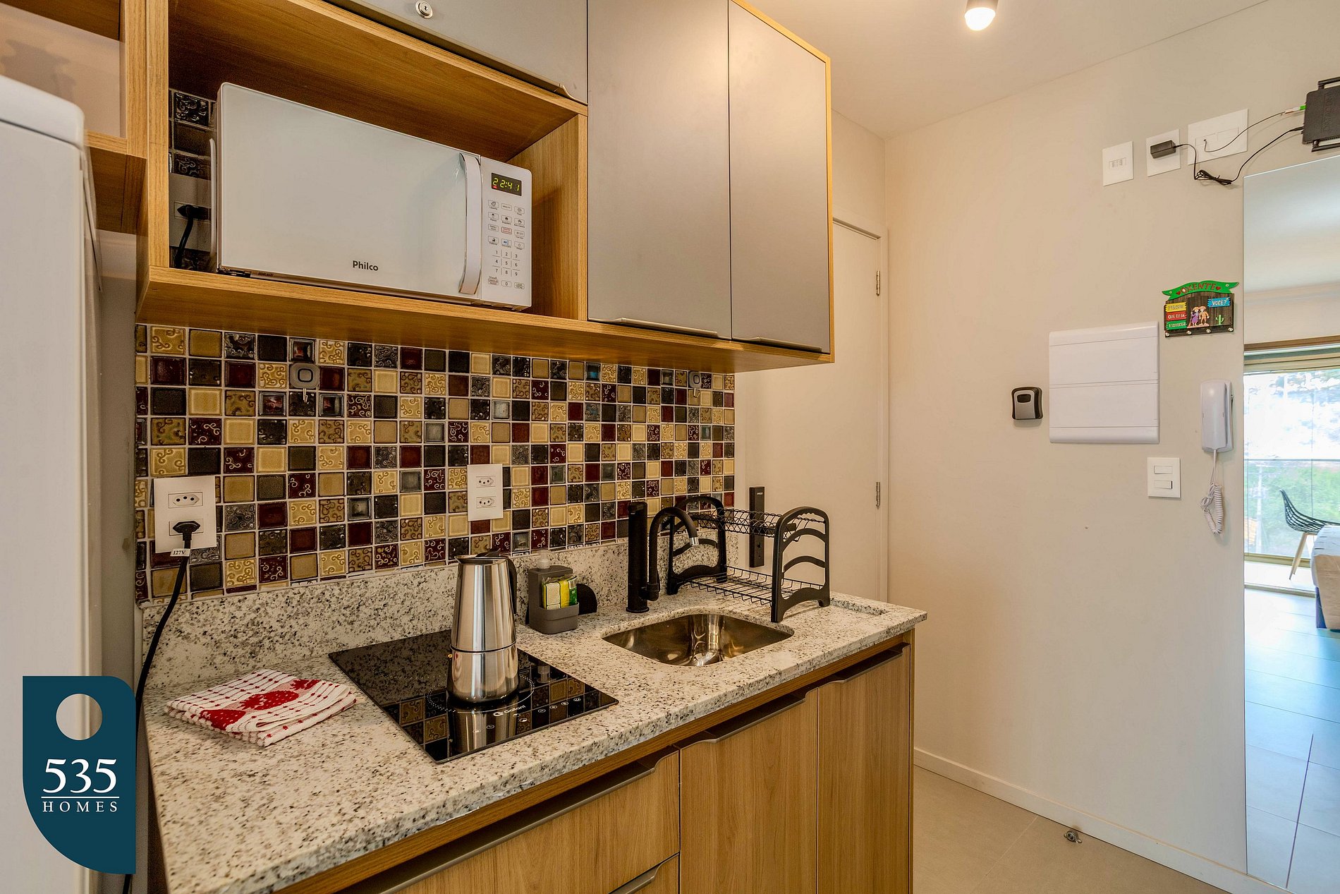 A cozinha é equipada com espelho de corpo, torneira com purificador de água acoplado, geladeira, cafeteira italiana, cafeteira elétrica, cooktop de indução com duas bocas, sanduicheira, liquidificador, micro-ondas e jogo de panelas, garantindo praticidade no preparo das refeições.