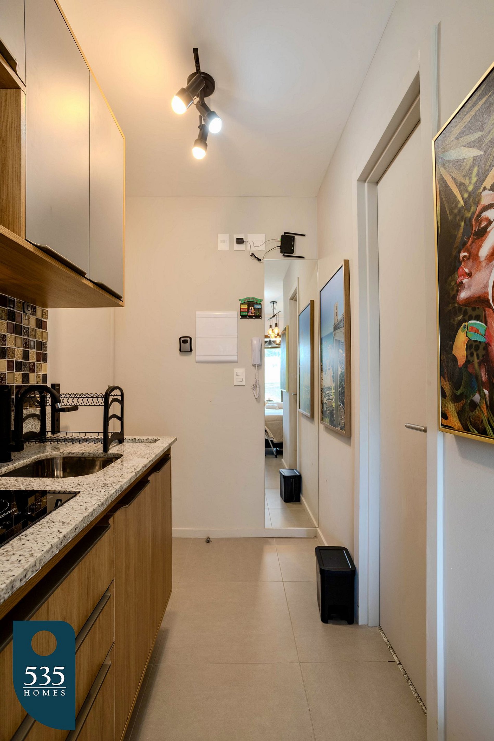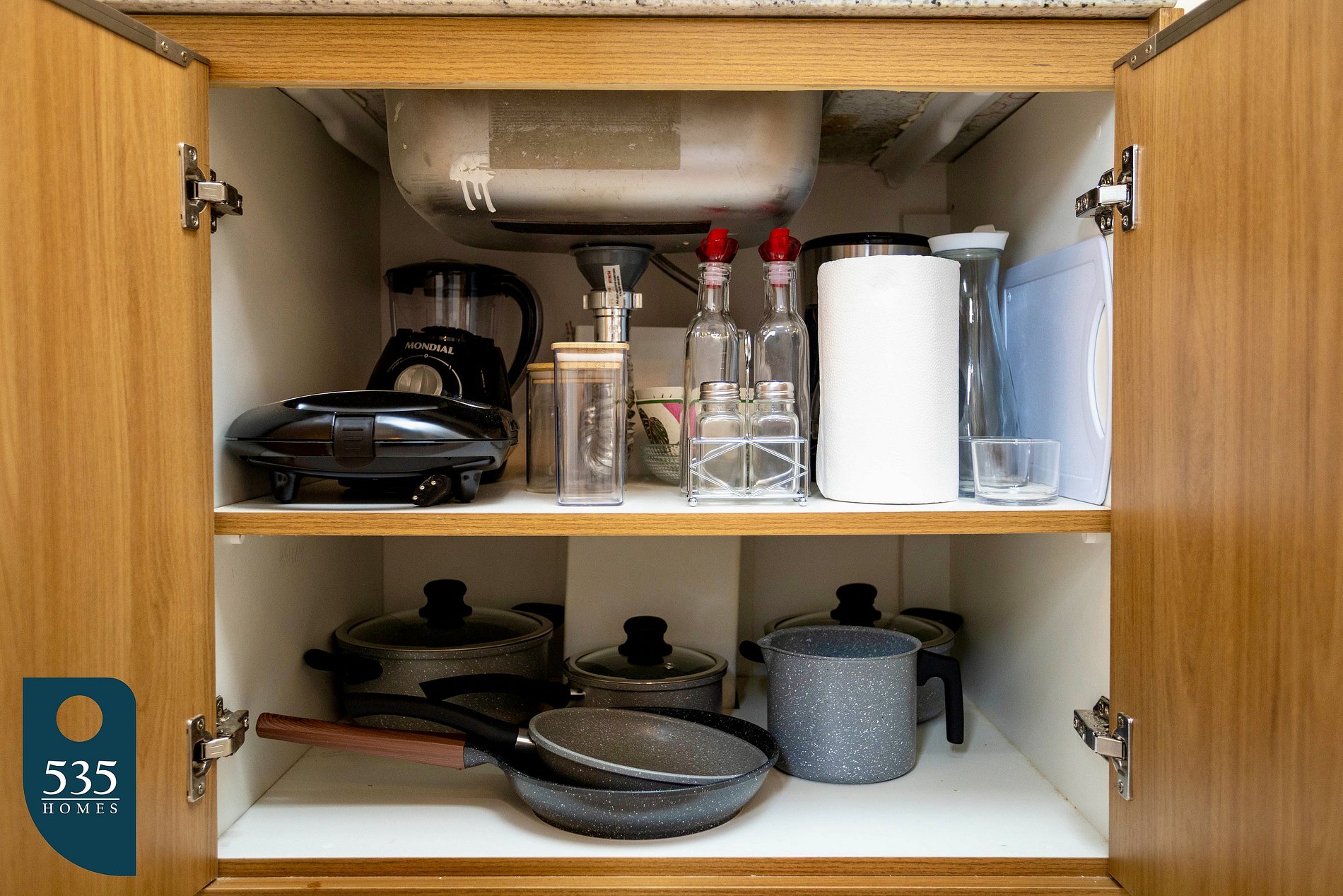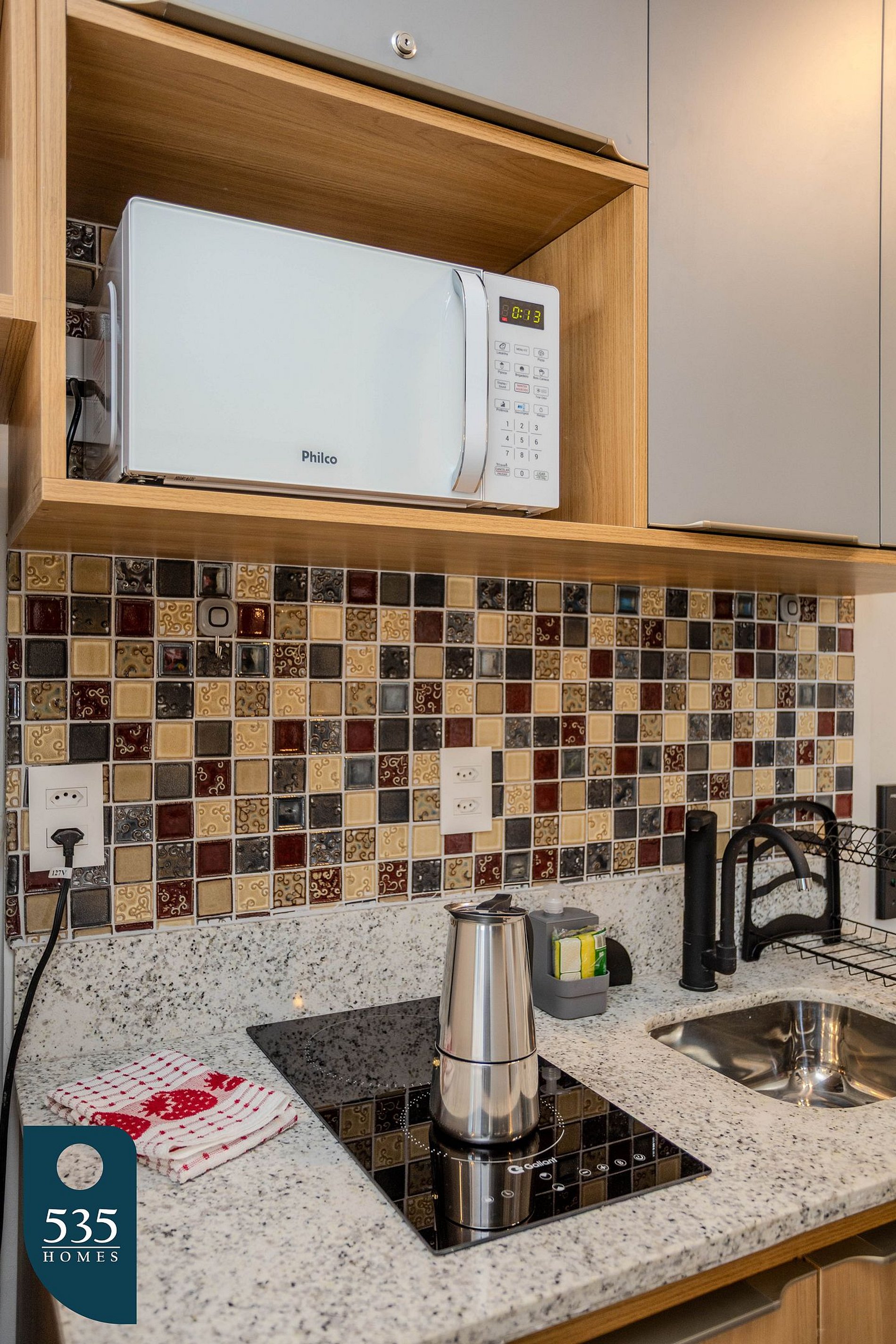 A cozinha é equipada com espelho de corpo, torneira com purificador de água acoplado, geladeira, cafeteira italiana, cafeteira elétrica, cooktop de indução com duas bocas, sanduicheira, liquidificador, micro-ondas e jogo de panelas, garantindo praticidade no preparo das refeições.