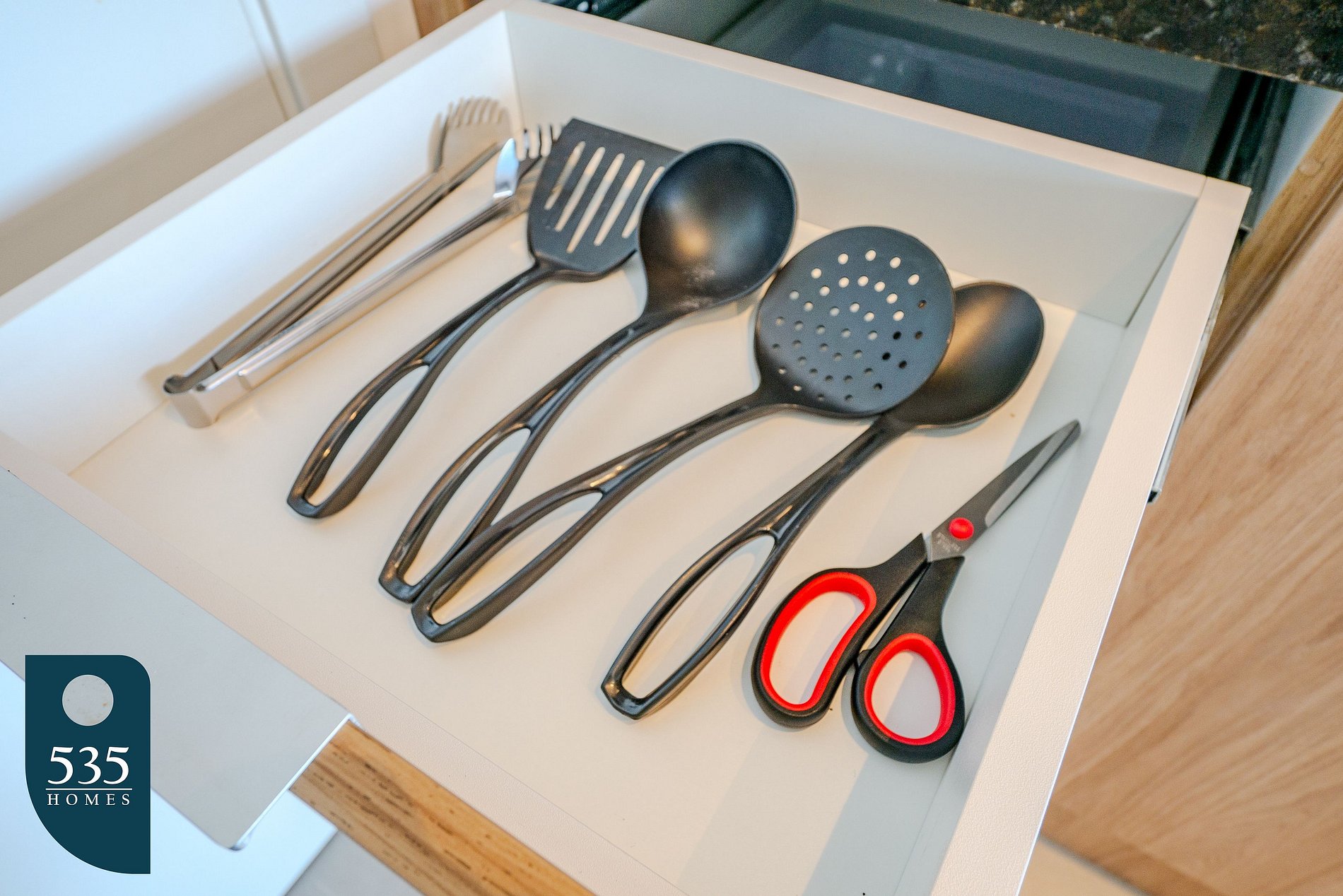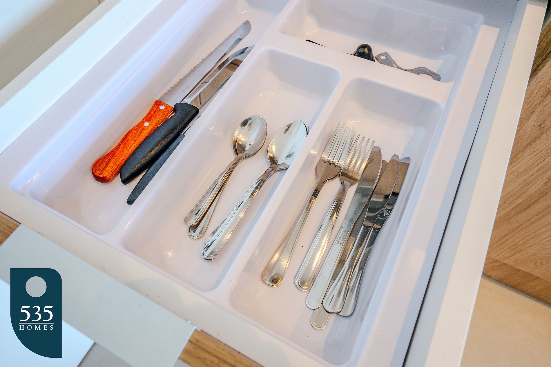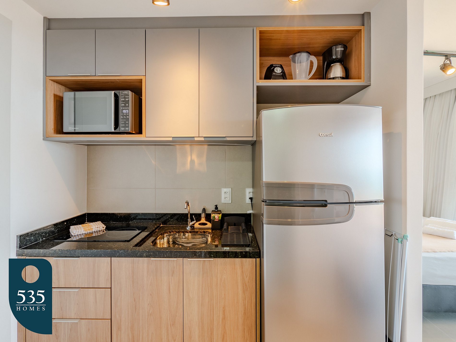 O apartamento conta com uma cozinha equipada com cooktop vitrocerâmico de duas bocas, geladeira, micro-ondas, sanduicheira, liquidificador, cafeteira elétrica e cafeteira italiana, oferecendo praticidade para o preparo das refeições.