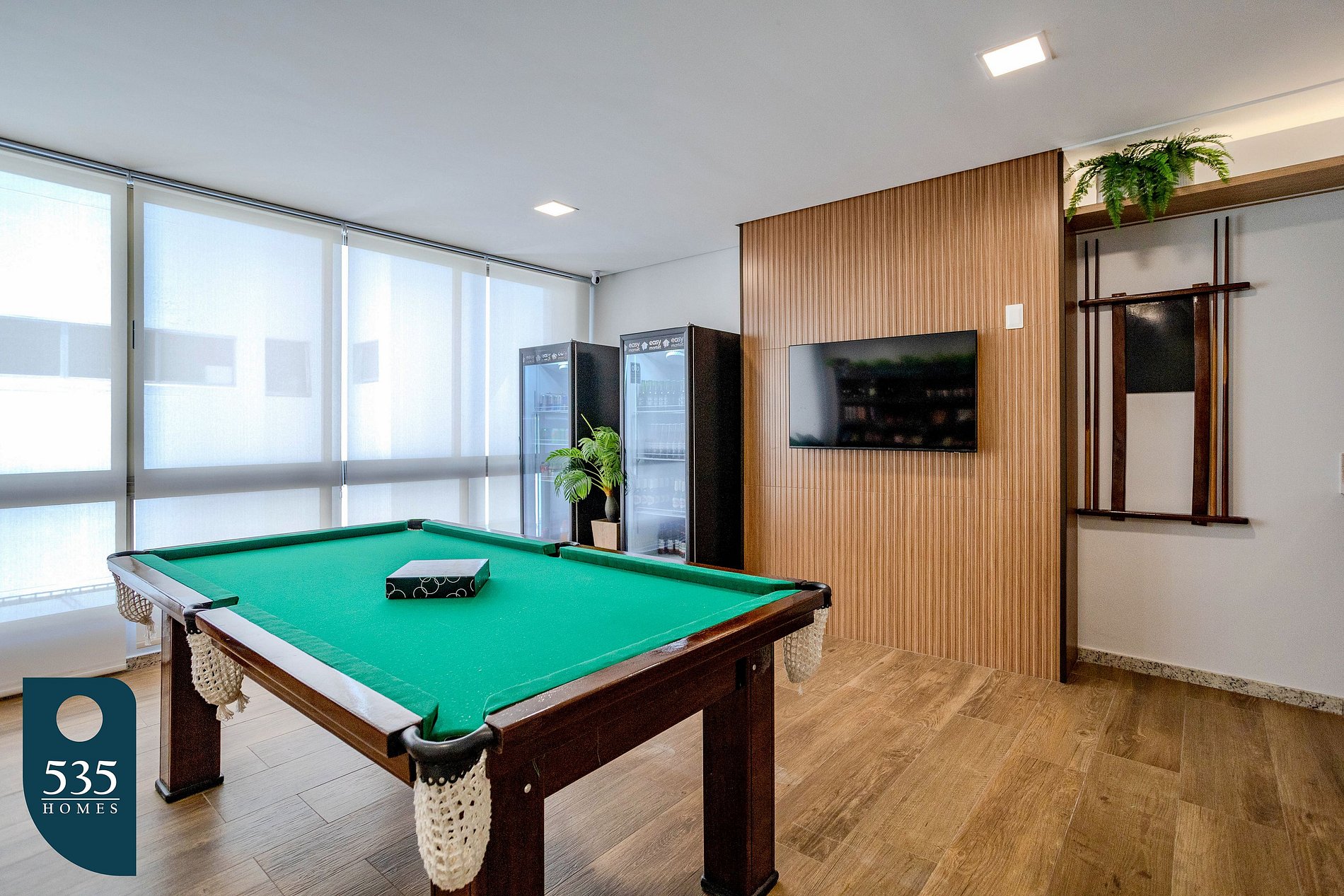 Na cobertura, o condomínio conta com área de convivência com bar gourmet e churrasqueira, além de piscina com vista para o mar.
