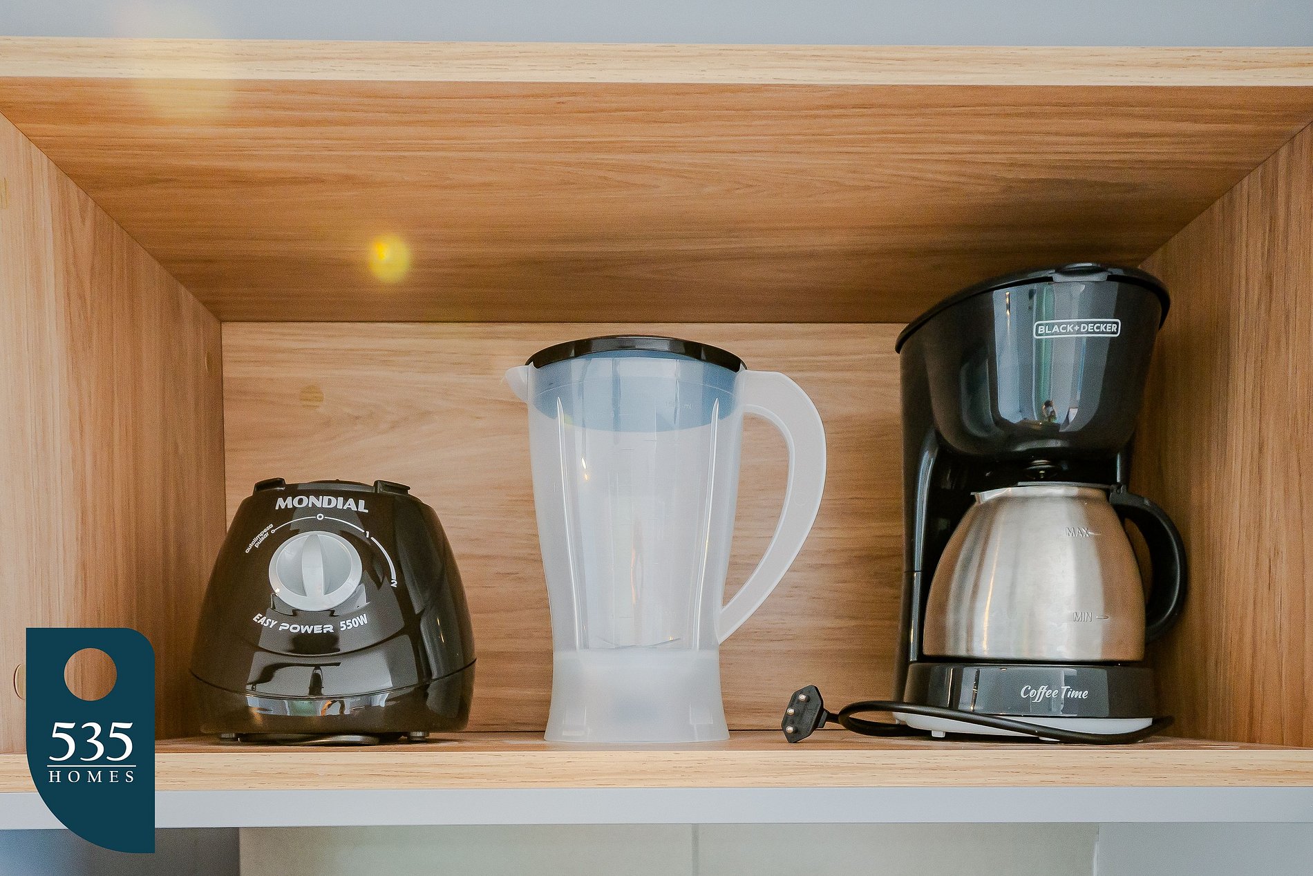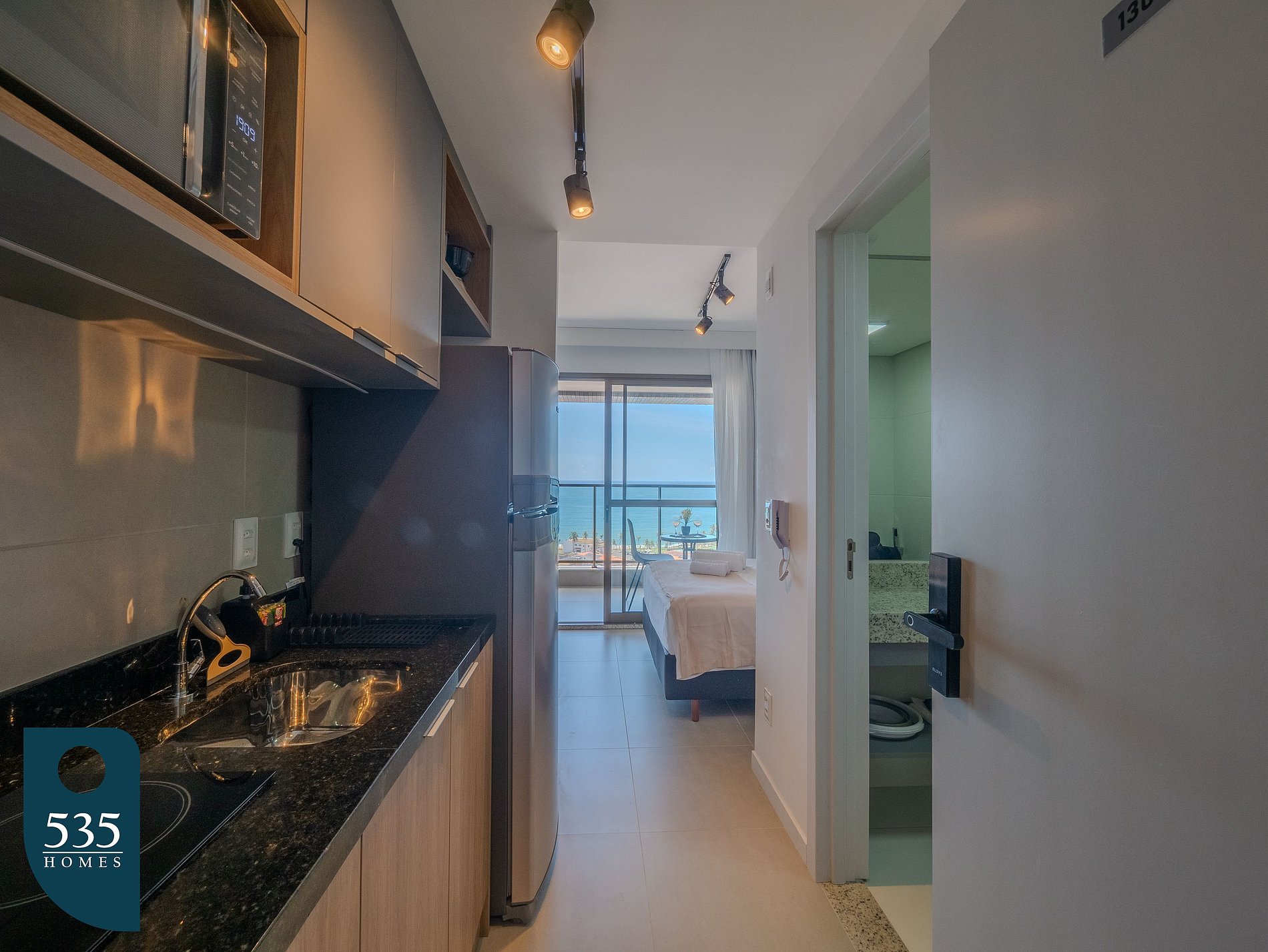 O apartamento conta com uma cozinha equipada com cooktop vitrocerâmico de duas bocas, geladeira, micro-ondas, sanduicheira, liquidificador, cafeteira elétrica e cafeteira italiana, oferecendo praticidade para o preparo das refeições.