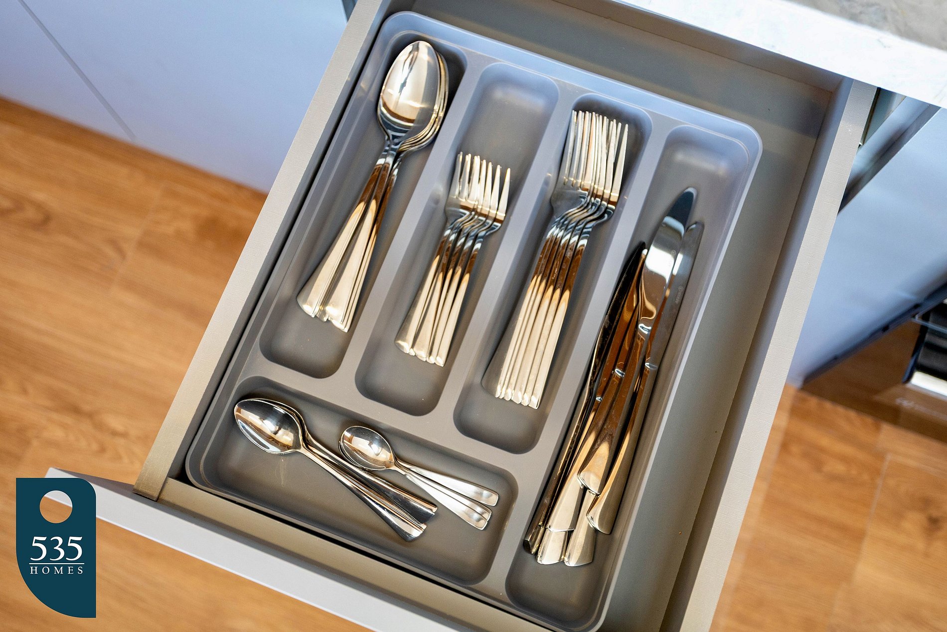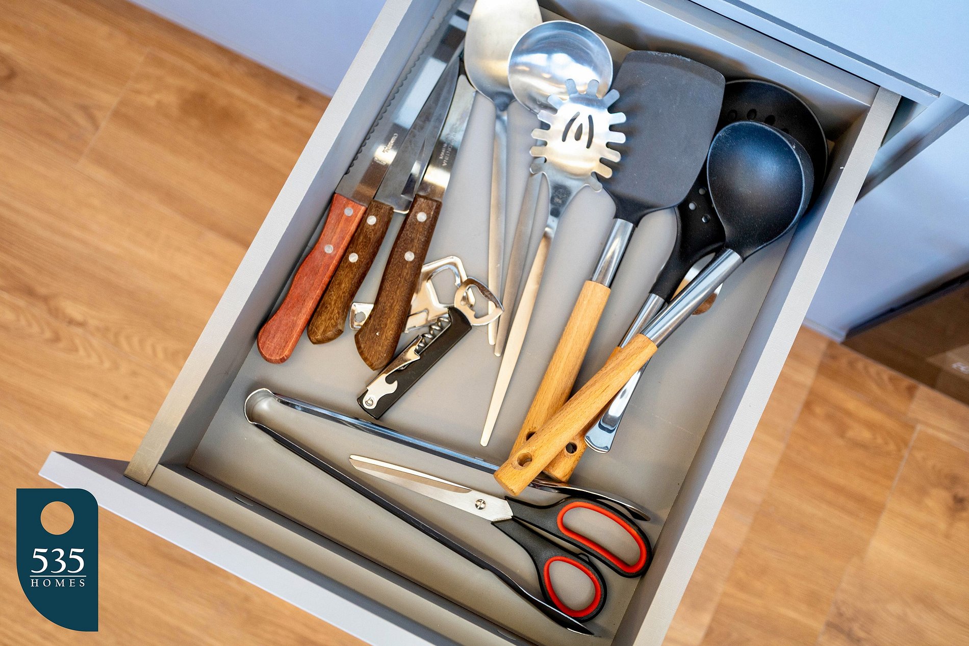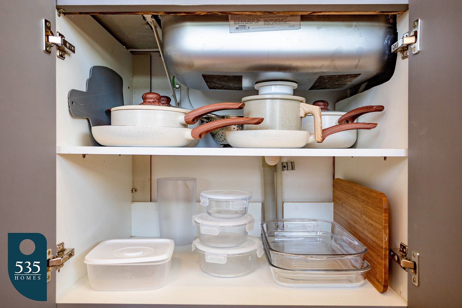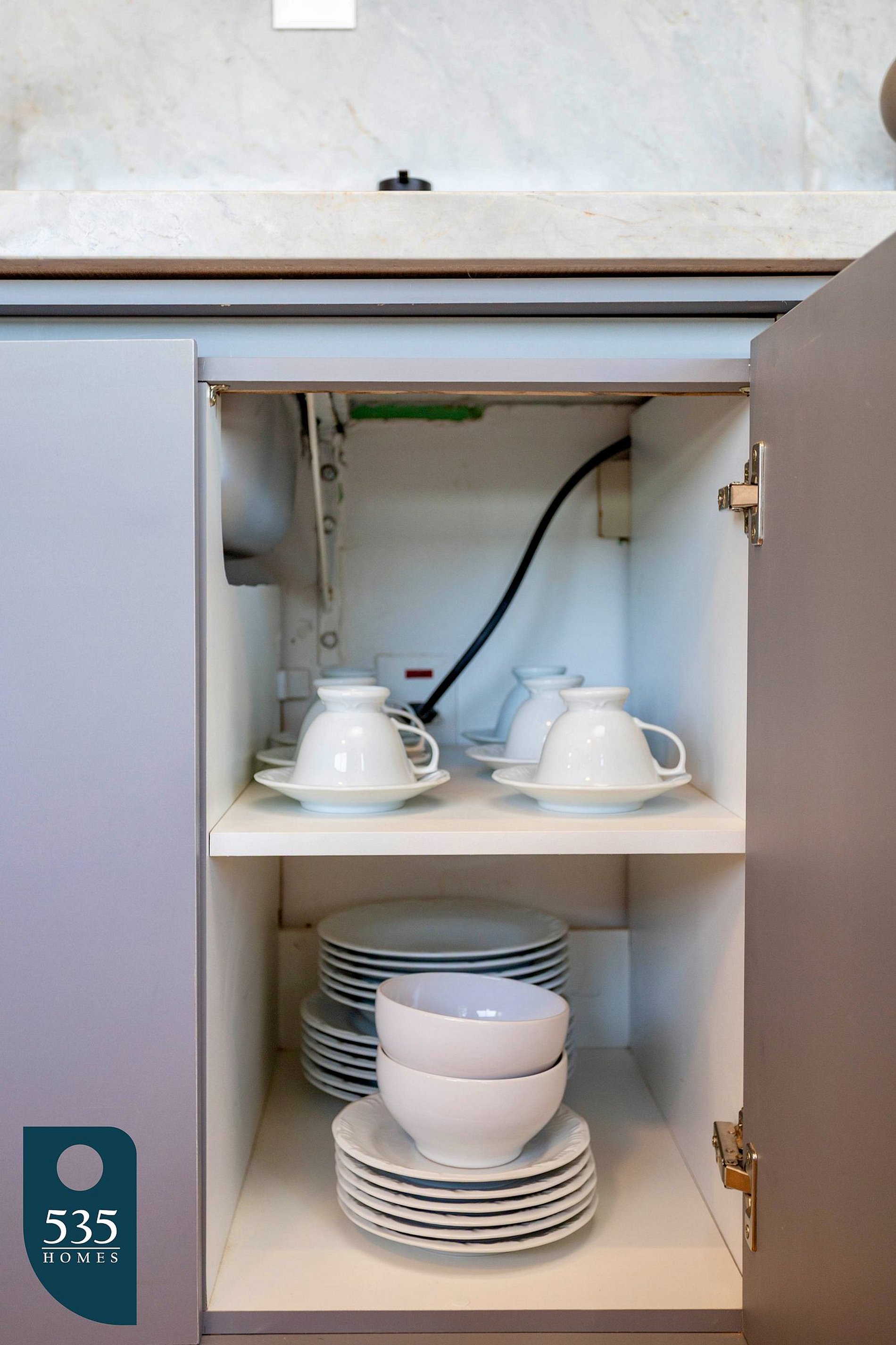 A cozinha é completa e funcional, com mesa de jantar e cadeiras, cooktop de indução de quatro bocas, geladeira, purificador de água, forno, micro-ondas, sanduicheira, airfryer, liquidificador, cafeteira elétrica, máquina de café e jogo de panelas, oferecendo praticidade para o preparo das refeições.