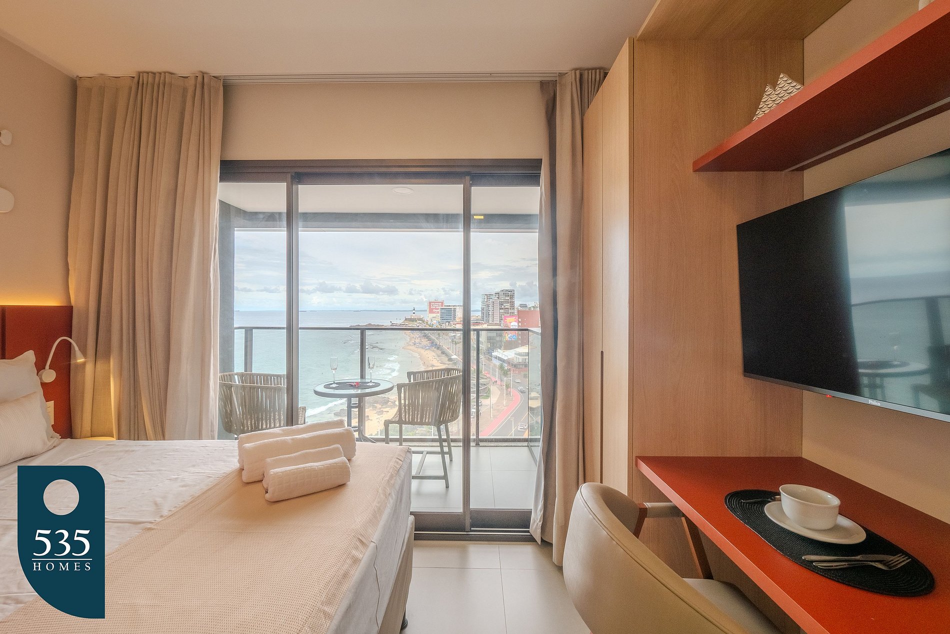 O apartamento conta com uma entrada equipada com espelho de corpo inteiro e uma cozinha funcional com geladeira, cooktop de indução de duas bocas, depurador de ar, sanduicheira, liquidificador, cafeteira italiana, máquina de café e jogo de panelas, oferecendo praticidade no preparo das refeições. Para maior comodidade durante a estadia, há varal de roupas, mesa de passar e ferro elétrico. O banheiro dispõe de chuveiro elétrico, exaustor, ducha higiênica e secador de cabelo. No quarto, os hóspedes encontram ar-condicionado, estação de trabalho, smart TV de 50" e cortinas com blackout, garantindo conforto tanto para descanso quanto para trabalho remoto. A varanda é mobiliada com mesa e cadeiras, ideal para momentos de relaxamento.
