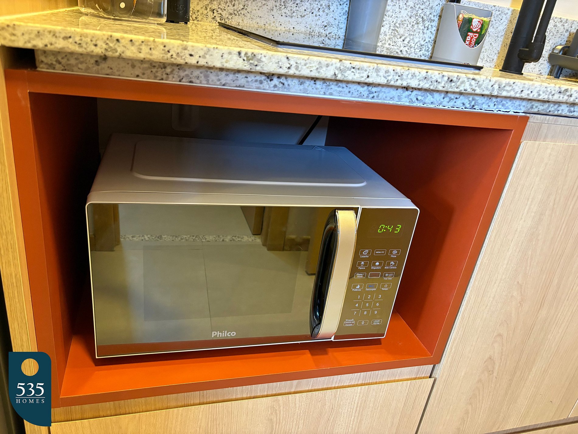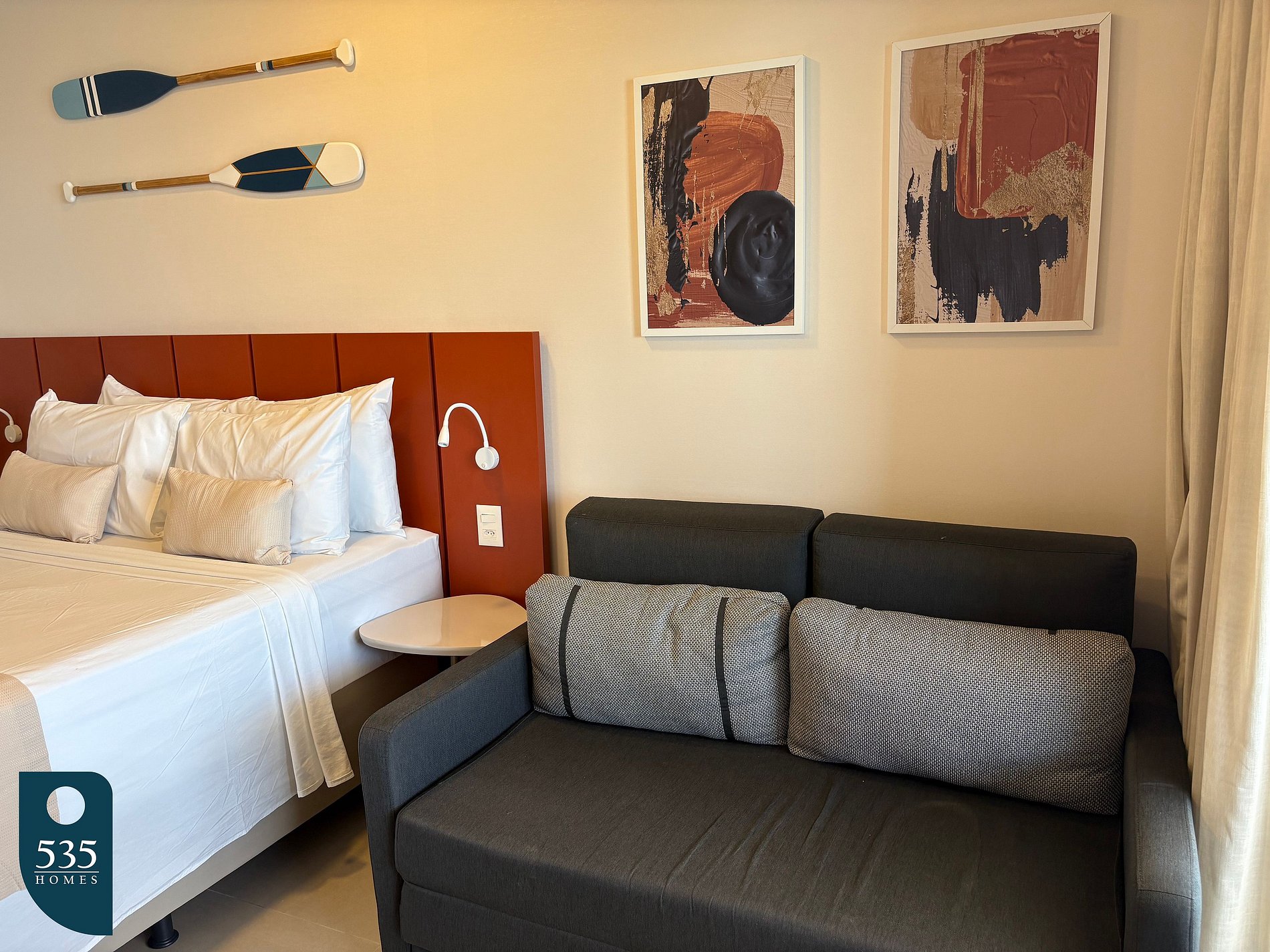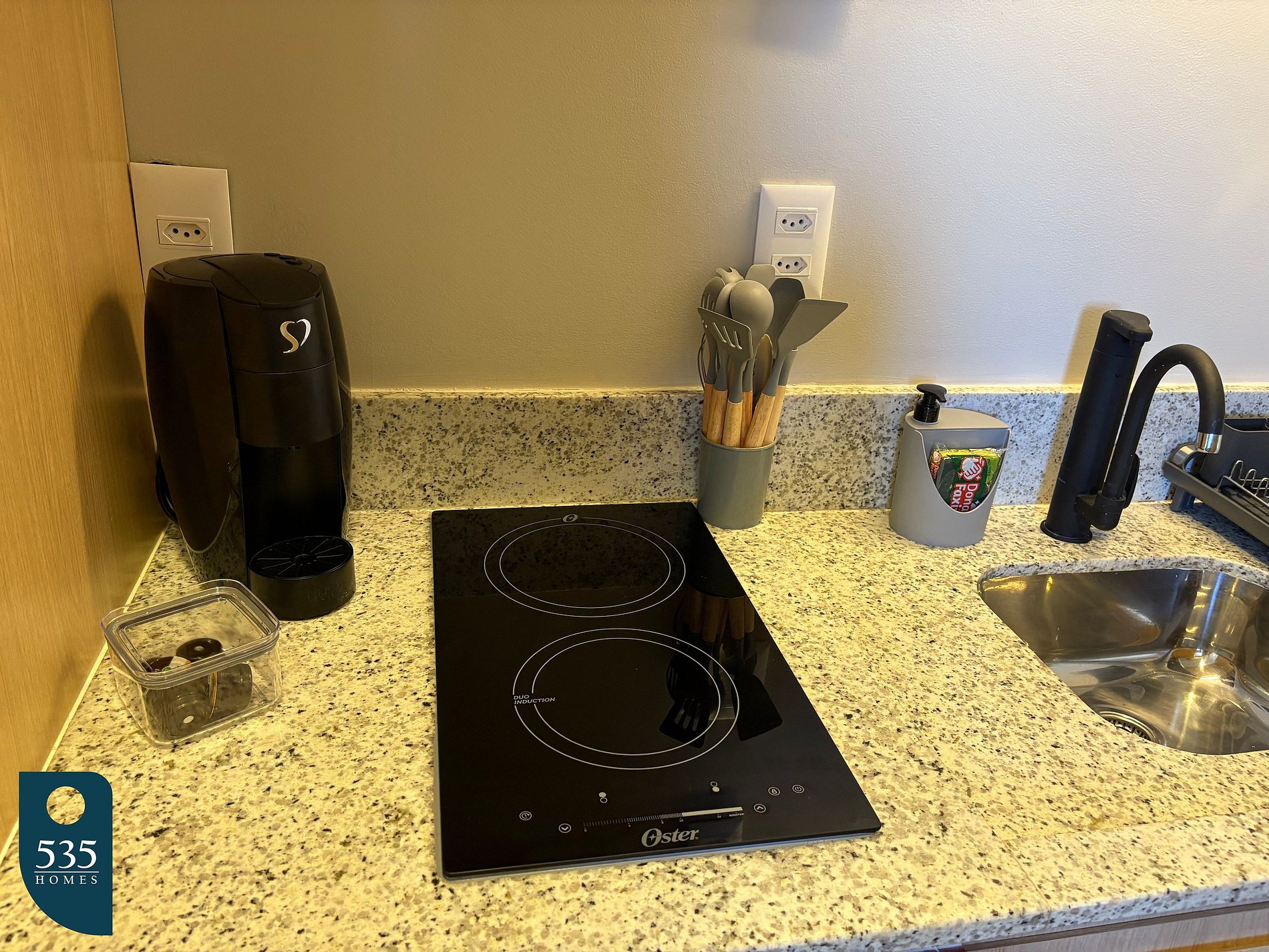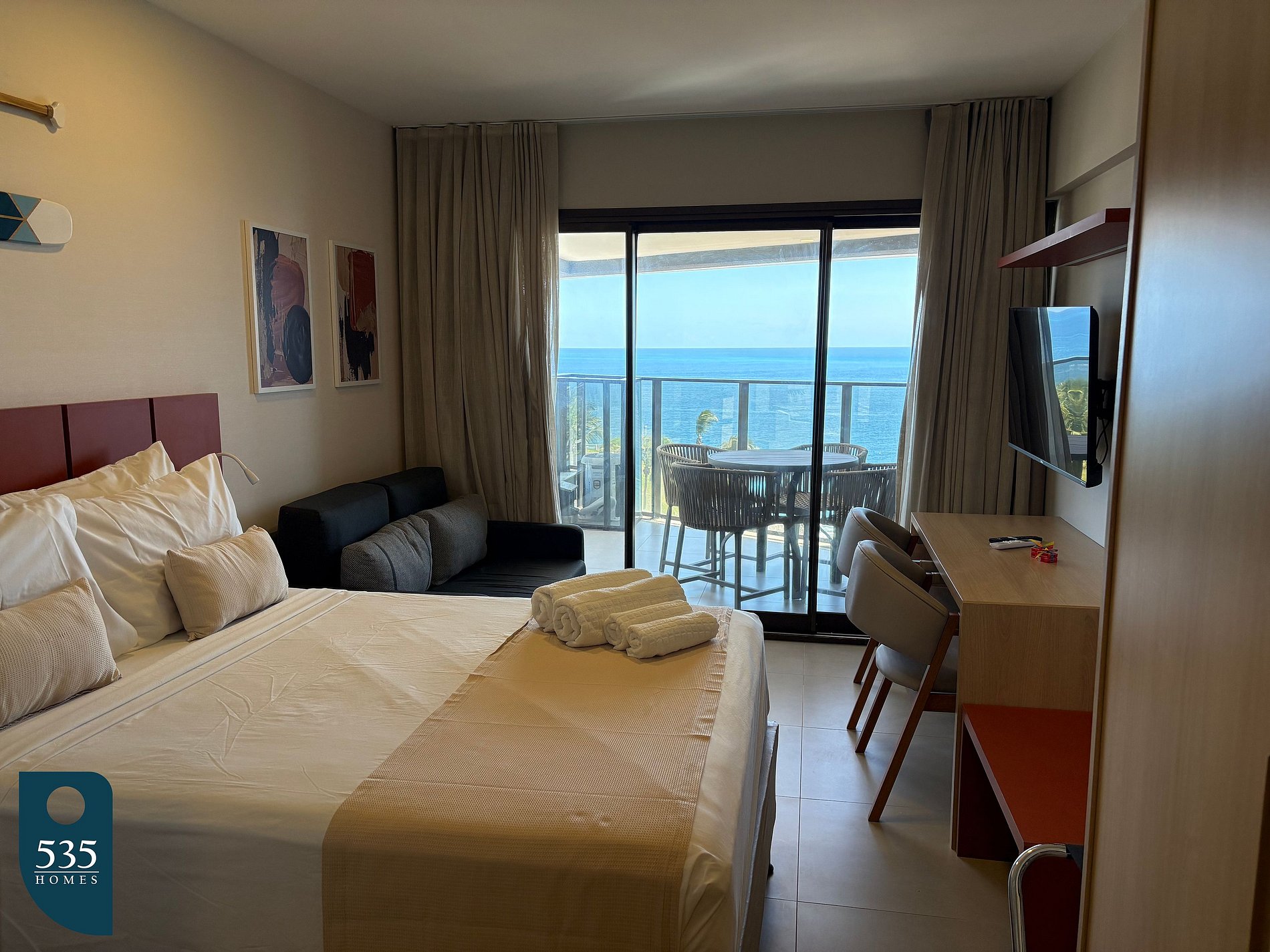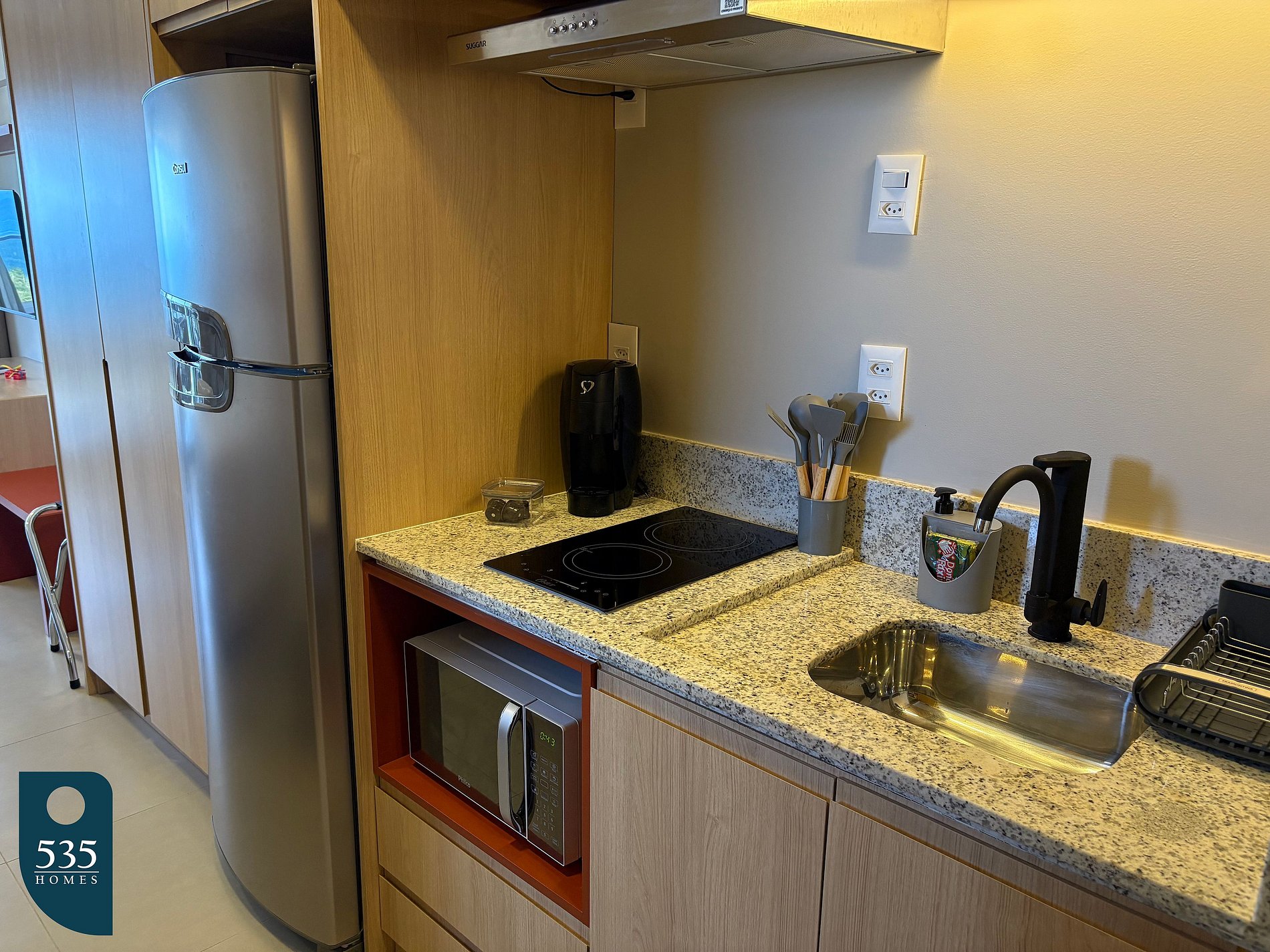 O apartamento integra entrada e cozinha em um ambiente funcional, equipado com espelho de corpo inteiro, geladeira, micro-ondas, depurador de ar, cooktop de indução de duas bocas, liquidificador, sanduicheira, máquina de café e torneira com purificador de água acoplado, oferecendo praticidade para o dia a dia. O banheiro dispõe de chuveiro elétrico, janela e secador de cabelo. No quarto, os hóspedes encontram ar-condicionado, smart TV de 50", estação de trabalho, mesa de passar roupa, ferro elétrico e cortina com blackout, garantindo conforto tanto para descanso quanto para trabalho remoto. A varanda é mobiliada com mesa e cadeiras, ideal para momentos de relaxamento.