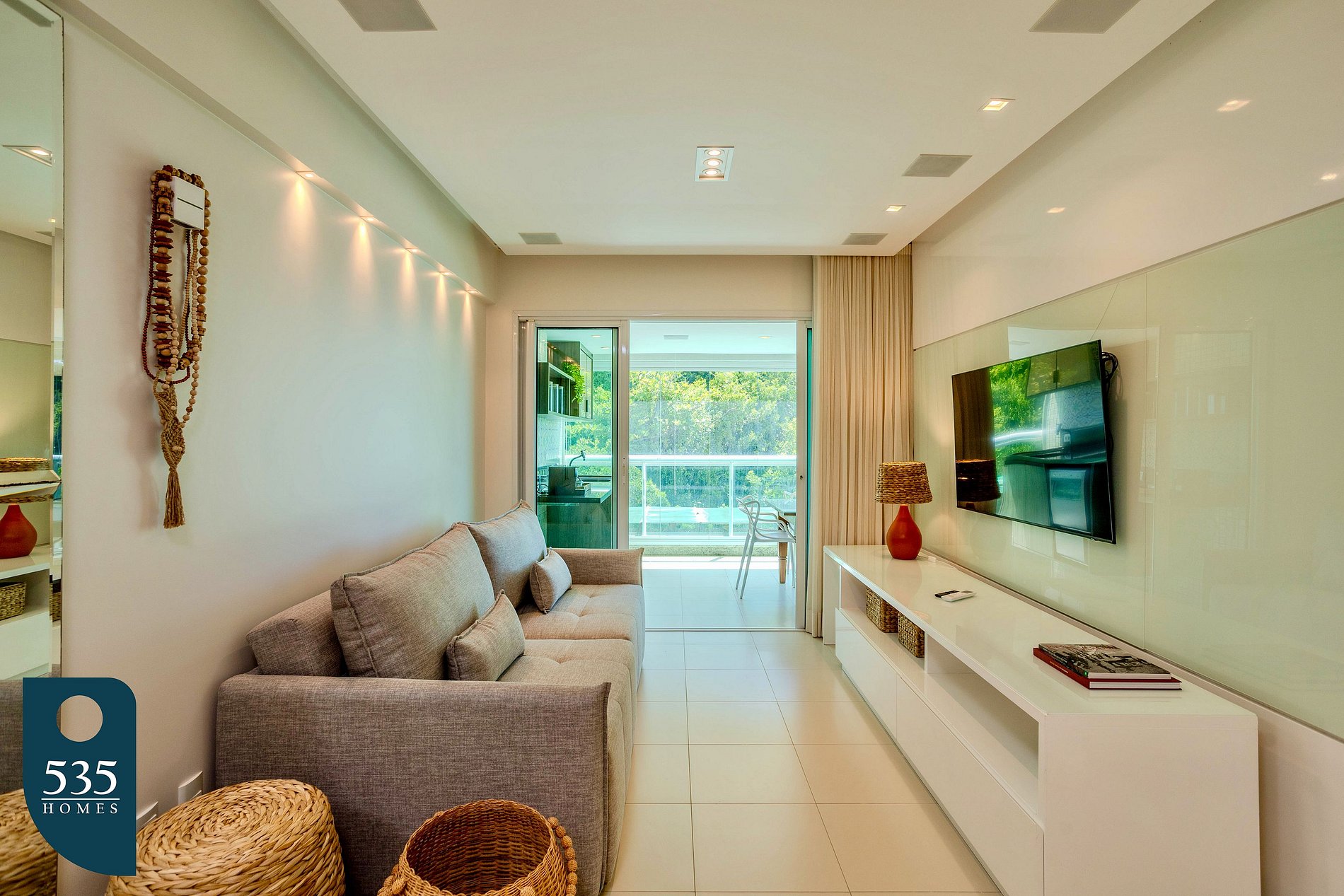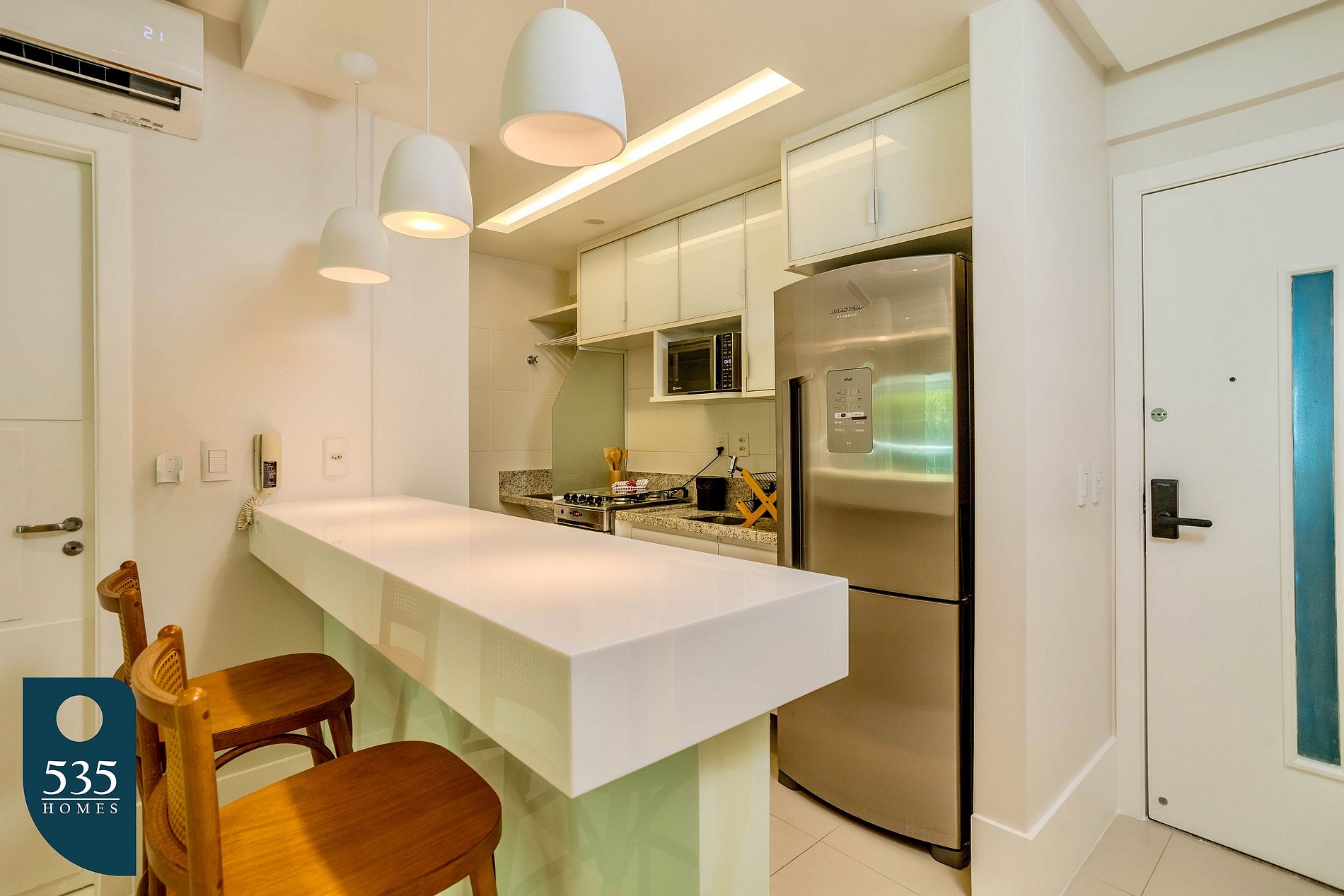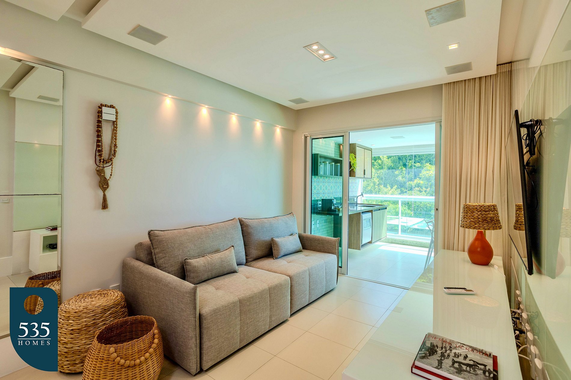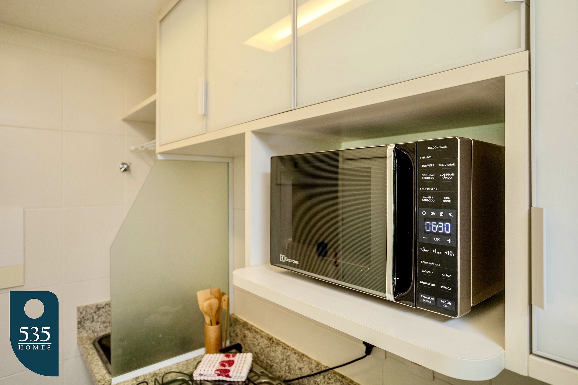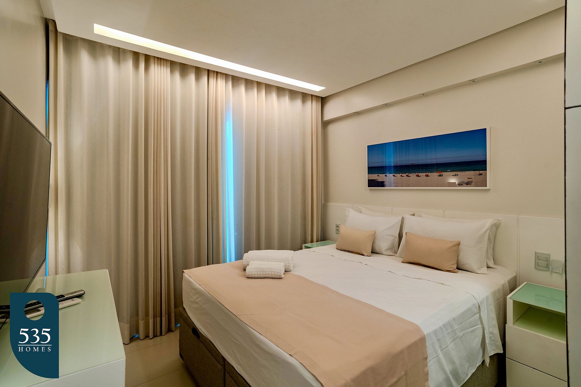 O apartamento dispõe de uma cozinha completa equipada com geladeira, micro-ondas, fogão a gás de quatro bocas, forno a gás, purificador de água, liquidificador, sanduicheira, máquina de lavar pratos, cafeteira italiana e máquina de café, oferecendo praticidade para o preparo das refeições. A lavanderia conta com máquina de lavar e secar roupas, varal compacto e varal de chão, além de ferro elétrico e mesa compacta para passar roupa. Há também um lavabo com espelho de rosto. A sala é confortável e funcional, com espelho de corpo inteiro, ar-condicionado, sofá-cama, smart TV de 55" e cortina com blackout. O quarto integrado ao closet dispõe de ar-condicionado, smart TV de 50" e cortina com blackout. O banheiro da suíte é equipado com exaustor, porta escova e secador de cabelo. A varanda é mobiliada com mesa e cadeiras e conta com cortina blackout rolô e fechamento com cortina de vidro, proporcionando um ambiente agradável para relaxamento.