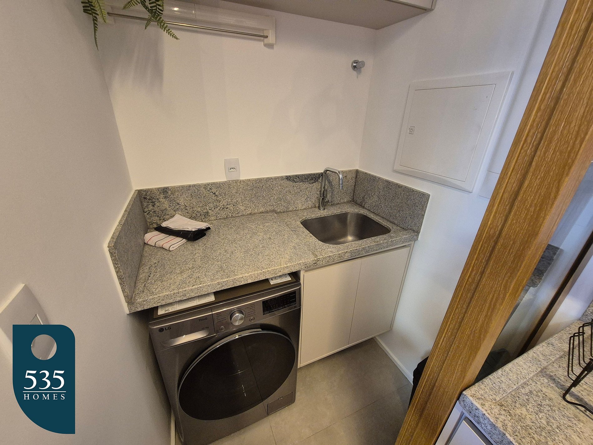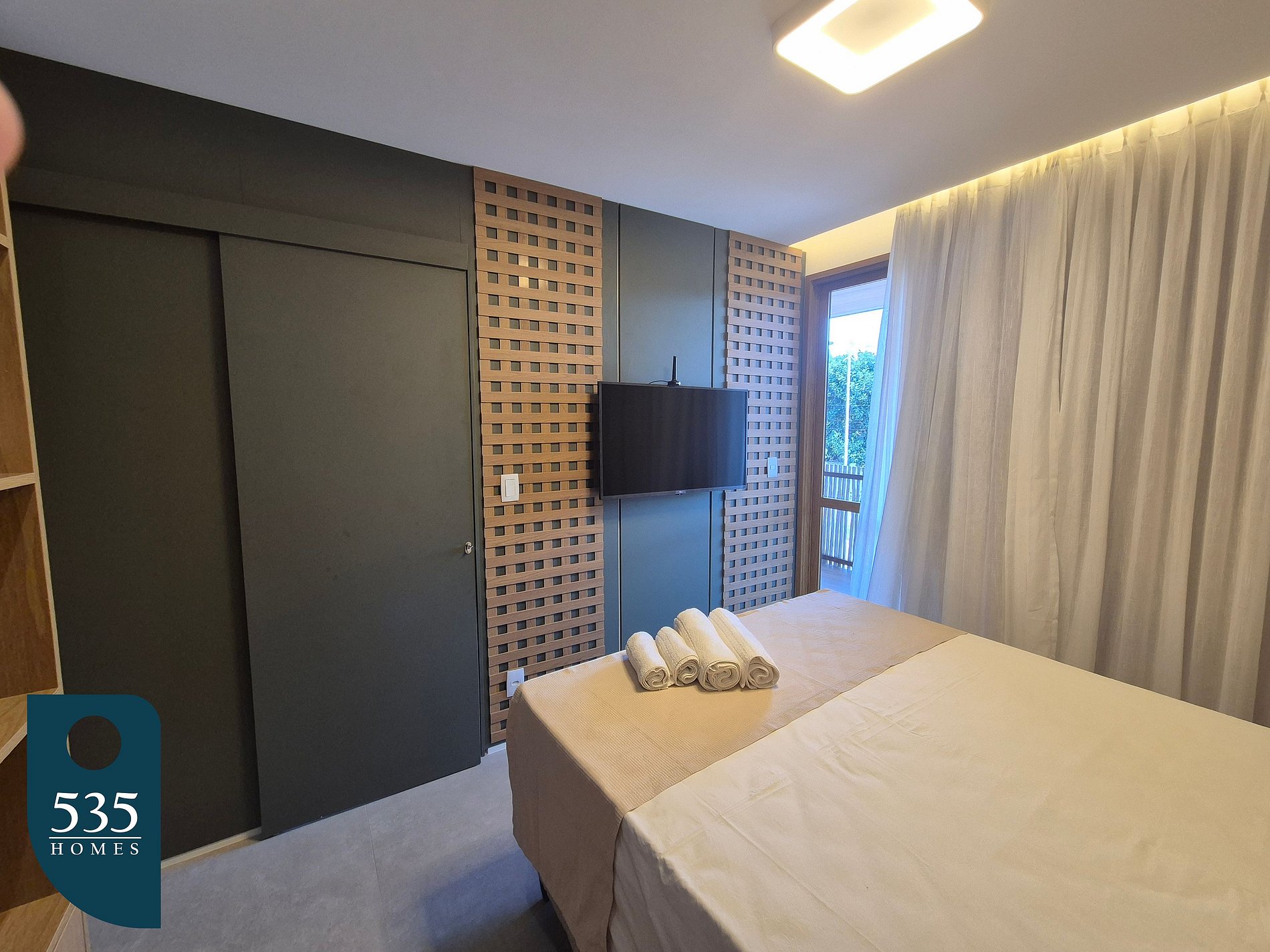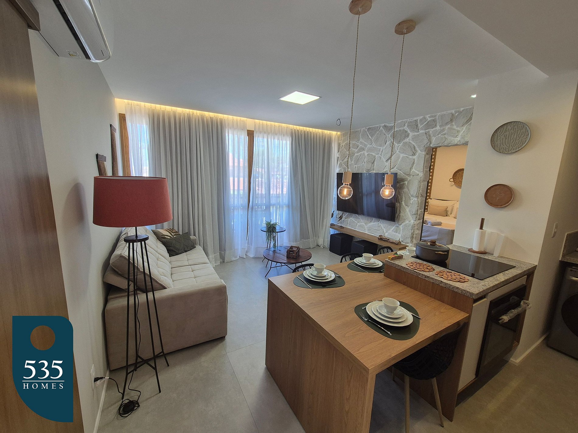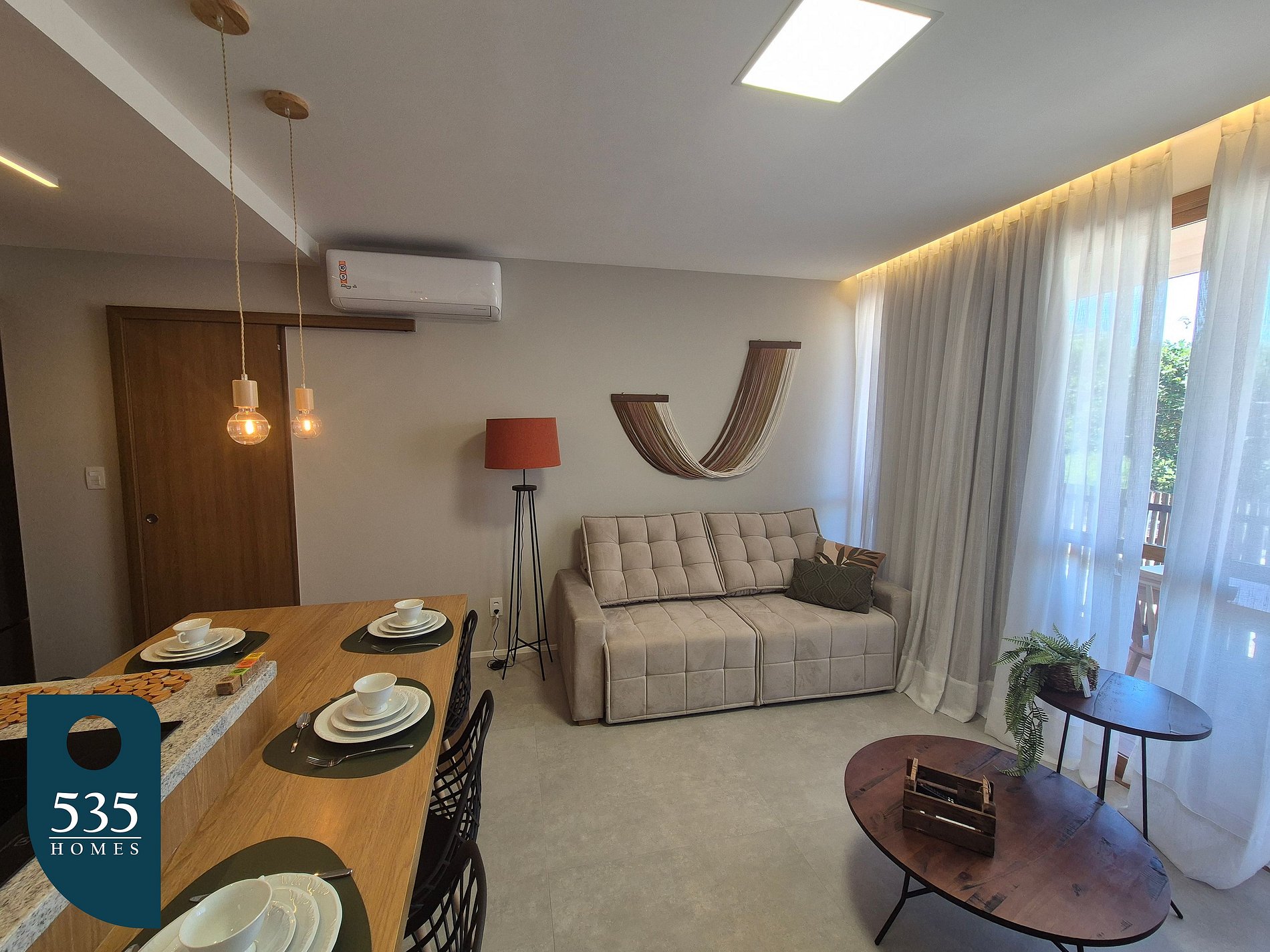 O apartamento dispõe de uma cozinha equipada com cooktop de indução de quatro bocas, geladeira, micro-ondas, purificador de água, airfryer, liquidificador e sanduicheira, oferecendo praticidade para o preparo das refeições. A lavanderia conta com máquina de lavar e secar roupas, além de varal de chão e varal retrátil de parede para maior comodidade durante a estadia. A sala é ampla e confortável, com ar-condicionado, sofá, luminária de chão, smart TV de 65", cortina com blackout, máquina de café e adega climatizada, criando um ambiente ideal para relaxar. A varanda é mobiliada com mesas e cadeiras, proporcionando um espaço agradável para momentos ao ar livre. O quarto social dispõe de ar-condicionado, cortina com blackout e luminária de parede lateral, enquanto o banheiro social conta com janela e chuveiro com aquecimento. A suíte oferece ar-condicionado, smart TV de 43", cortina com blackout, mesa de passar roupa compacta e ferro elétrico. O banheiro da suíte possui janela, secador de cabelo e chuveiro com aquecimento, completando a estrutura para uma estadia confortável e funcional.