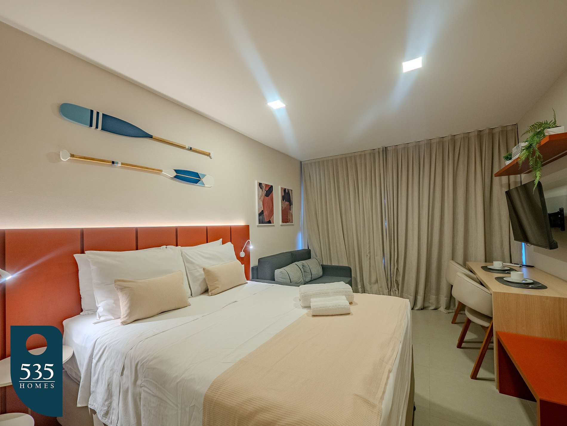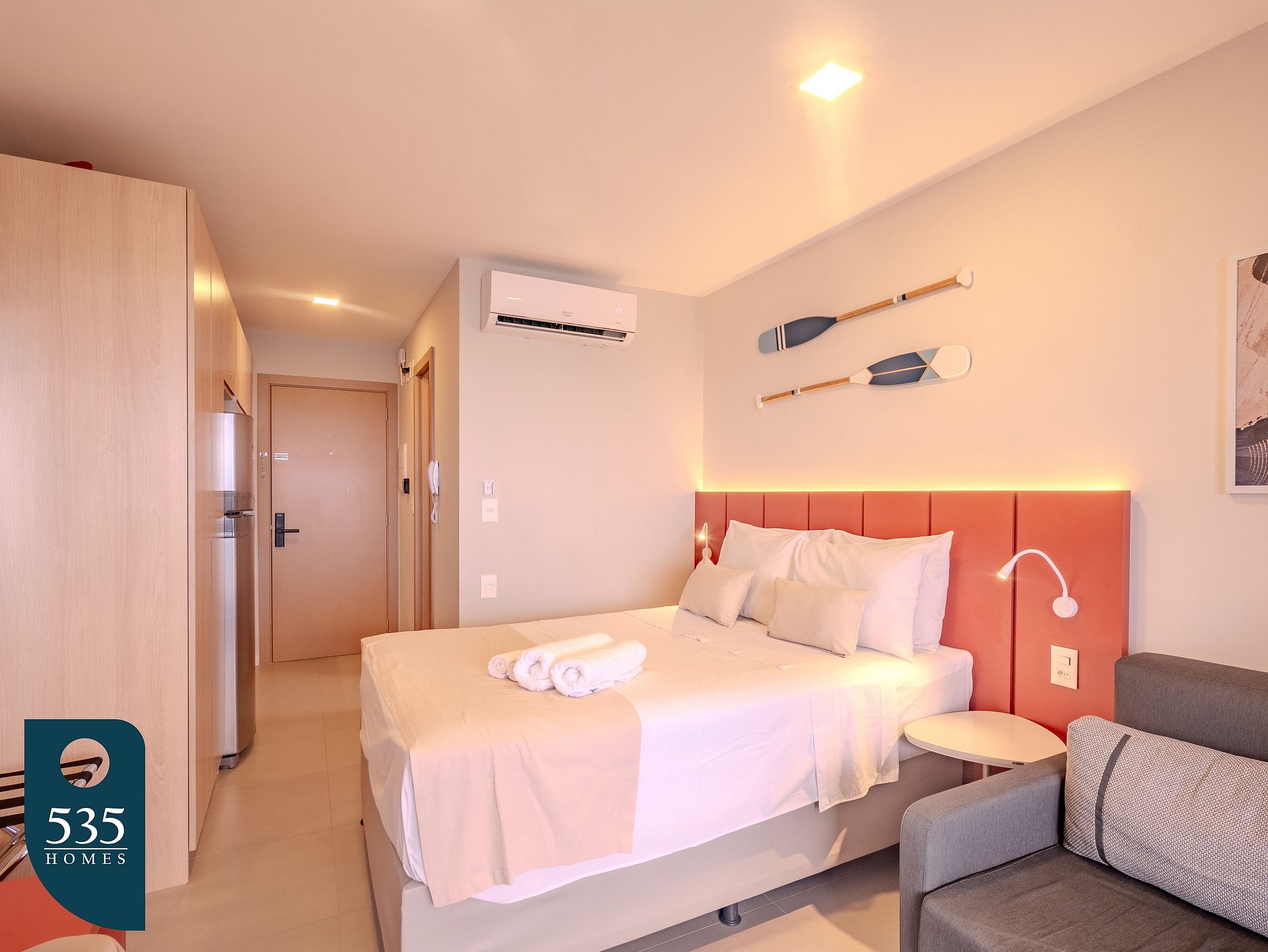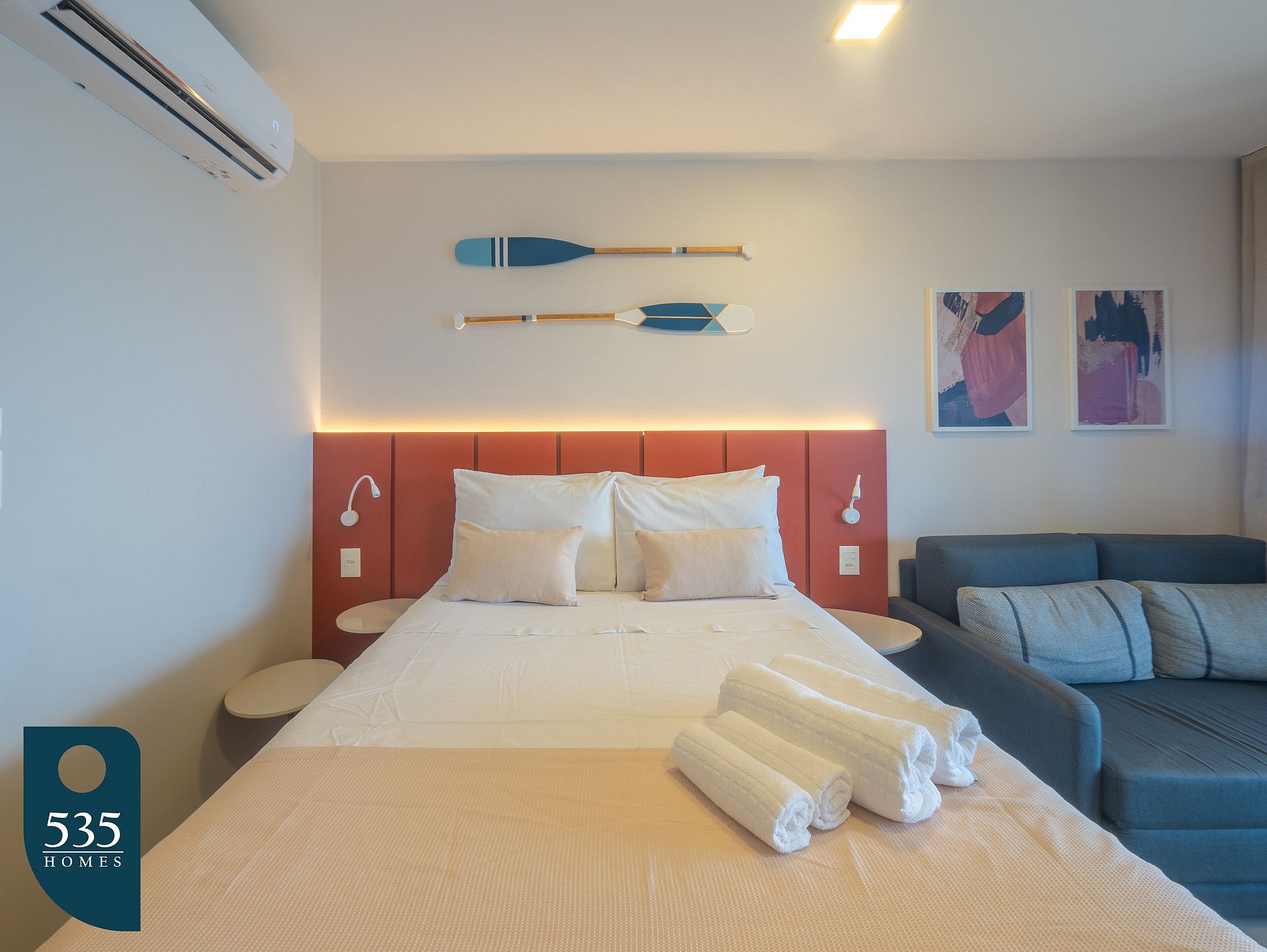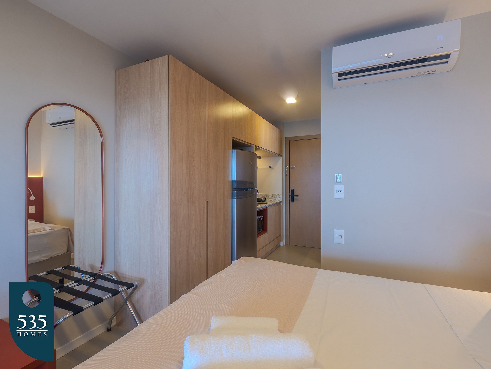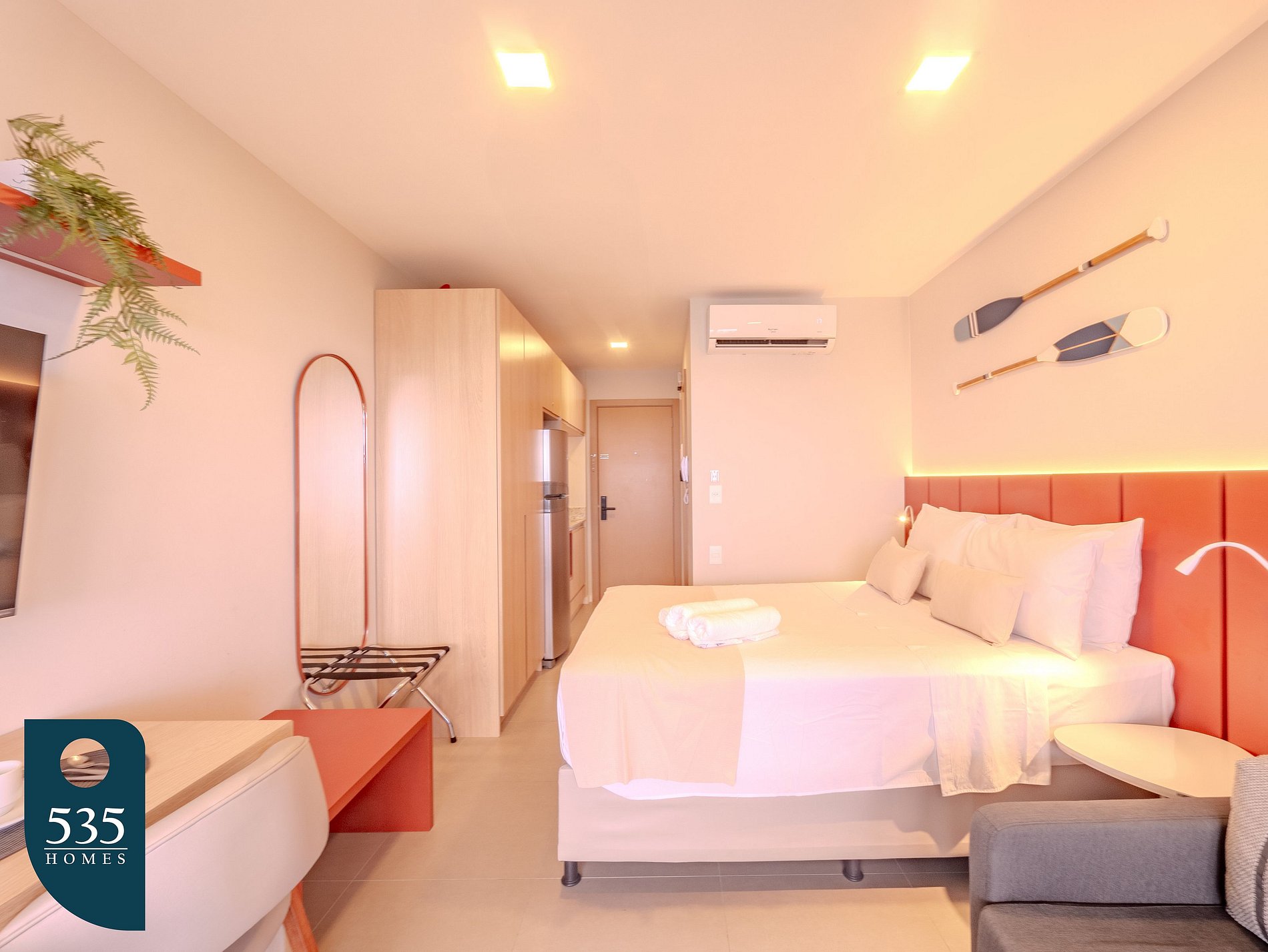 No quarto, o ambiente foi planejado para unir descanso e praticidade, contando com ar-condicionado, Smart TV de 43”, estação de trabalho, espelho de corpo inteiro, maleiro dobrável, mesa de passar roupa, ferro elétrico e cabides, oferecendo conforto tanto para momentos de relaxamento quanto para quem precisa trabalhar durante a estadia.