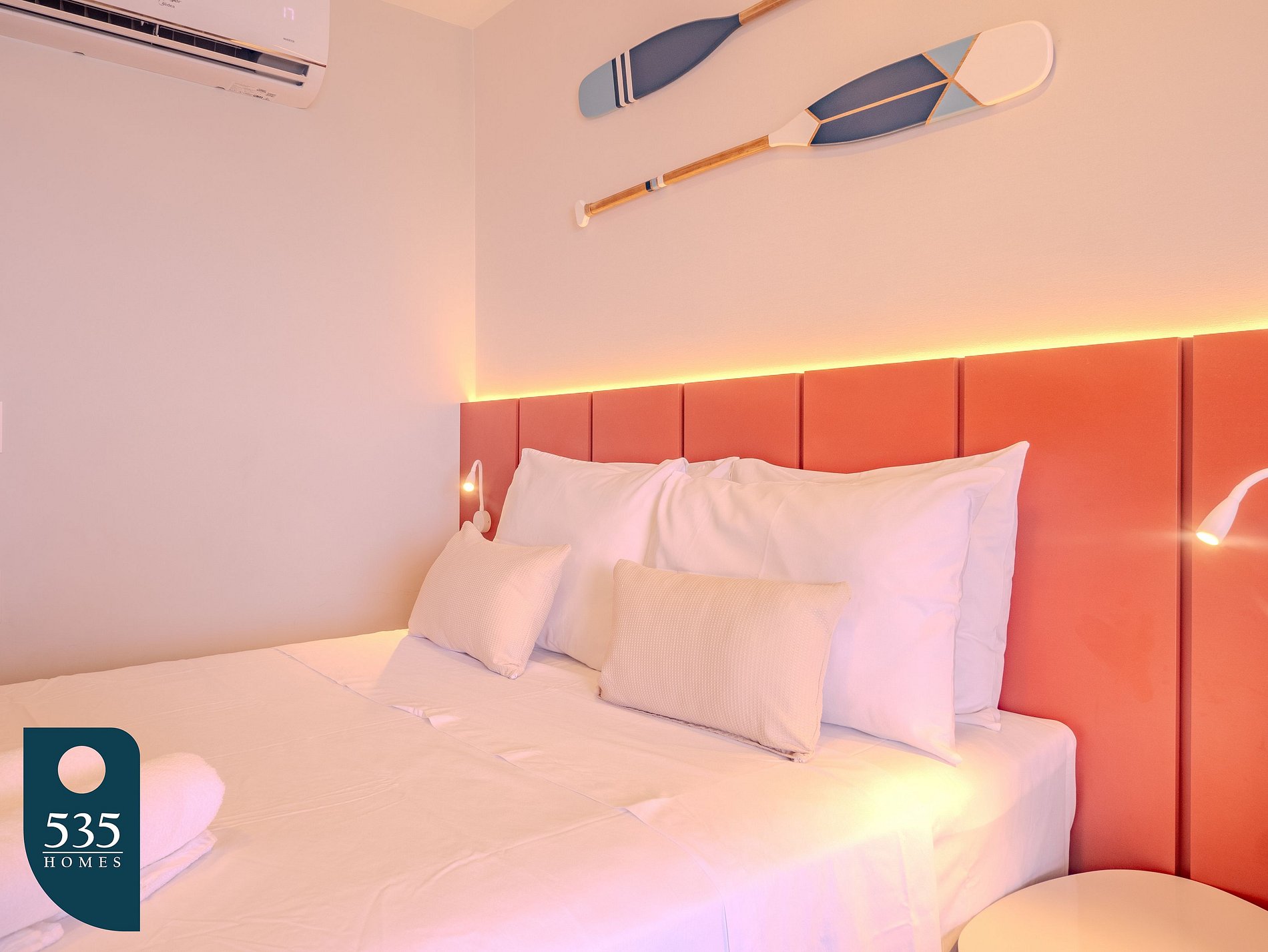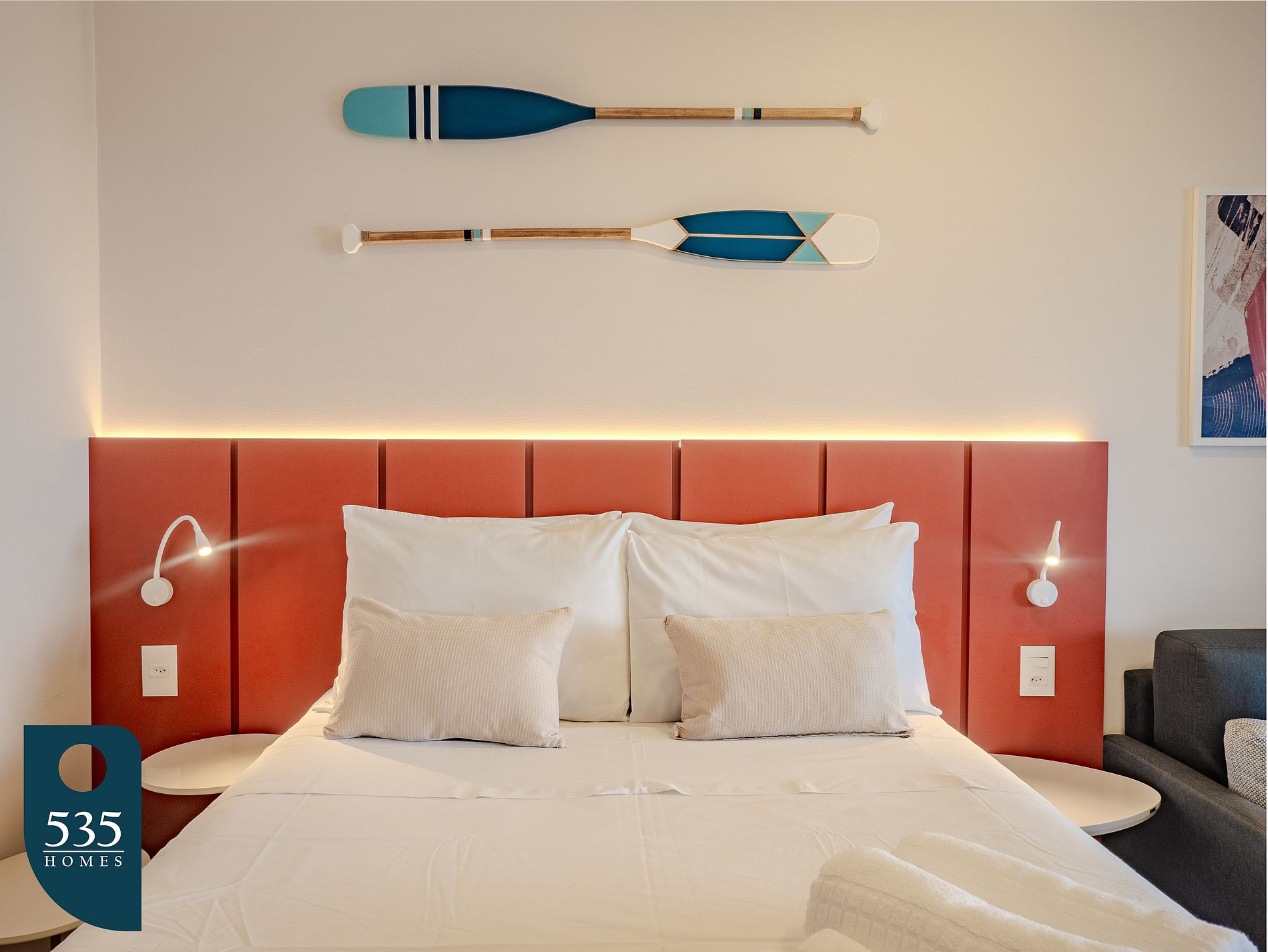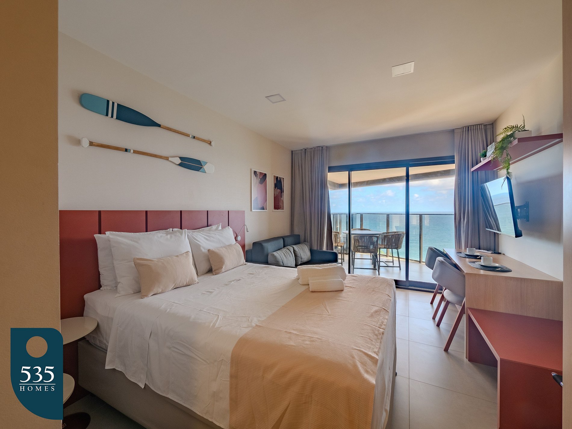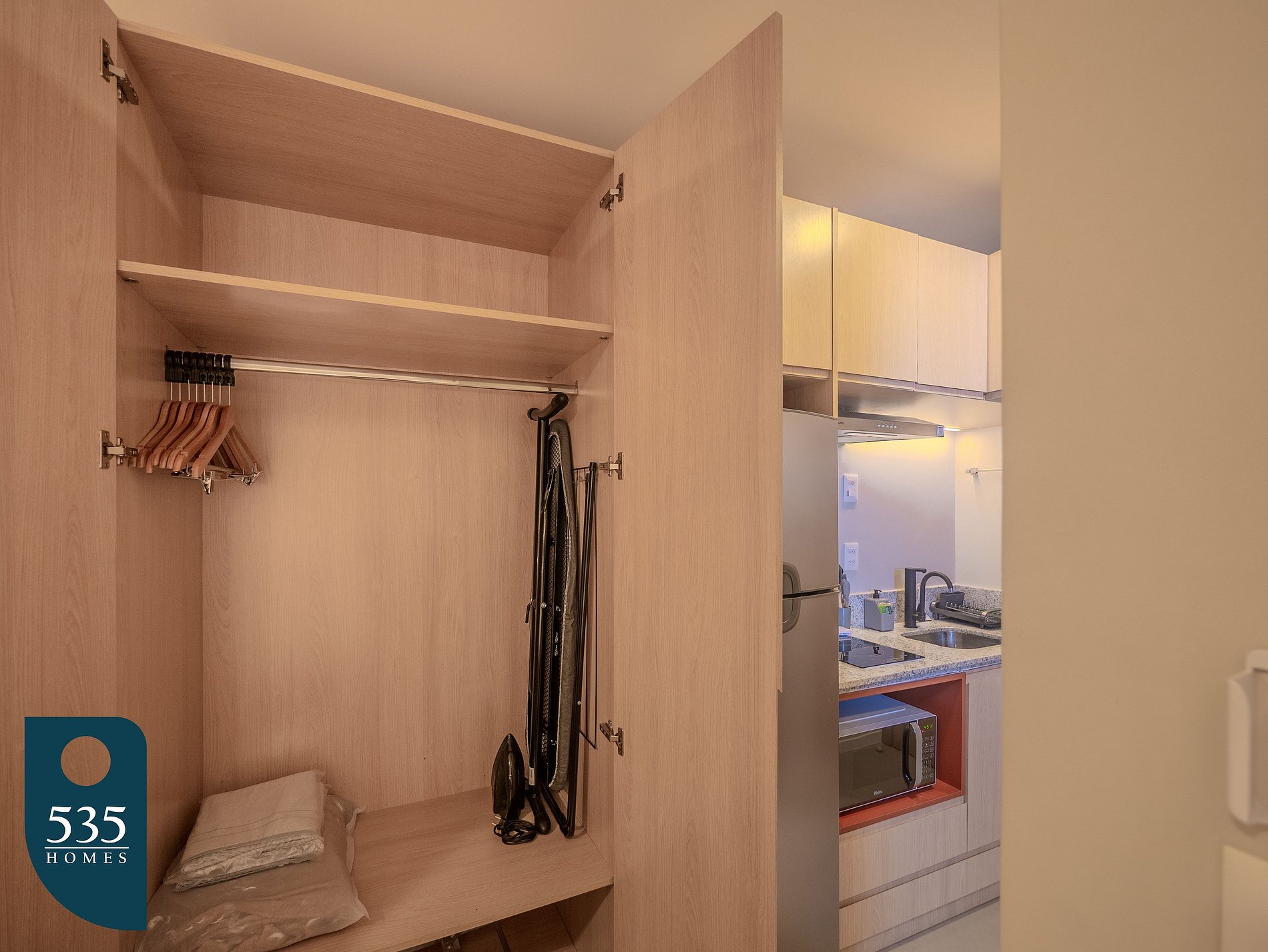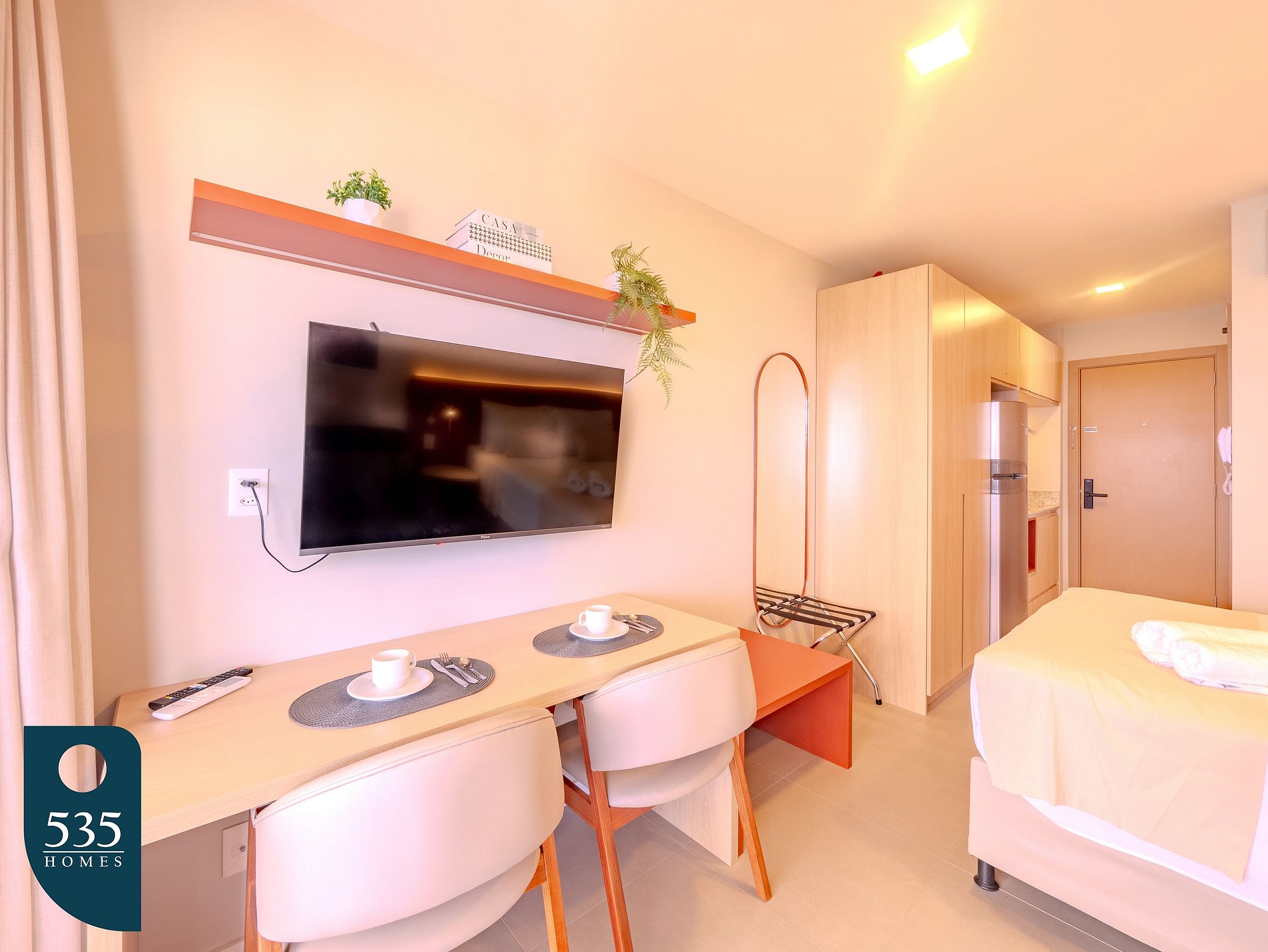 No quarto, o ambiente foi planejado para unir descanso e praticidade, contando com ar-condicionado, Smart TV de 43”, estação de trabalho, espelho de corpo inteiro, maleiro dobrável, mesa de passar roupa, ferro elétrico e cabides, oferecendo conforto tanto para momentos de relaxamento quanto para quem precisa trabalhar durante a estadia.