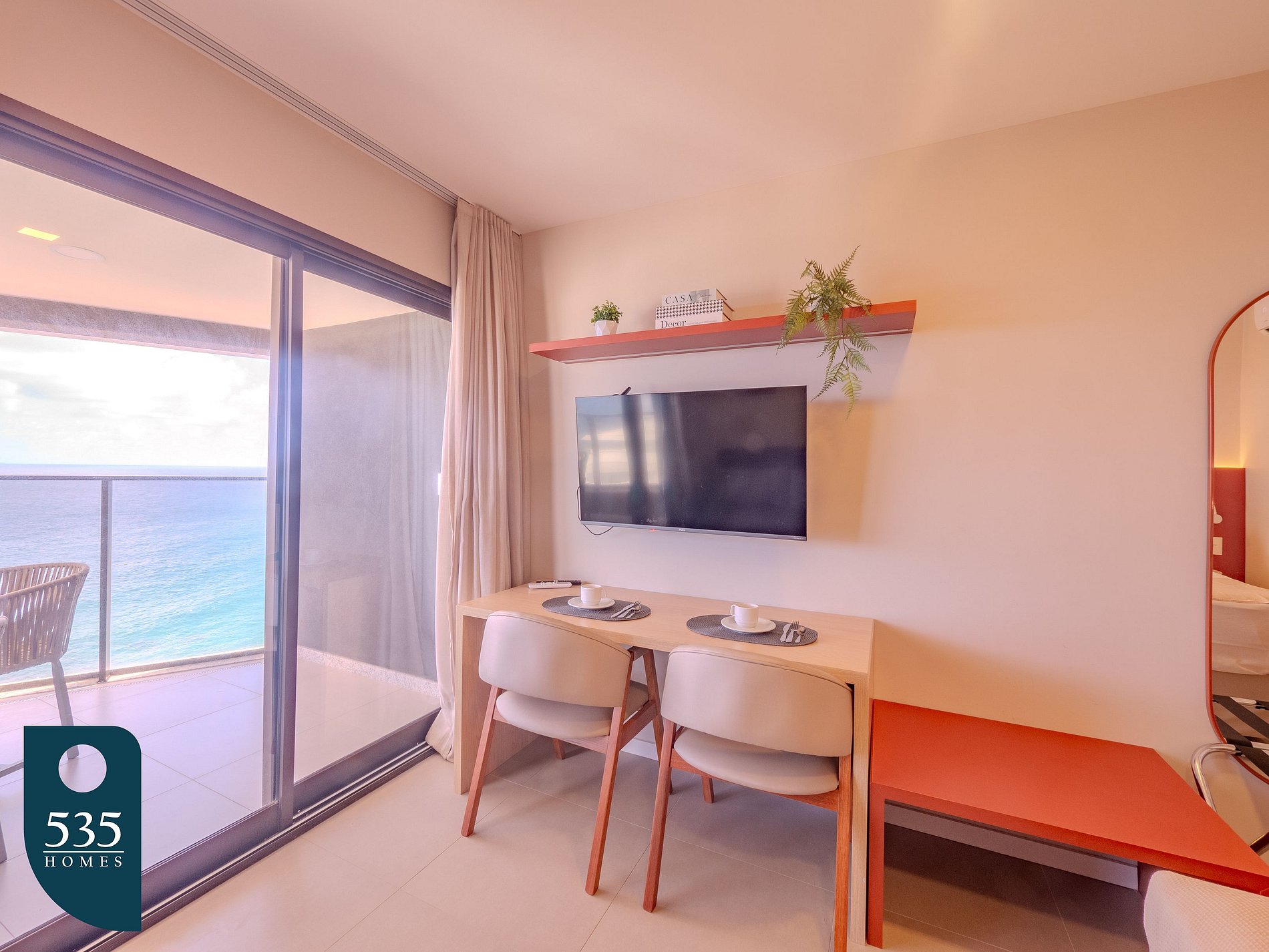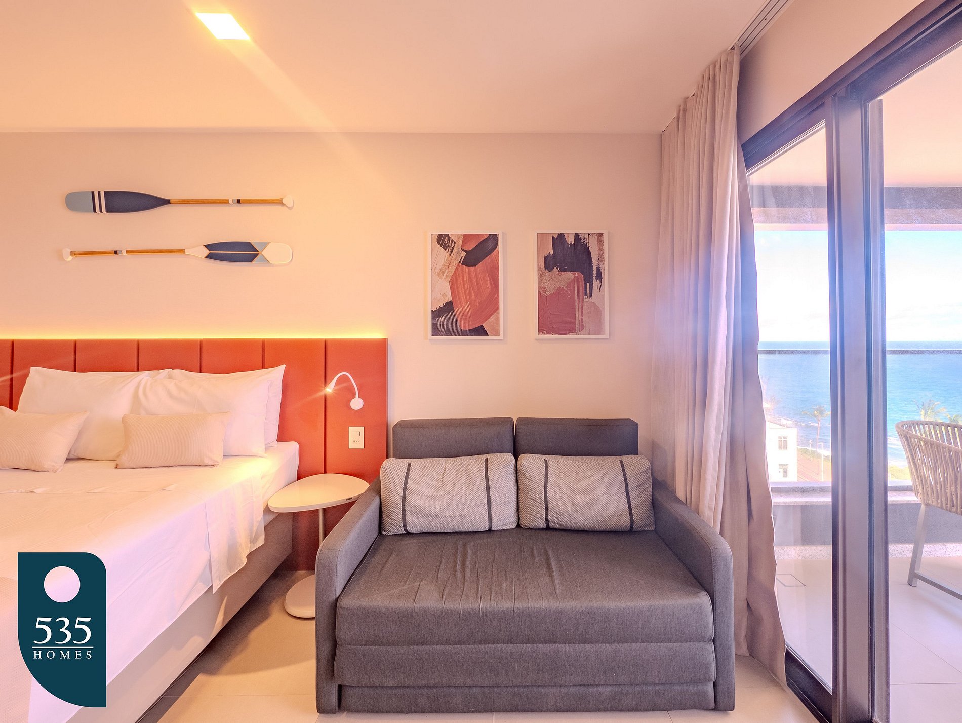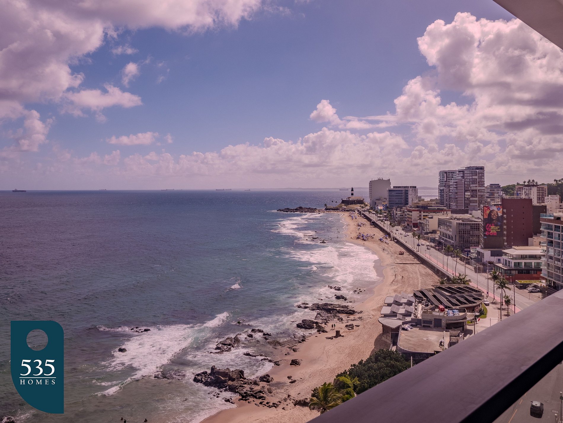 Este apartamento por temporada está localizado no bairro da Barra, em Salvador, no 10º andar, com vista para o mar e para o Morro do Cristo, um dos cenários mais emblemáticos da orla. A posição elevada proporciona uma vista aberta da paisagem, acompanhando o movimento do mar e da orla ao longo do dia.