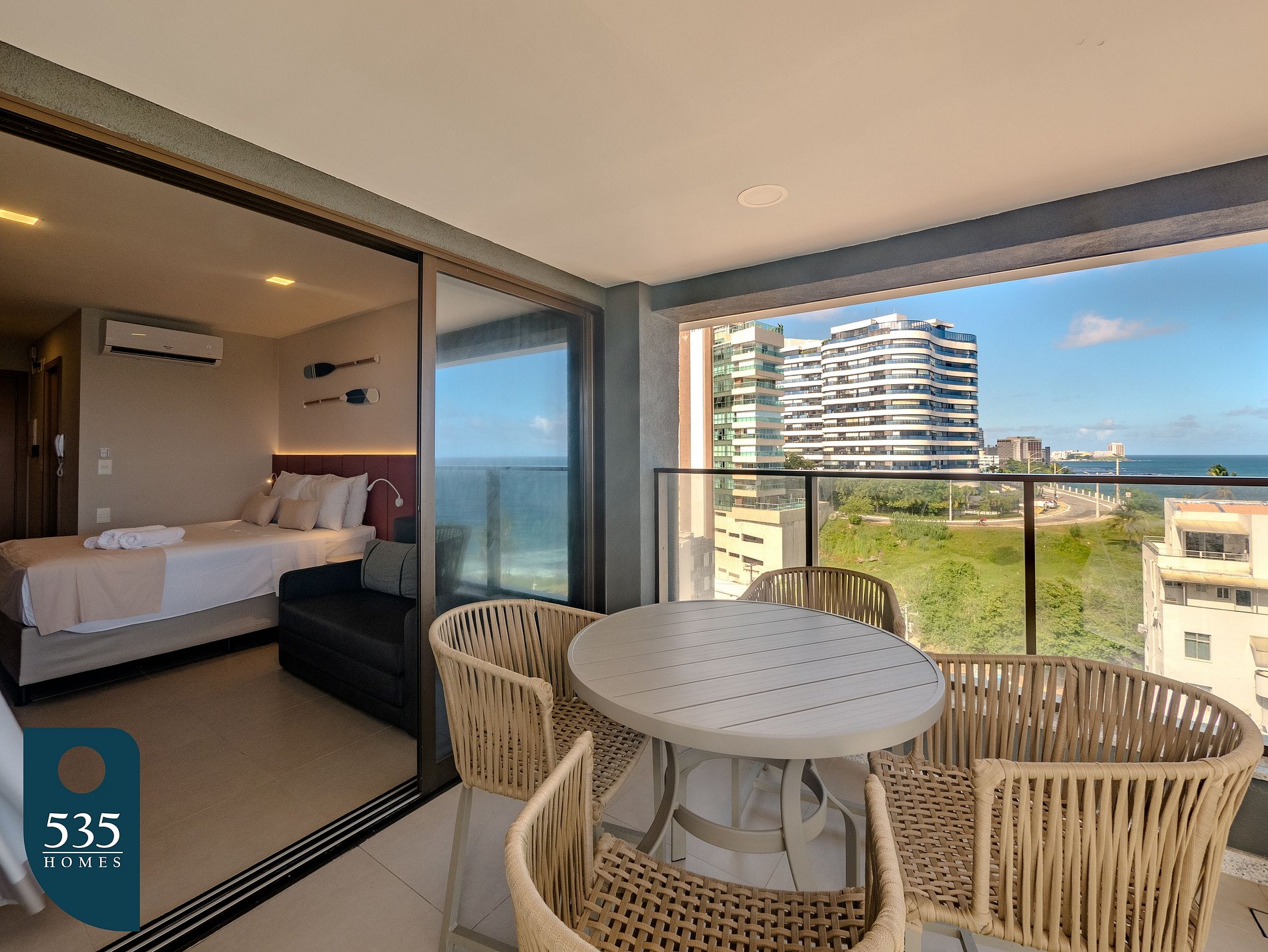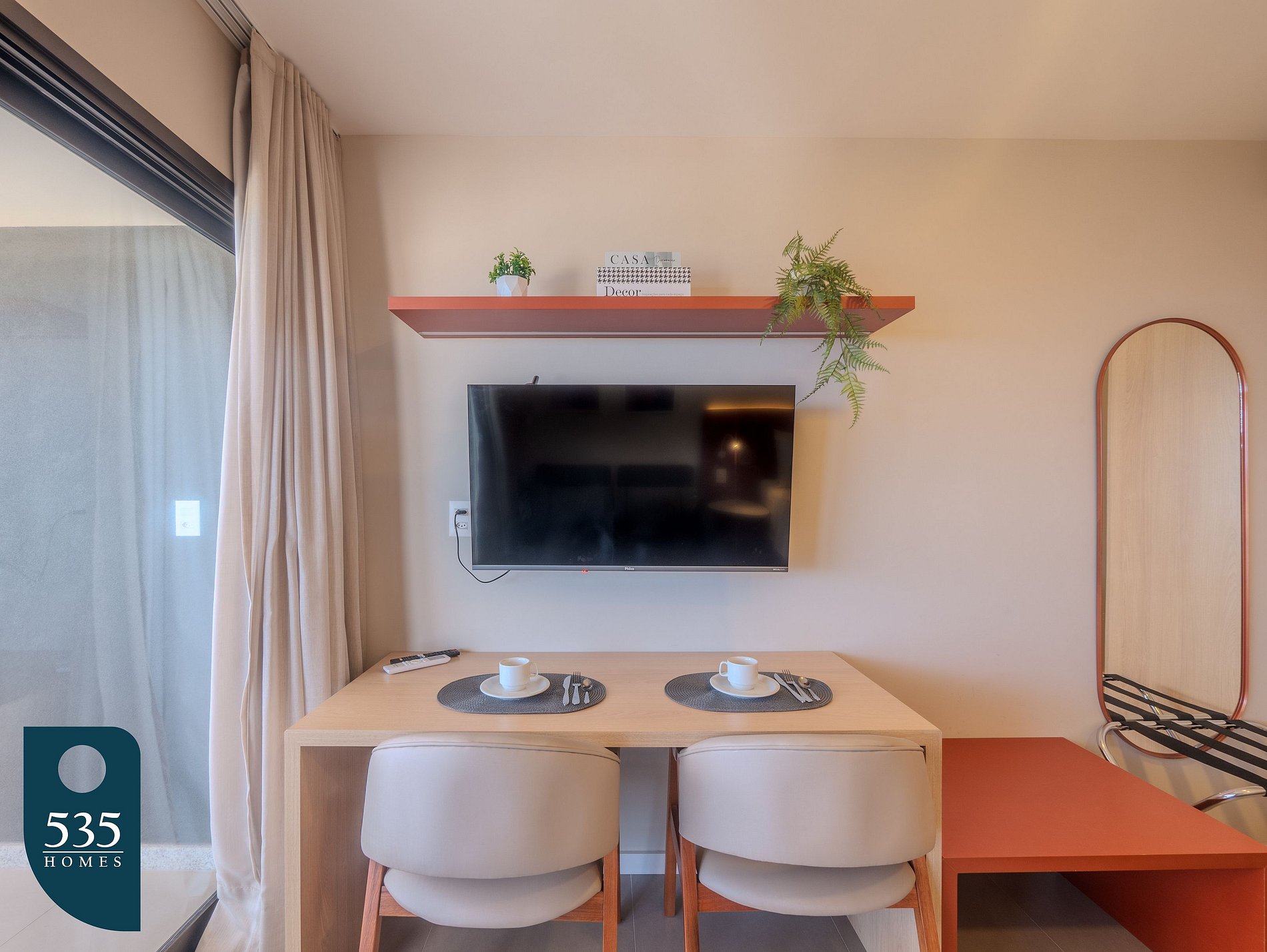 Já a varanda conta com mesa e cadeiras, criando um espaço agradável para relaxar, fazer refeições leves ou aproveitar o ambiente externo ao longo do dia.