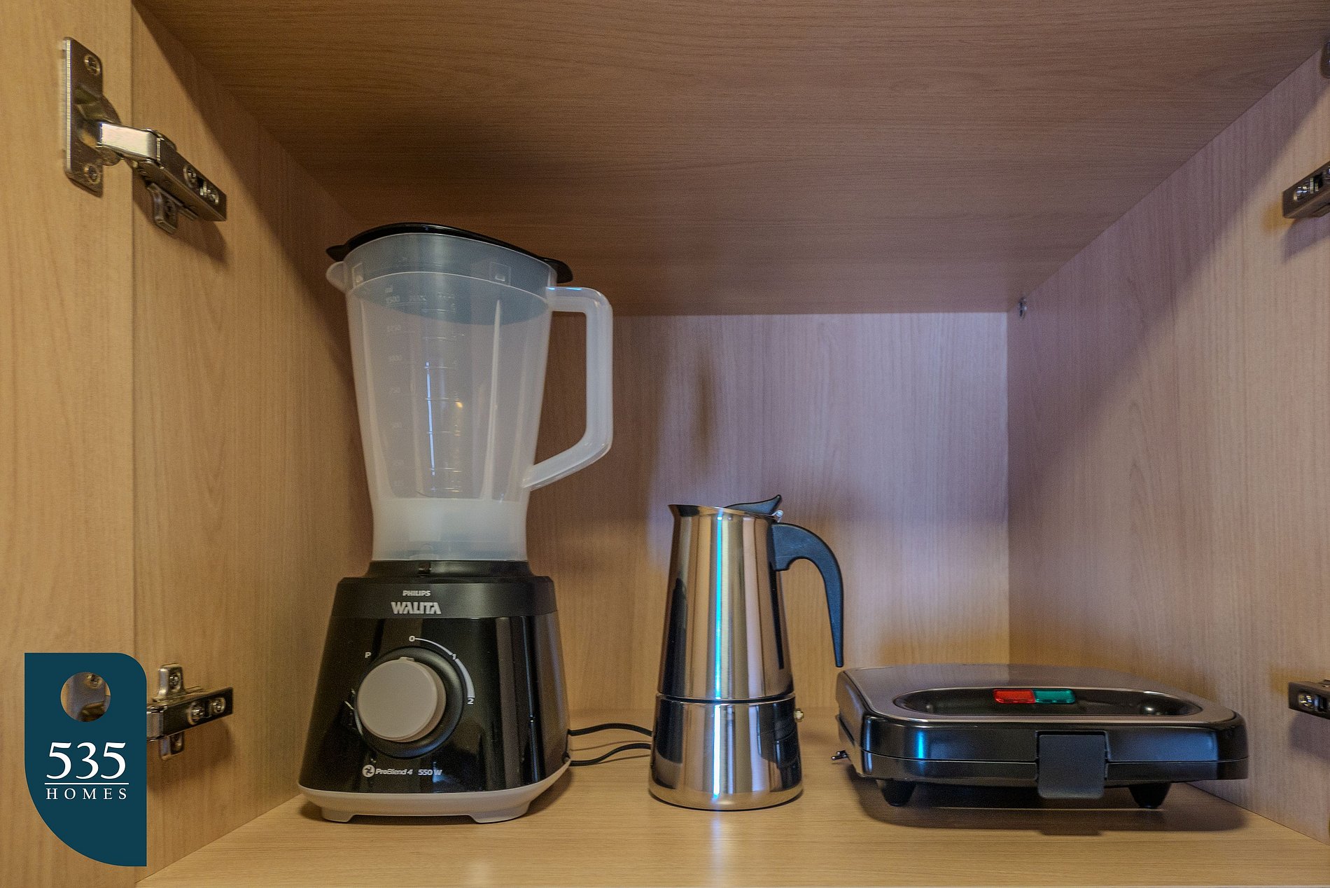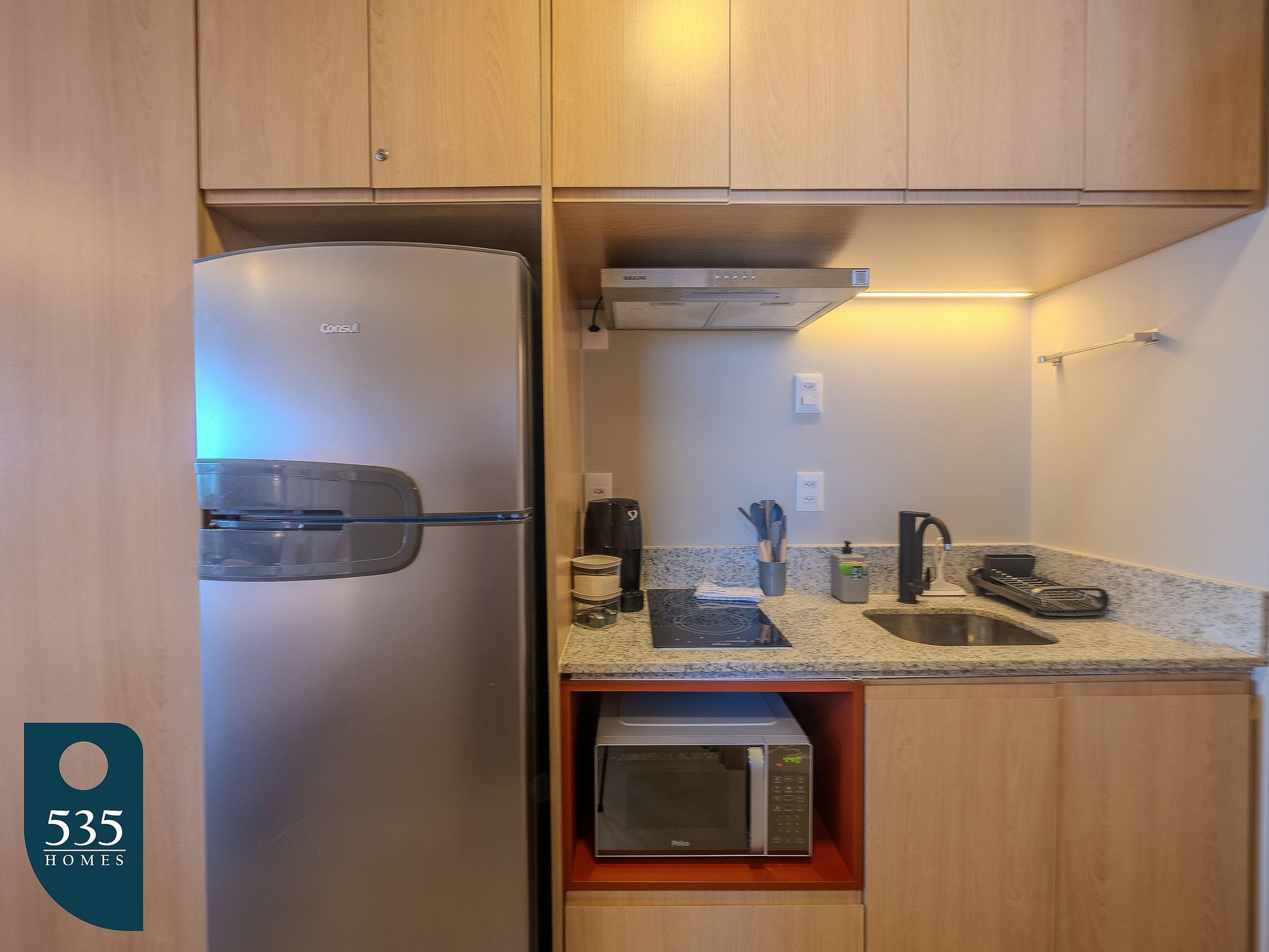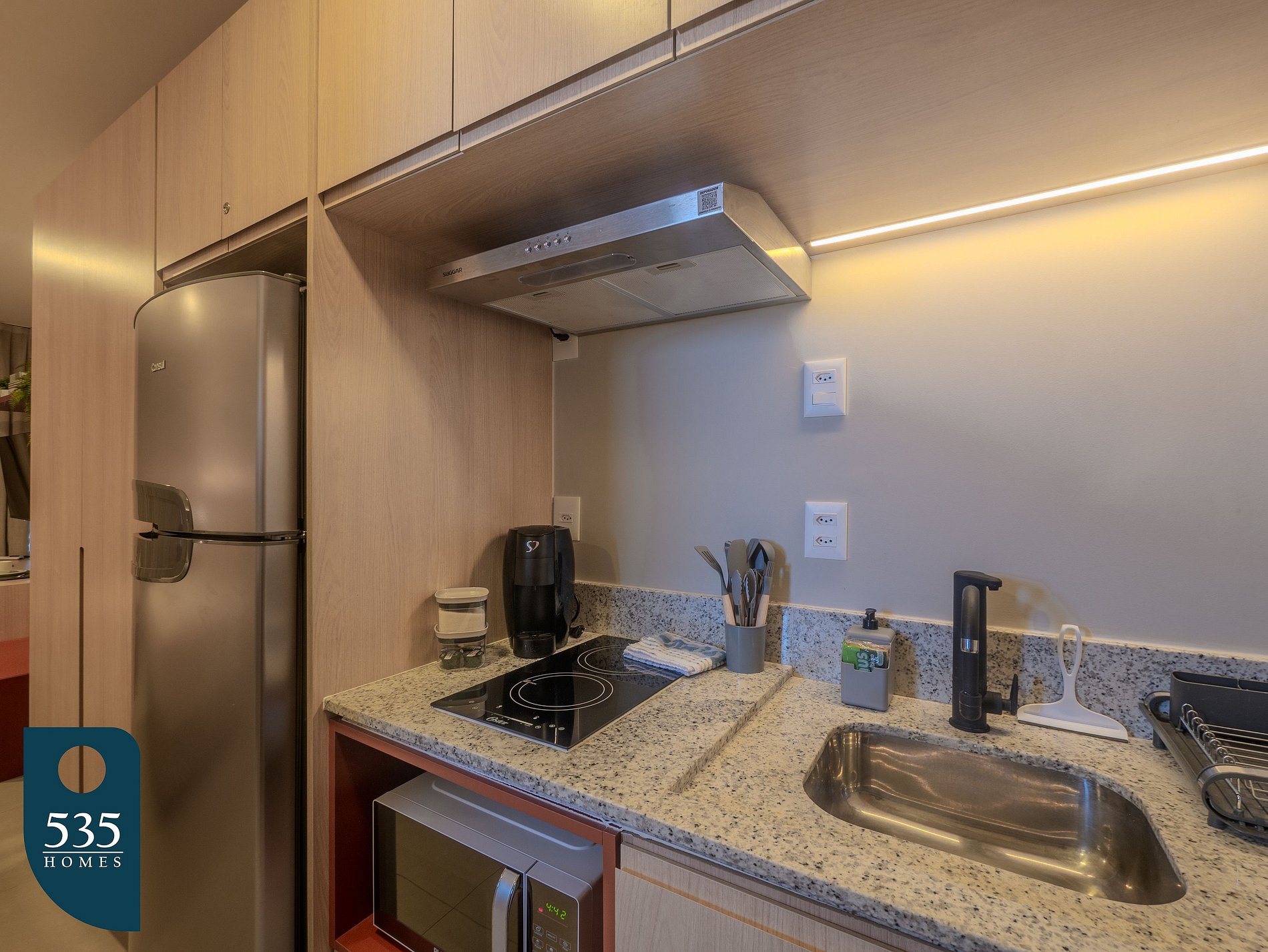 A cozinha é equipada com micro-ondas, depurador de ar, torneira com filtro de água acoplado, liquidificador, geladeira, sanduicheira, máquina de café e cafeteira italiana, além de cooktop de indução com duas bocas, permitindo preparar refeições com comodidade no dia a dia.