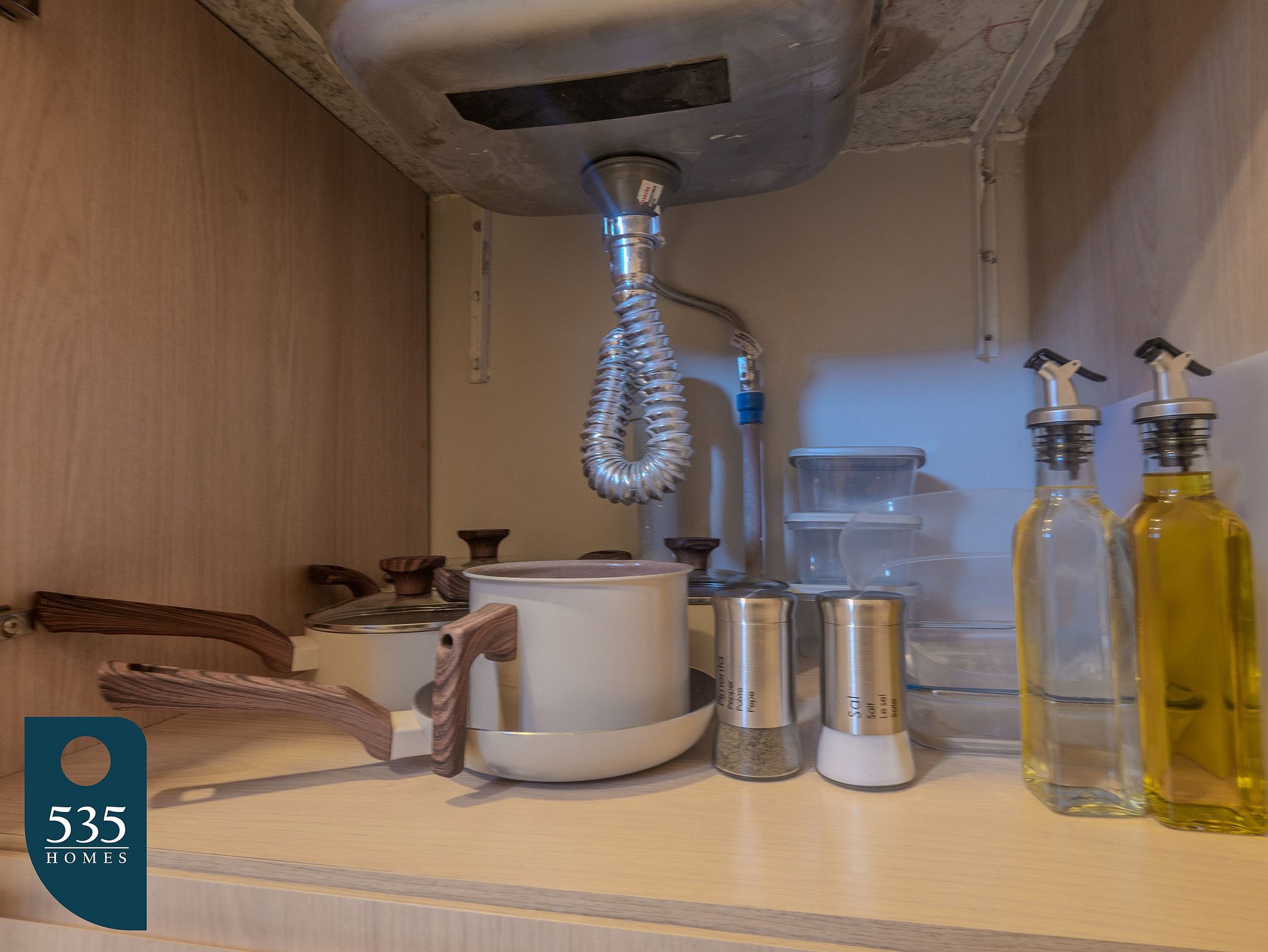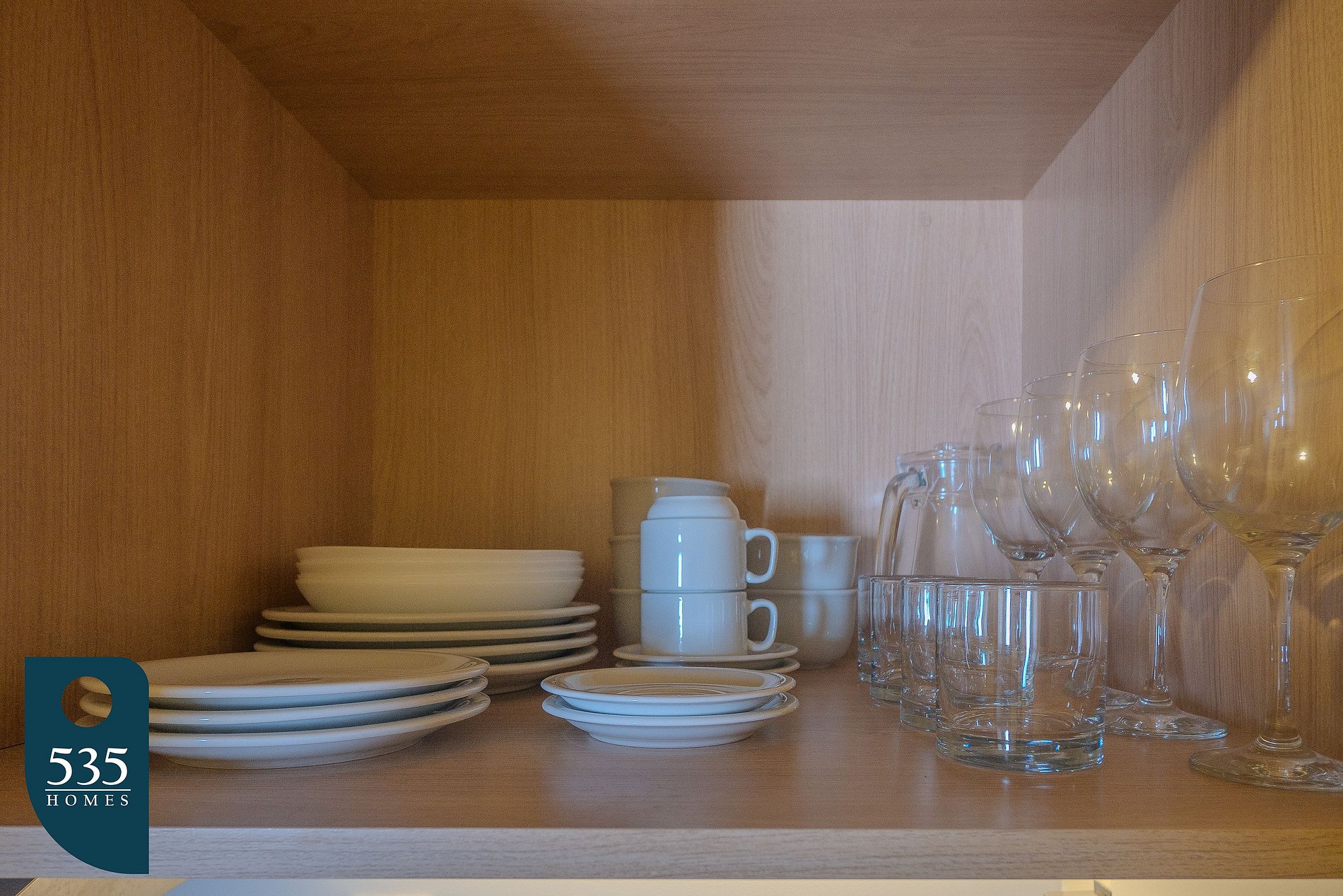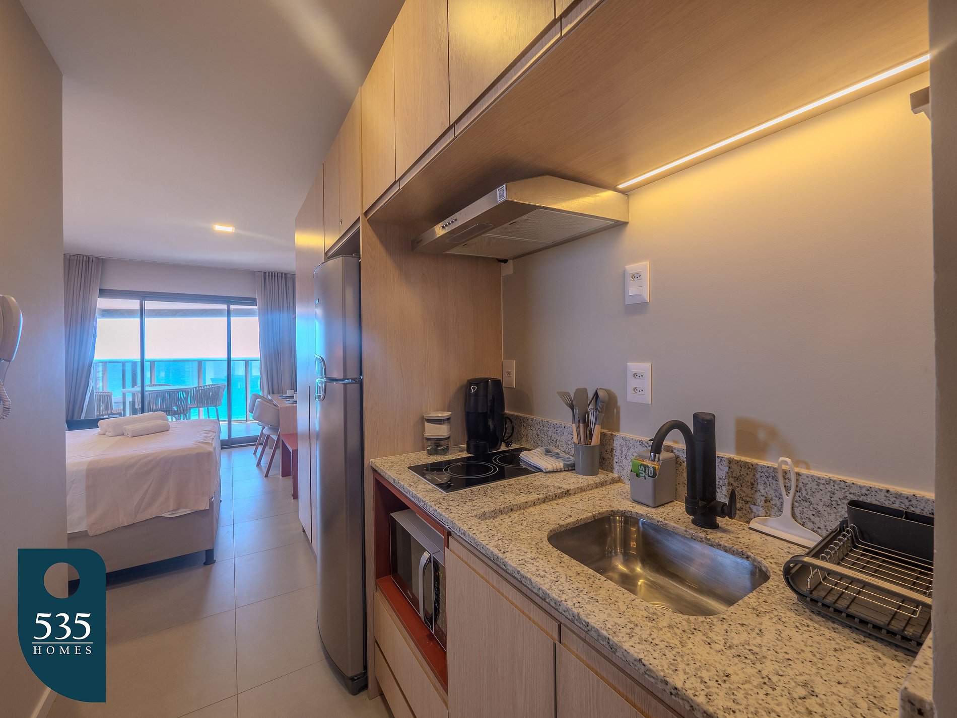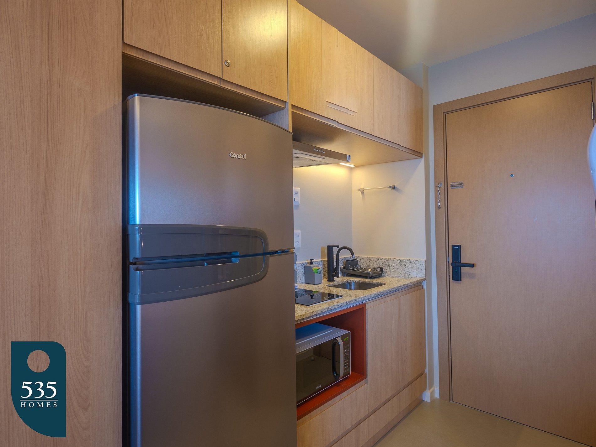 A cozinha é equipada com micro-ondas, depurador de ar, torneira com filtro de água acoplado, liquidificador, geladeira, sanduicheira, máquina de café e cafeteira italiana, além de cooktop de indução com duas bocas, permitindo preparar refeições com comodidade no dia a dia.