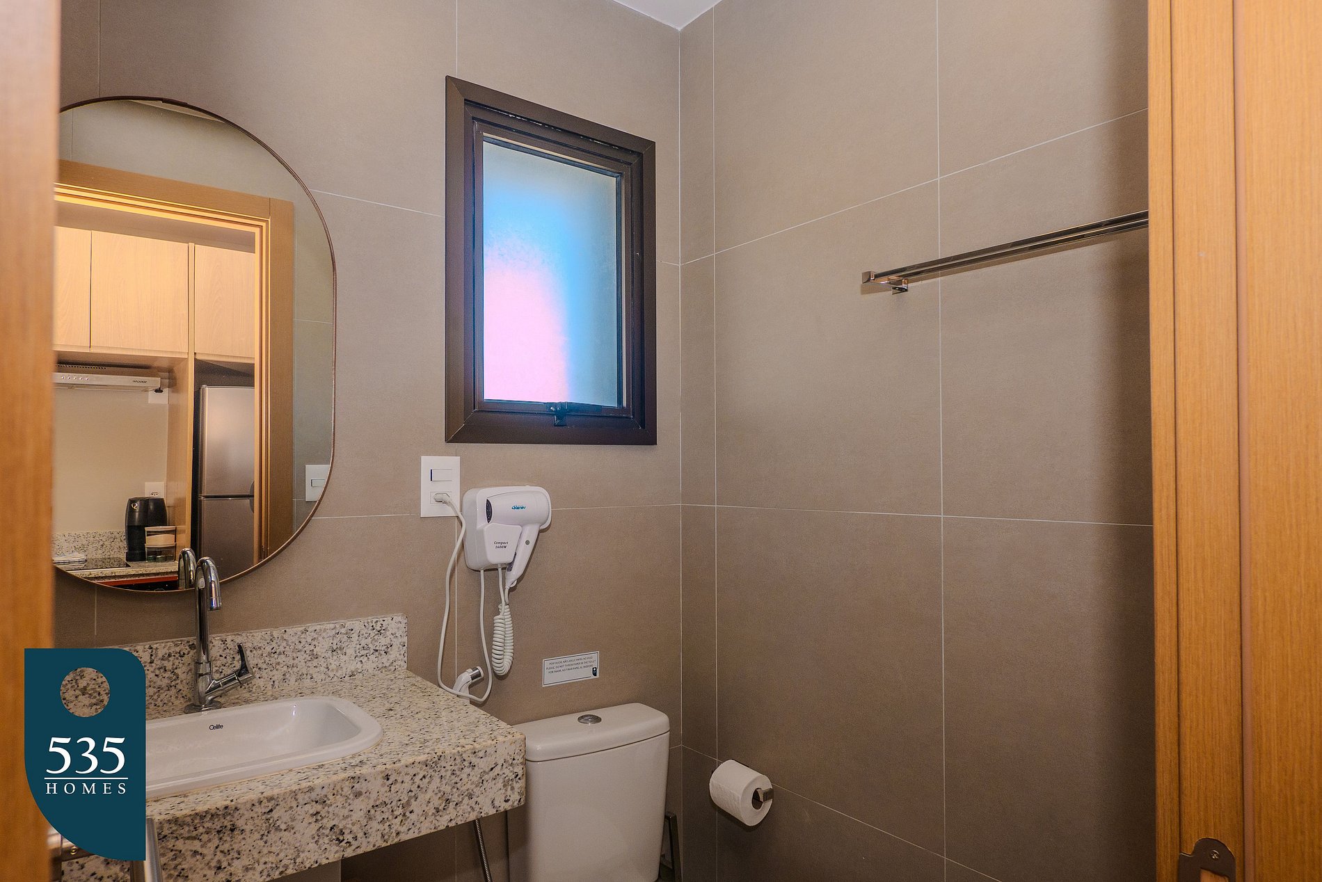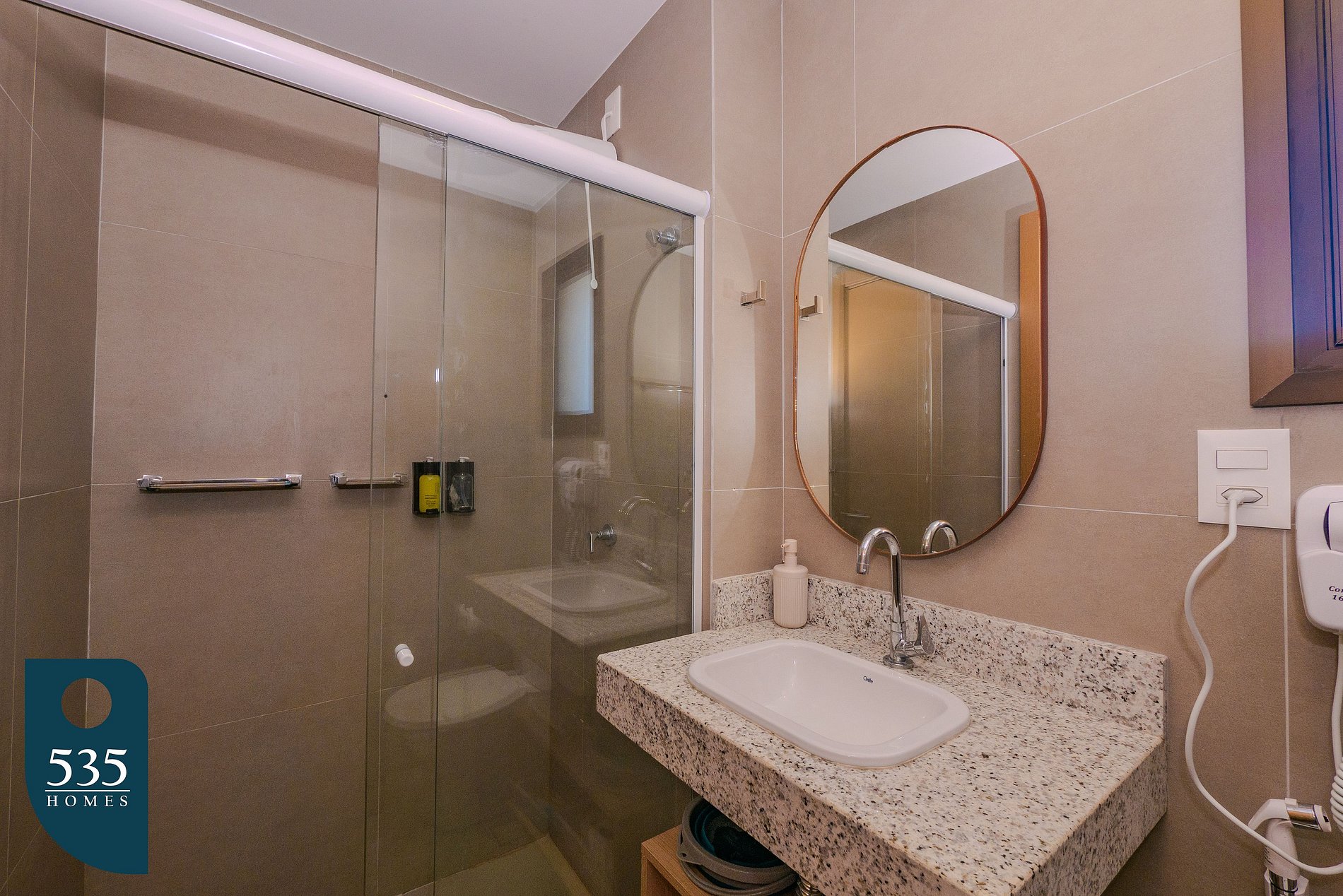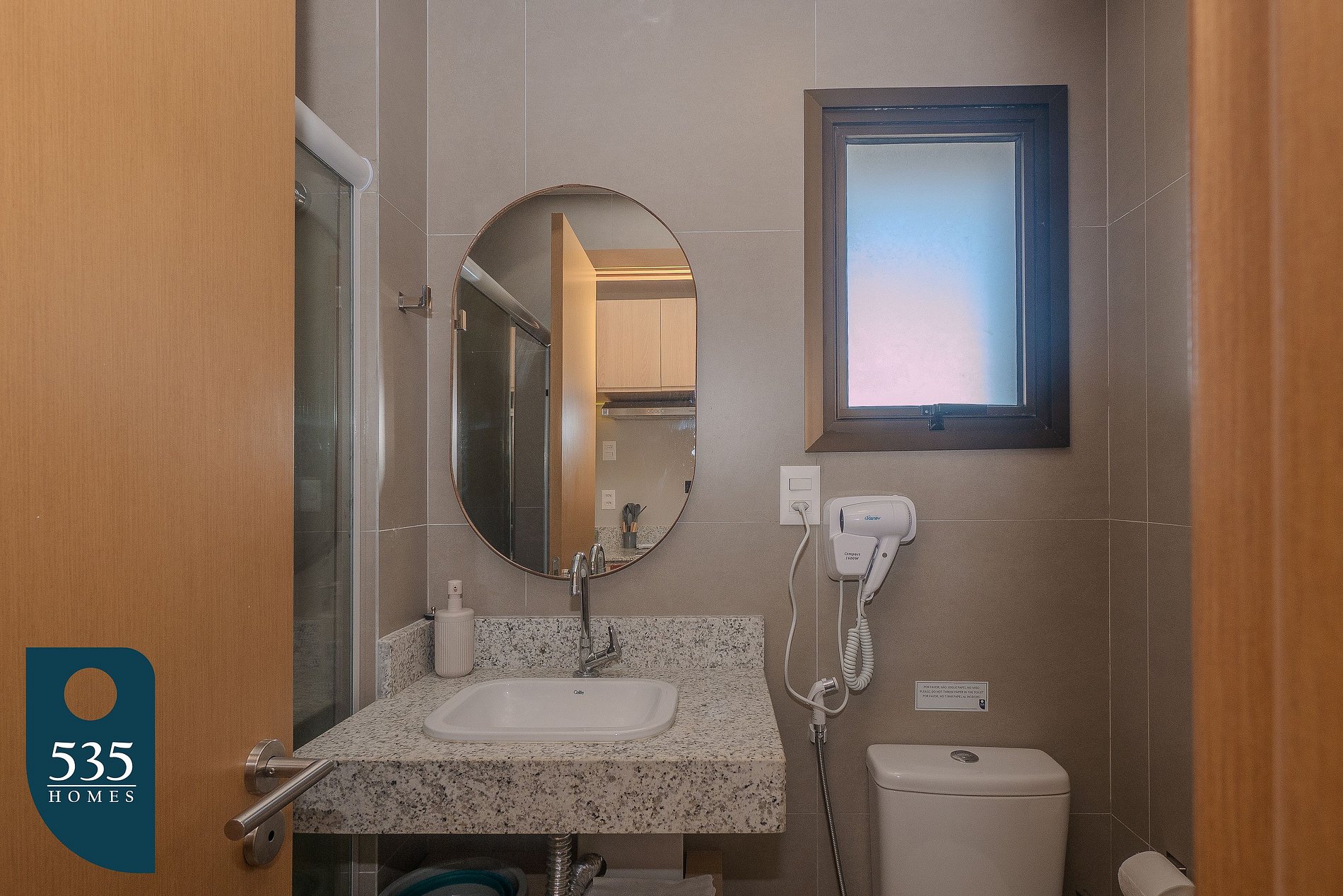O banheiro possui chuveiro elétrico, secador de cabelo, janela que favorece a ventilação natural e ducha higiênica, garantindo funcionalidade e conforto.