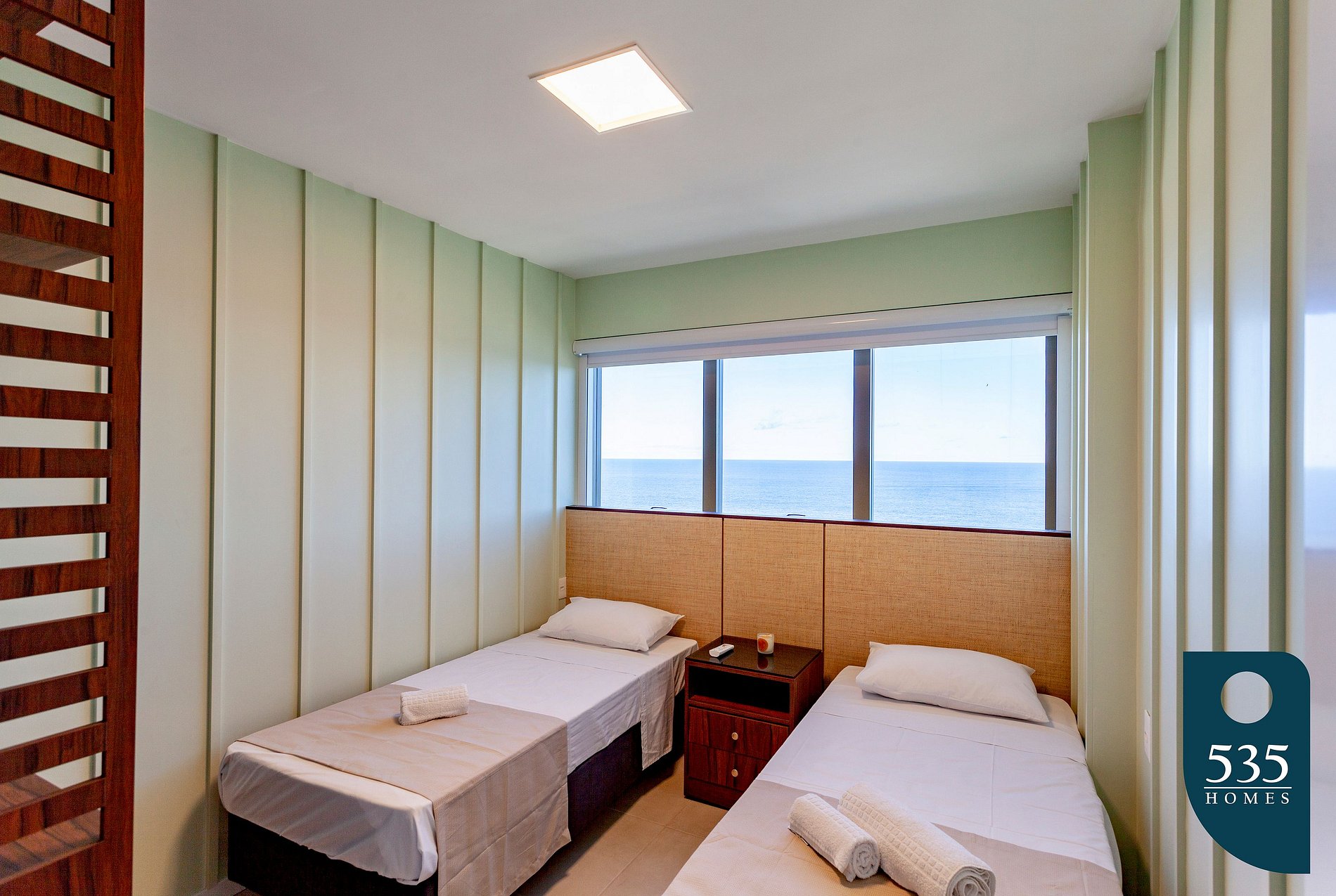 Apartamento espetacular com vista para o mar da Bahia, localizado a uma quadra da praia da Barra, andar alto.