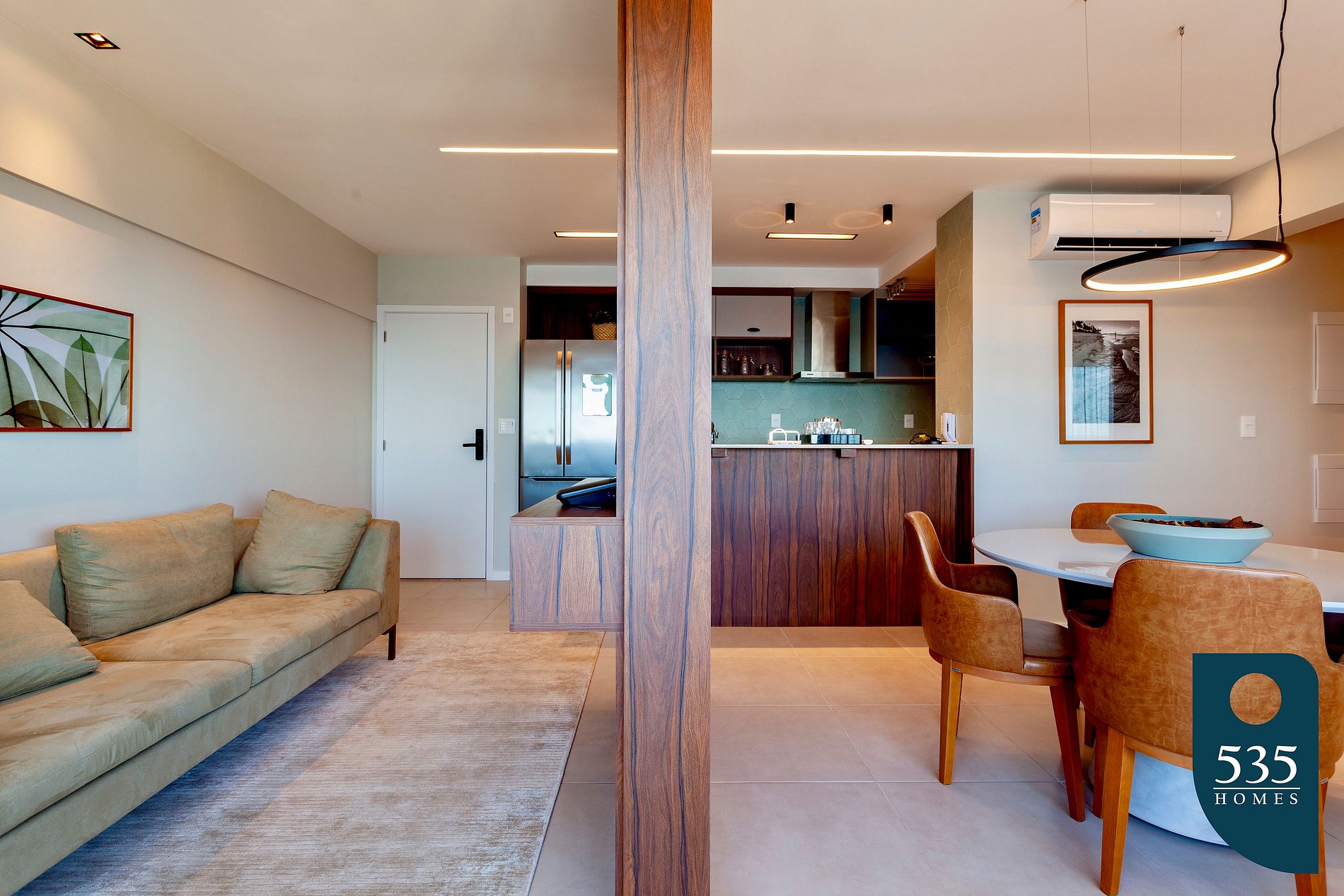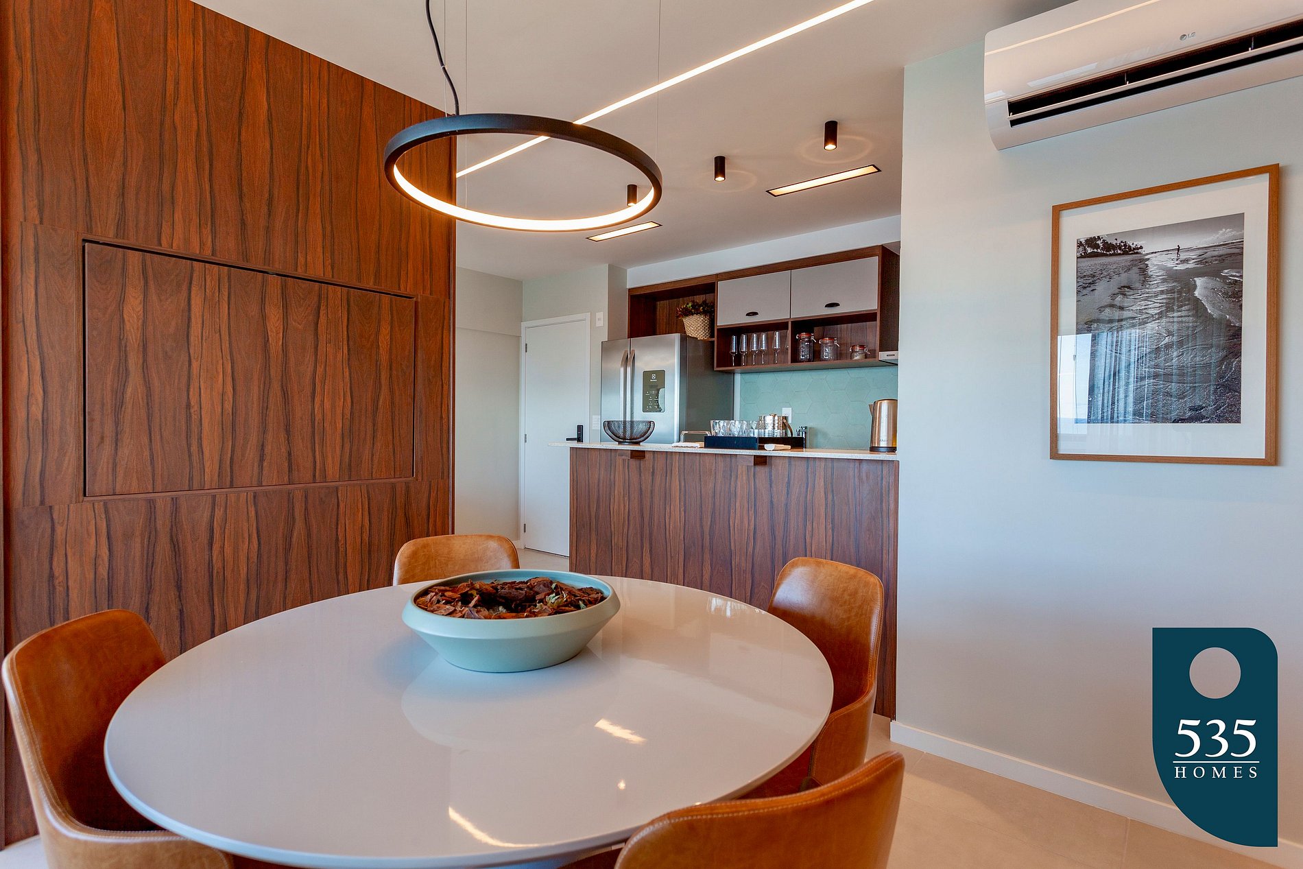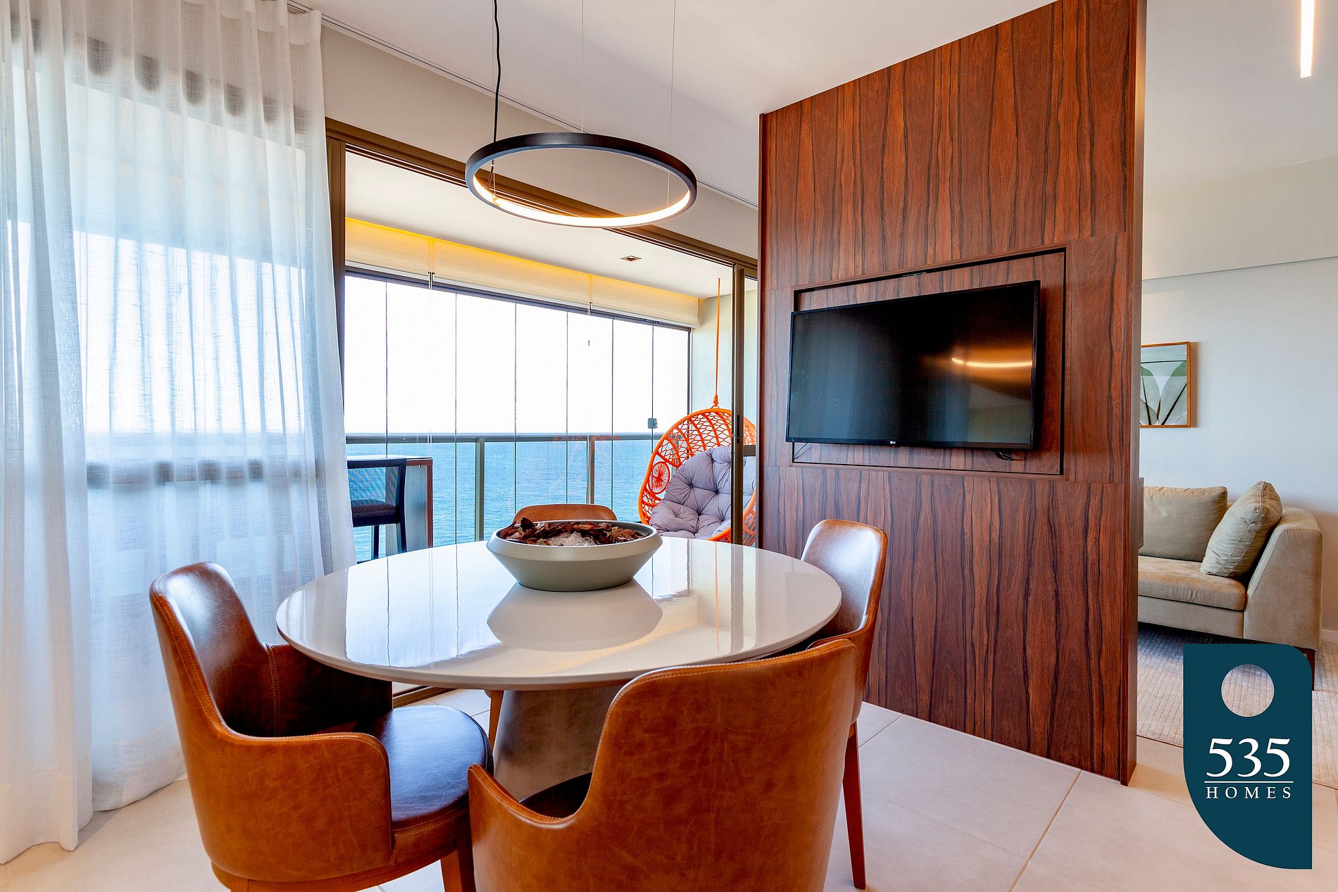 Sala muito espaçosa com TV Smart, mesa de jantar 4 lugares, sofá confortável para assistir um filme, máquina de café Dolce Gusto, e estação de trabalho para tomar aquele drink ou trabalhar remoto com vista para o mar.