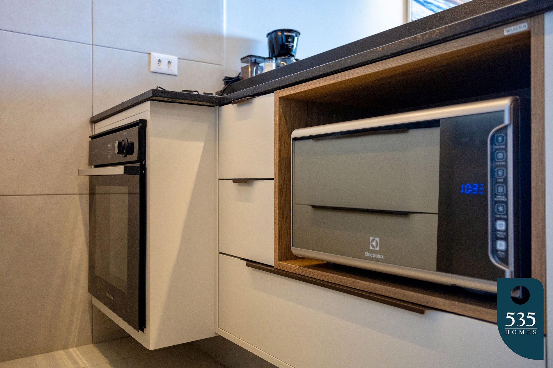 A cozinha é completa e inclui todos os eletrodomésticos essenciais: geladeira, cooktop, microondas e uma mesa para suas refeições. Além disso, você terá à disposição uma máquina lava e seca, ideal para cuidar das suas roupas durante a estadia, assim como uma tábua e ferro de passar.
