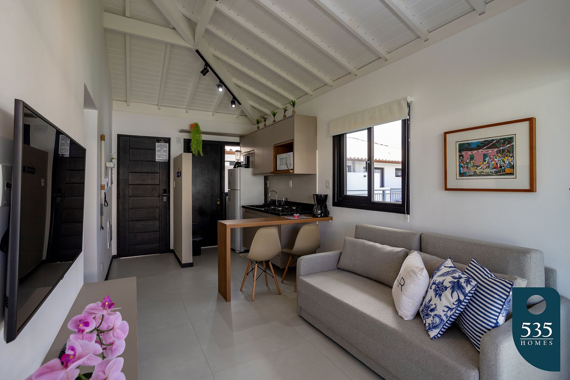 A cozinha é totalmente equipada com uma geladeira, microondas, sanduicheira, liquidificador e um cooktop de 4 bocas, permitindo que você prepare suas refeições favoritas com facilidade. Além disso, há uma bancada com duas cadeiras, ideal para refeições rápidas ou momentos de descontração.