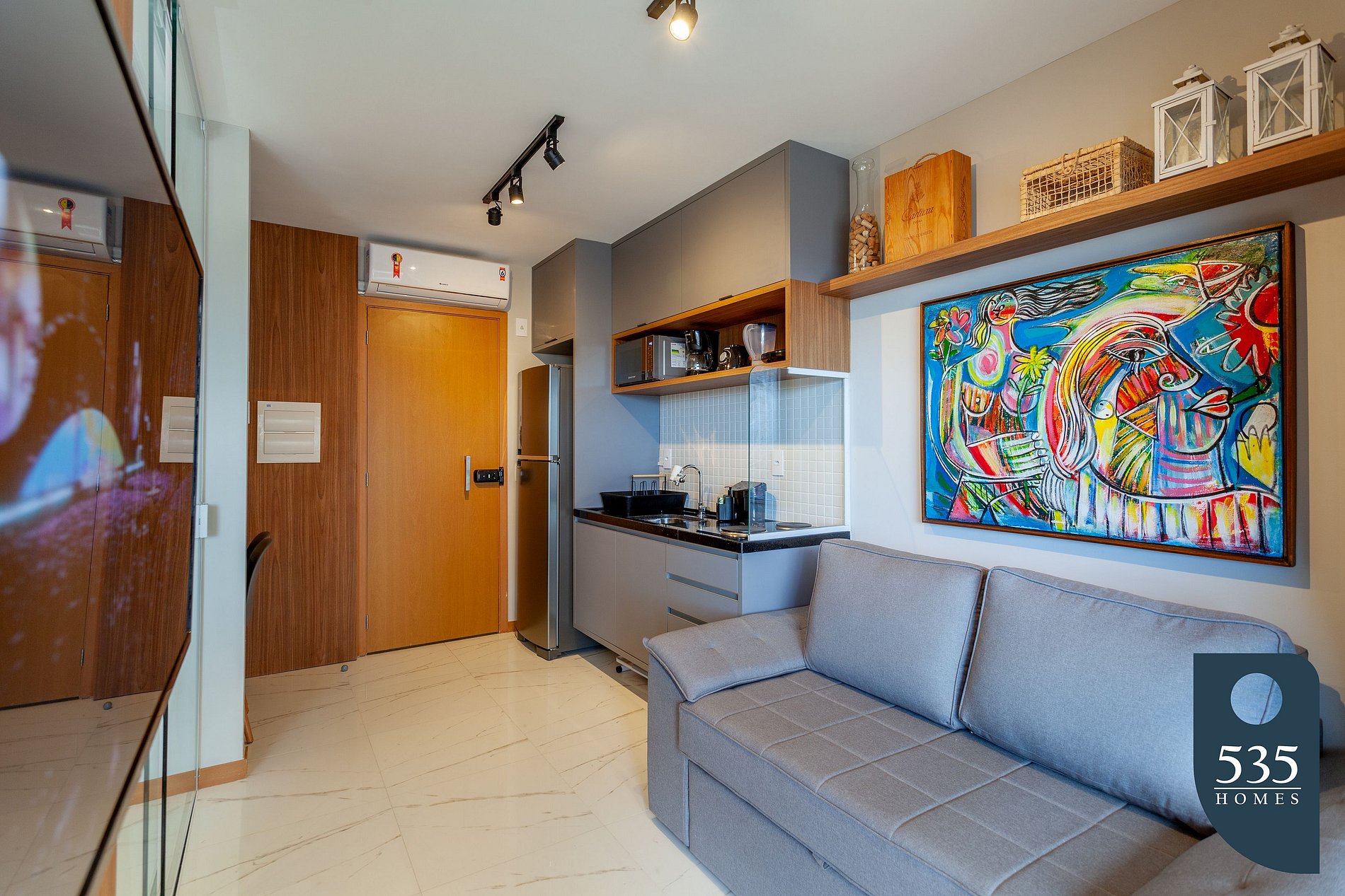 Apartamento incrível com linda varanda e vista parcial do mar, super decorado com sofá cama muito confortável para assistir um filme, quarto com cama Queen e ar condicionado Split. Varanda com mesa bistrô para tomar aquele café da manhã. Nossa cozinha é equipada com todos os utensílios necessários.