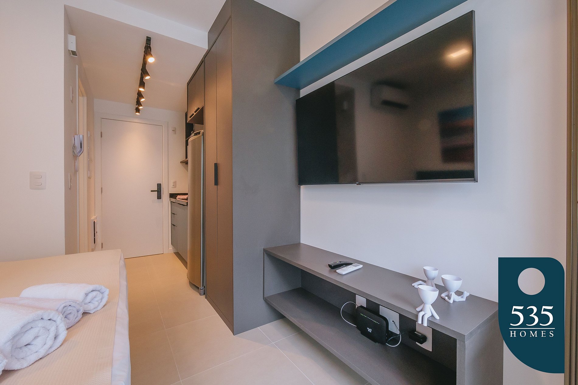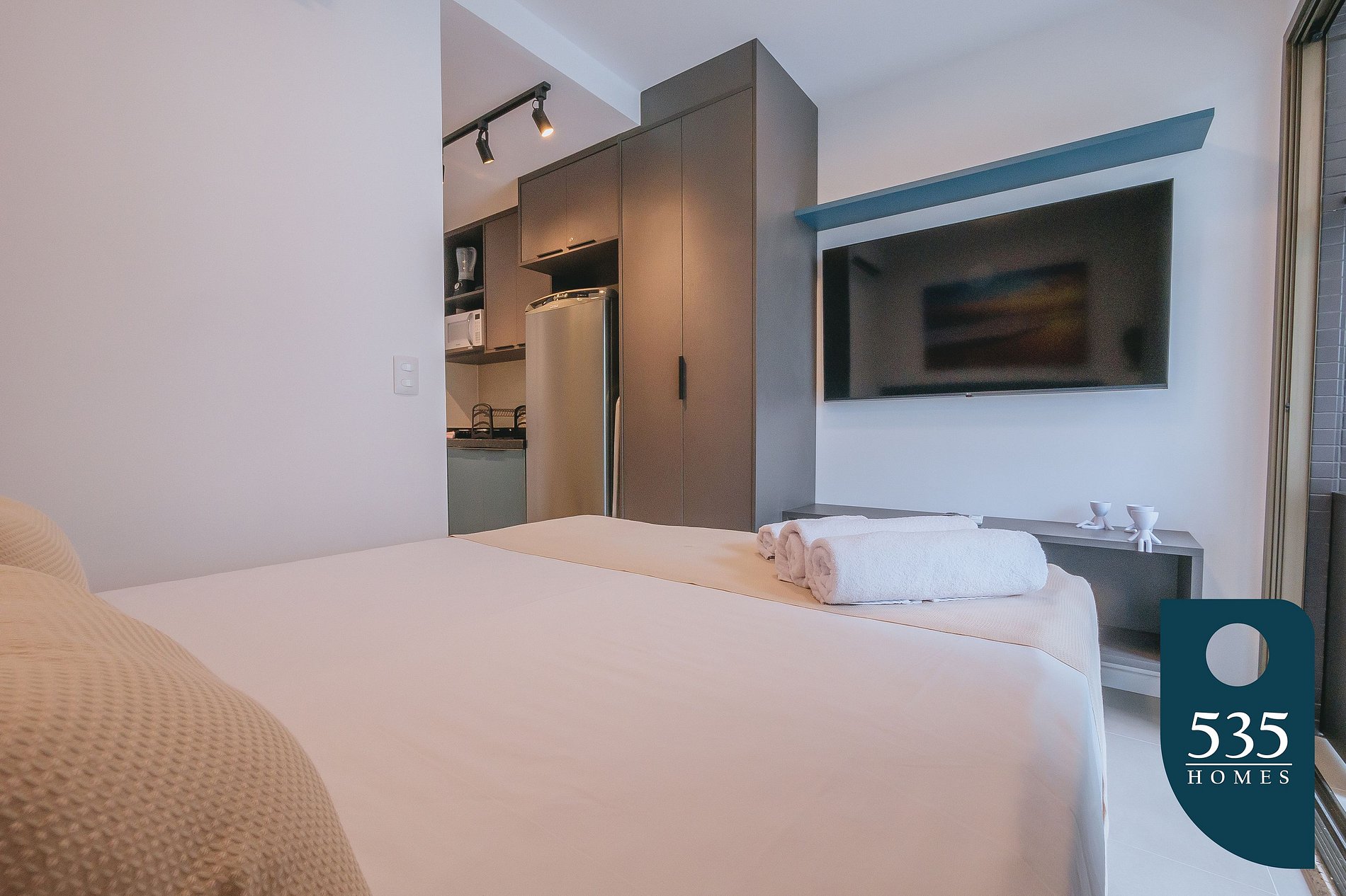 O estúdio oferece uma cama de casal confortável e uma Smart TV de 55 polegadas, além de uma ampla varanda, perfeita para momentos de relaxamento ao ar livre.