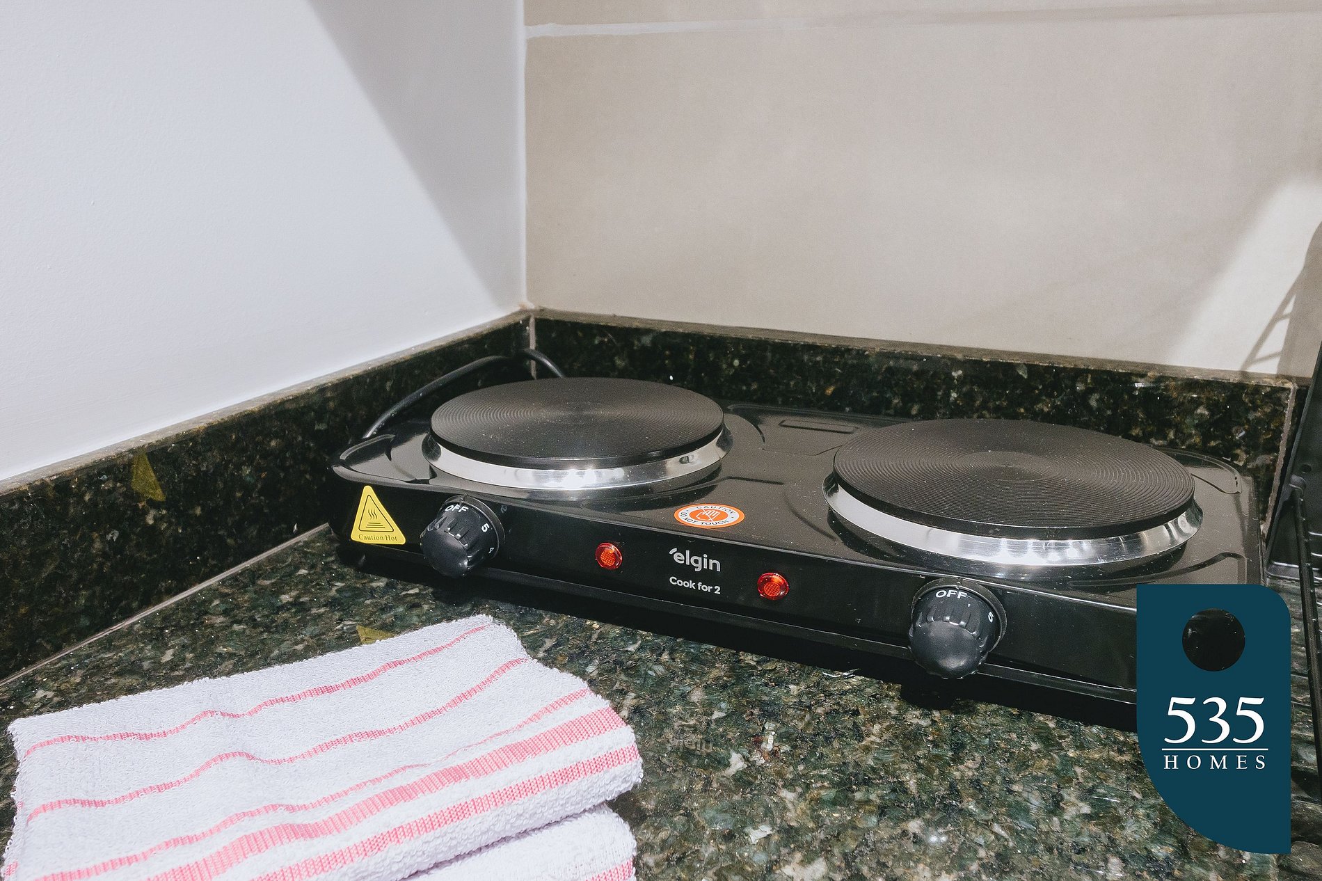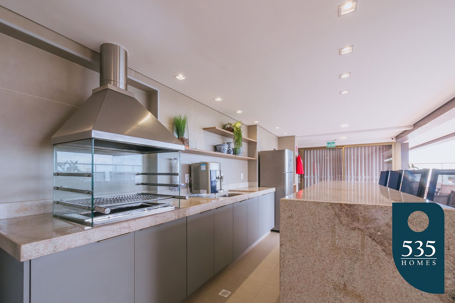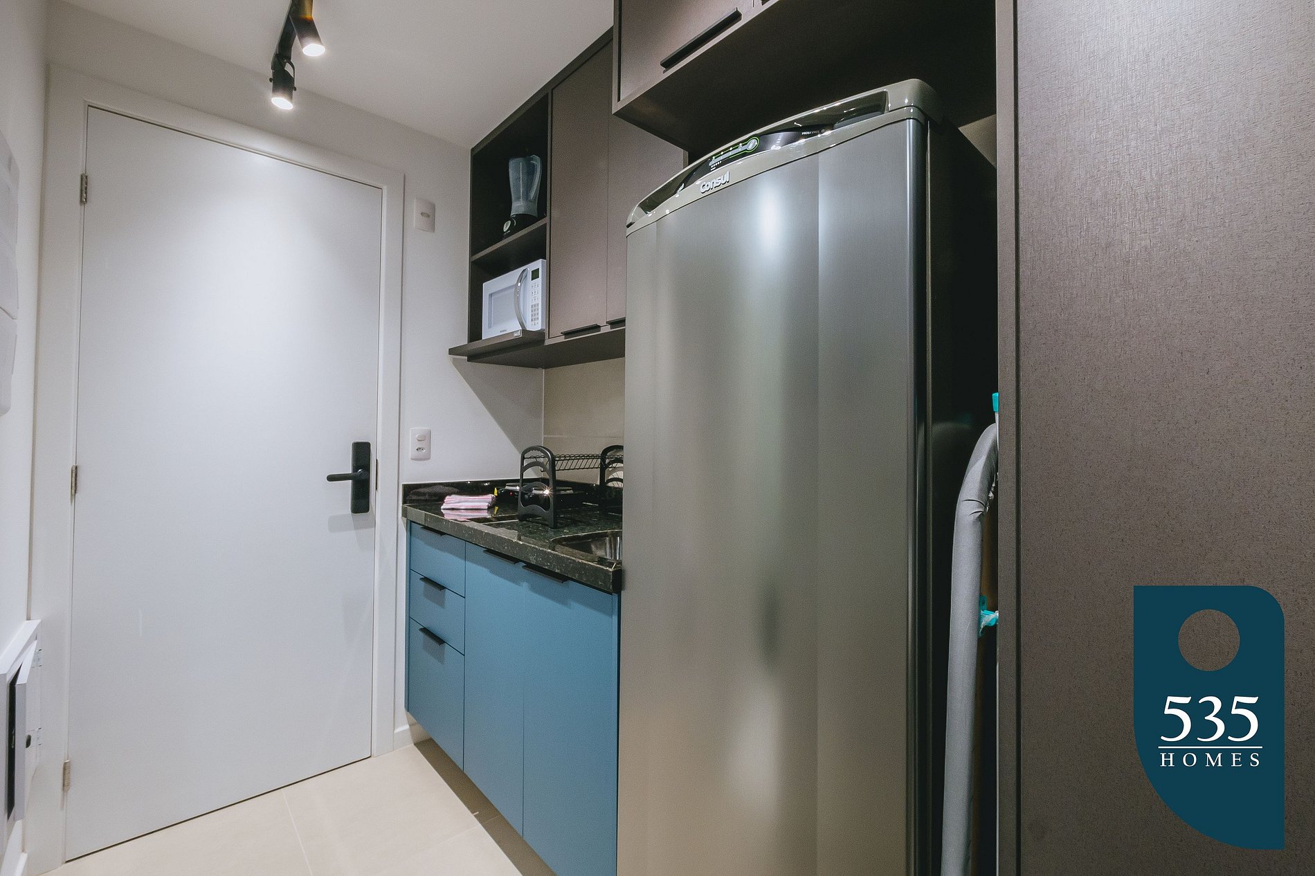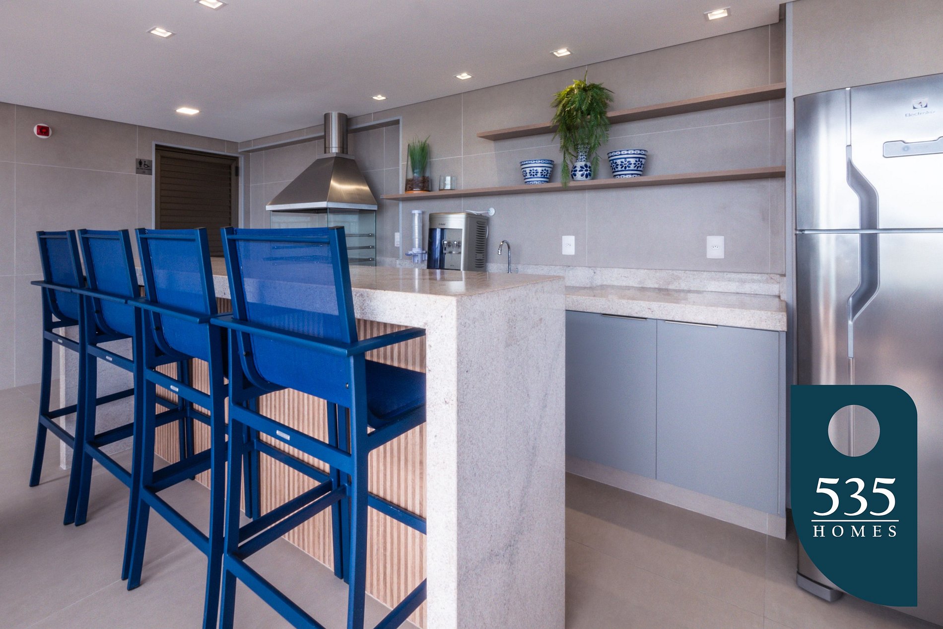 A cozinha está equipada com eletrodomésticos modernos, incluindo geladeira, cooktop, micro-ondas, sanduicheira e liquidificador, garantindo praticidade para o preparo das suas refeições.