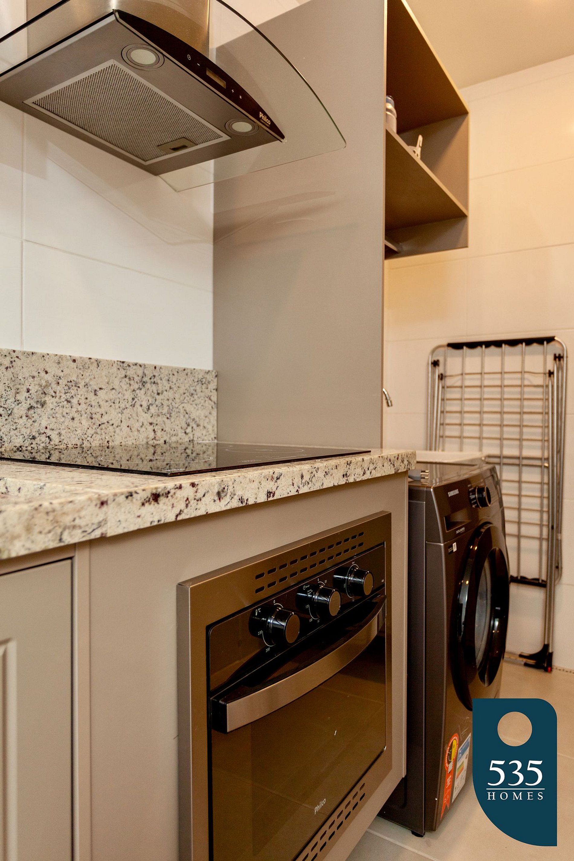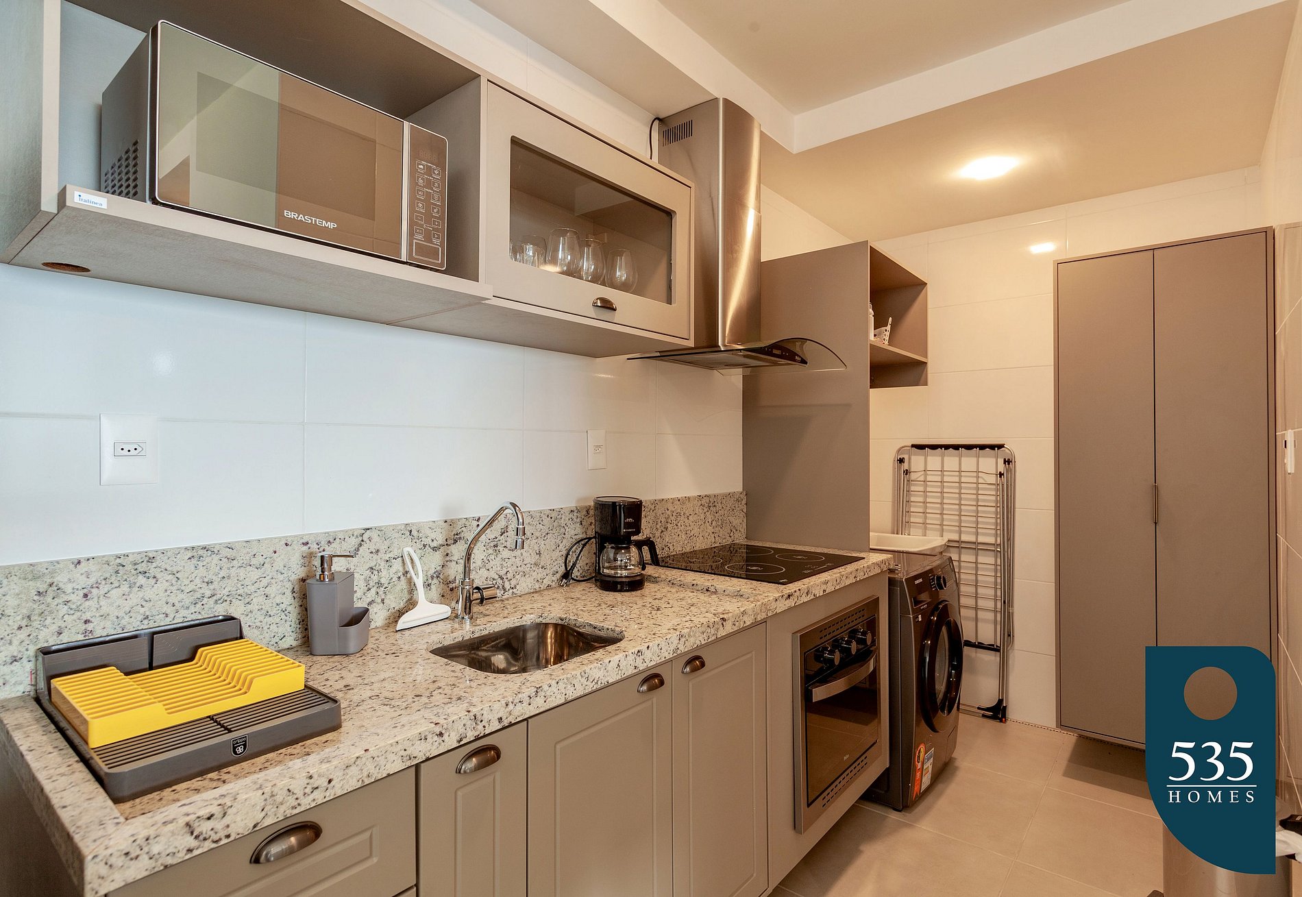 A cozinha é totalmente equipada com todos os utensílios necessários para o preparo das refeições, como geladeira, liquidificador, sanduicheira e demais utensílios necessários para cozinhar. Há também uma máquina de lavar disponível para sua conveniência.