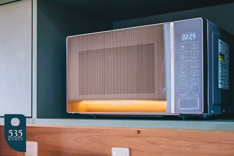 Na cozinha, você encontrará eletrodomésticos essenciais, como liquidificador, sanduicheira, geladeira, purificador de água e micro-ondas, garantindo praticidade no preparo das suas refeições.