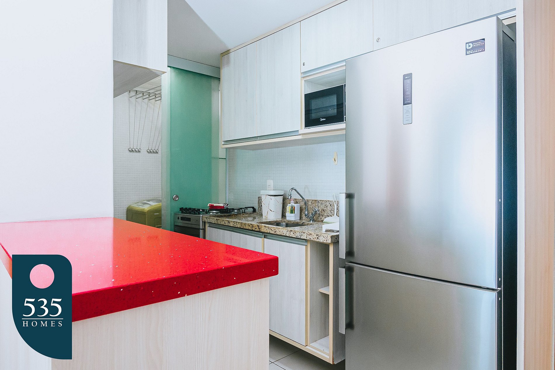 O quarto possui uma confortável cama Queen e um amplo armário com espelho, garantindo noites tranquilas e espaço para organizar suas coisas. Além disso, o apartamento conta com máquina de lavar roupa, facilitando sua rotina, seja em estadias curtas ou longas e uma cafeteira que proporciona praticidade.