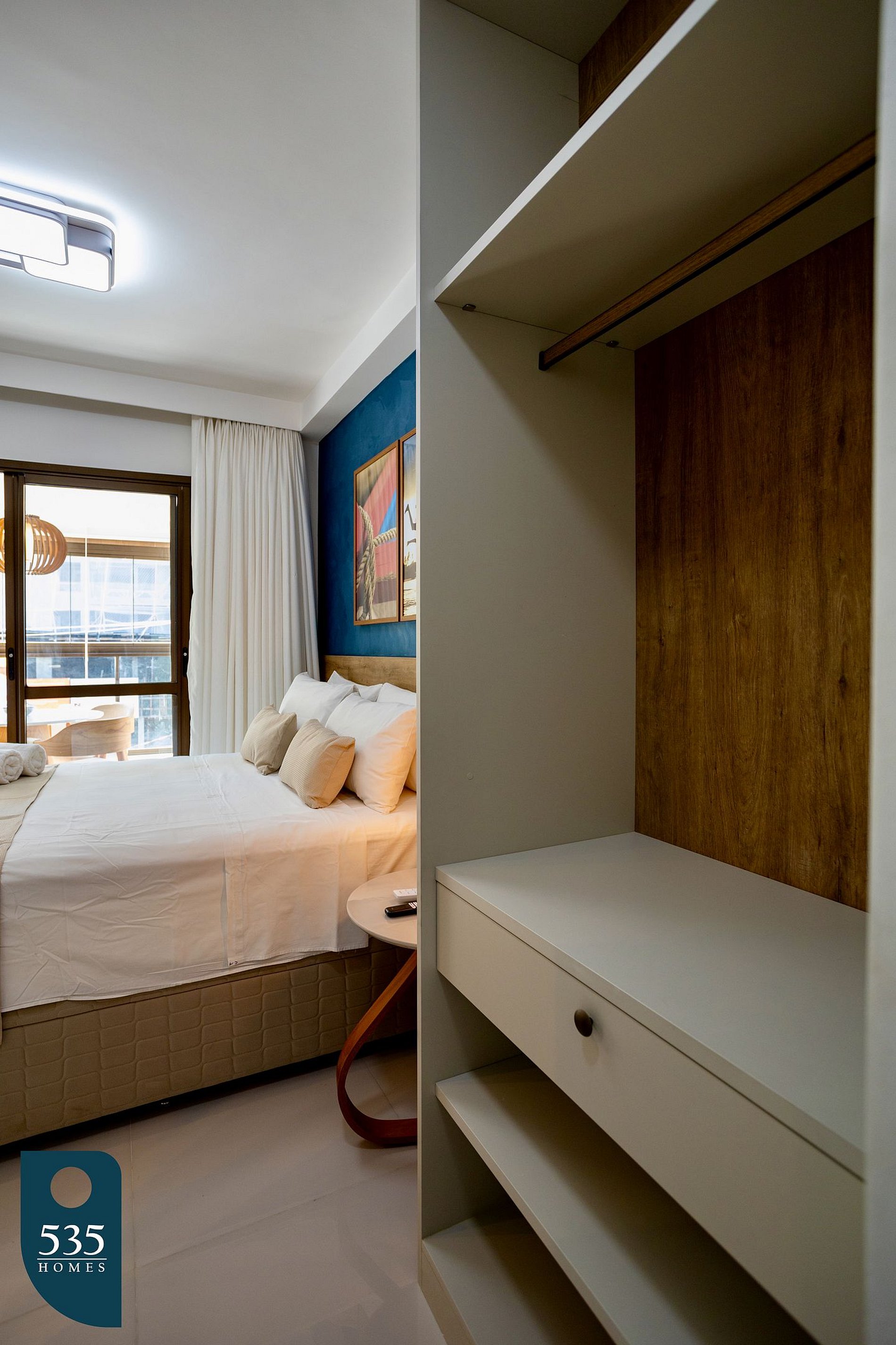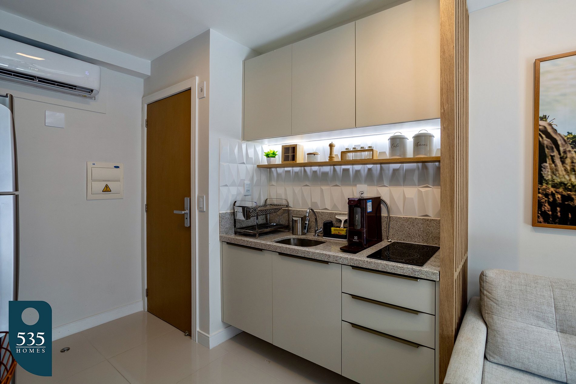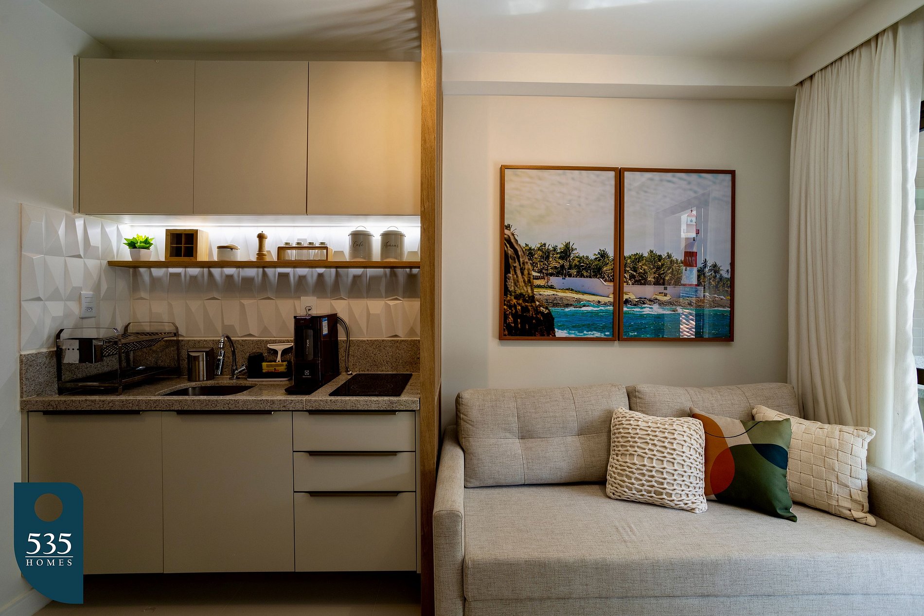 Na cozinha, você terá à disposição uma geladeira, bebedouro, cooktop de indução de 2 bocas, forno portátil, micro-ondas e sanduicheira, além de um liquidificador para facilitar o seu dia a dia. O apartamento também conta com um varal de roupa e cabides, cafeteira, ferro e mesa de passar roupa, secador de cabelo e ducha higiênica oferecendo ainda mais comodidade durante a sua estadia. Tudo pensado para que você se sinta em casa e aproveite ao máximo sua visita a Ondina.