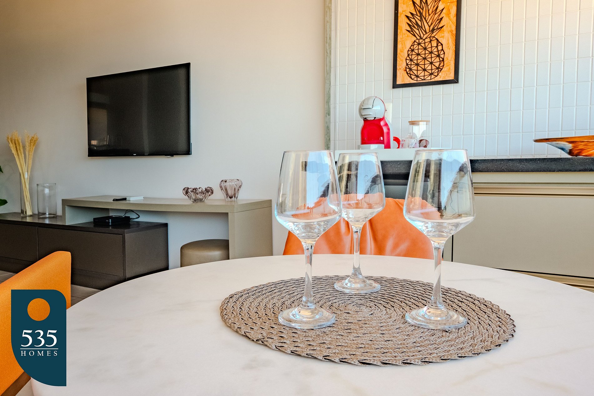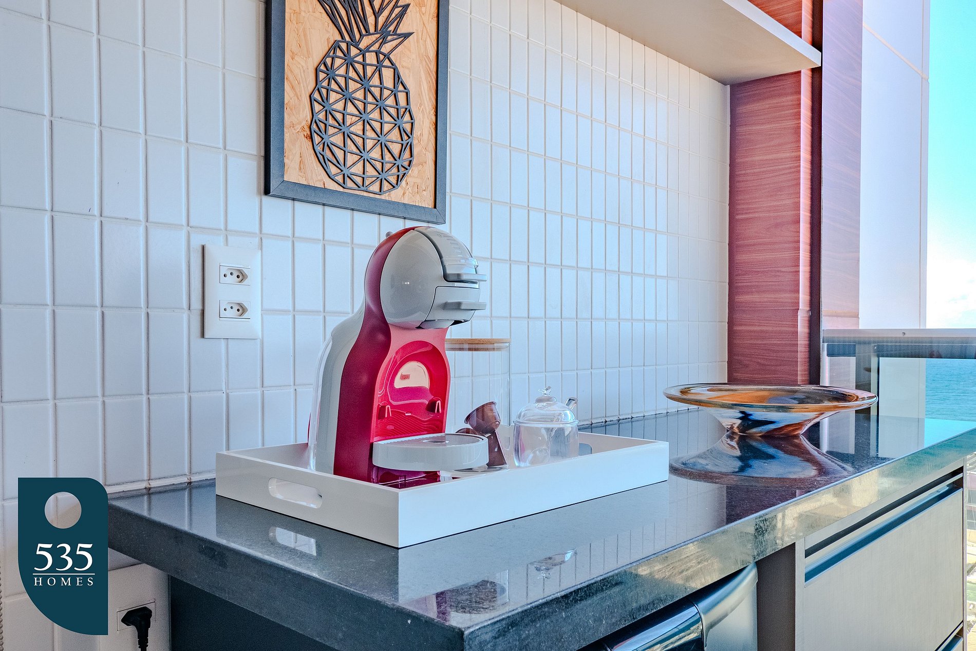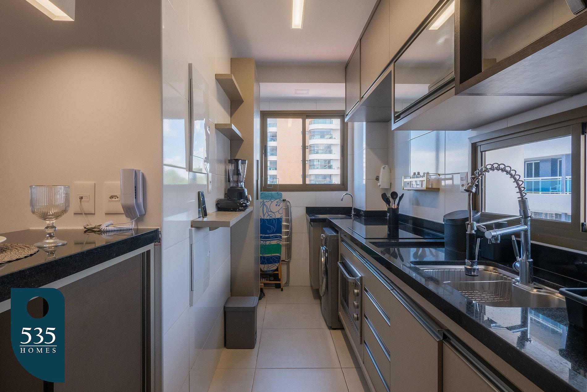 A sala de estar conta com uma Smart TV de 50", garantindo momentos de relaxamento, enquanto a cozinha dispõe de eletrodomésticos de qualidade, como micro-ondas, geladeira, forno e cooktop de indução de 04 bocas, além de um liquidificador, chaleira elétrica, sanduicheira e purificador de água, proporcionando todo o conforto necessário para preparar suas refeições. Para os apreciadores de café, há uma máquina de café em cápsulas disponível fora da cozinha, permitindo um delicioso começo de dia. O apartamento também oferece uma cervejeira, para manter suas bebidas sempre geladas. Para sua conveniência, há uma máquina de lavar, ferro de passar e tábua de passar roupa, além de um varal de roupa, permitindo que você cuide de suas roupas durante a estadia. Um aspirador de pó, ducha higiênica e secador de cabelo completam a estrutura do imóvel, garantindo que você tenha todo o conforto e praticidade no seu dia a dia.