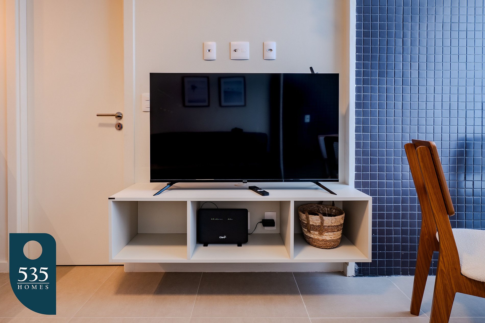 No quarto, o conforto continua com Smart TV de 32”, ar-condicionado, ferro de passar roupa e mesa compacta para passar — ideal para quem não abre mão de estar sempre com tudo em ordem.