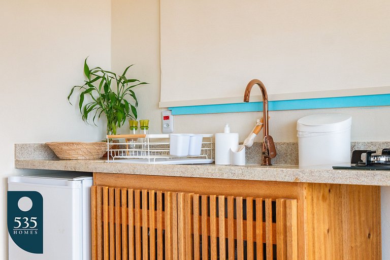 A cozinha é equipada com tudo o que você precisa para preparar refeições: frigobar, forno elétrico, cooktop 4 bocas a gás, liquidificador, cafeteira, sanduicheira e uma mesa para 2 pessoas. Também incluímos uma lixeira seletiva (orgânicos e recicláveis) e um purificador de água, para mais sustentabilidade e praticidade.