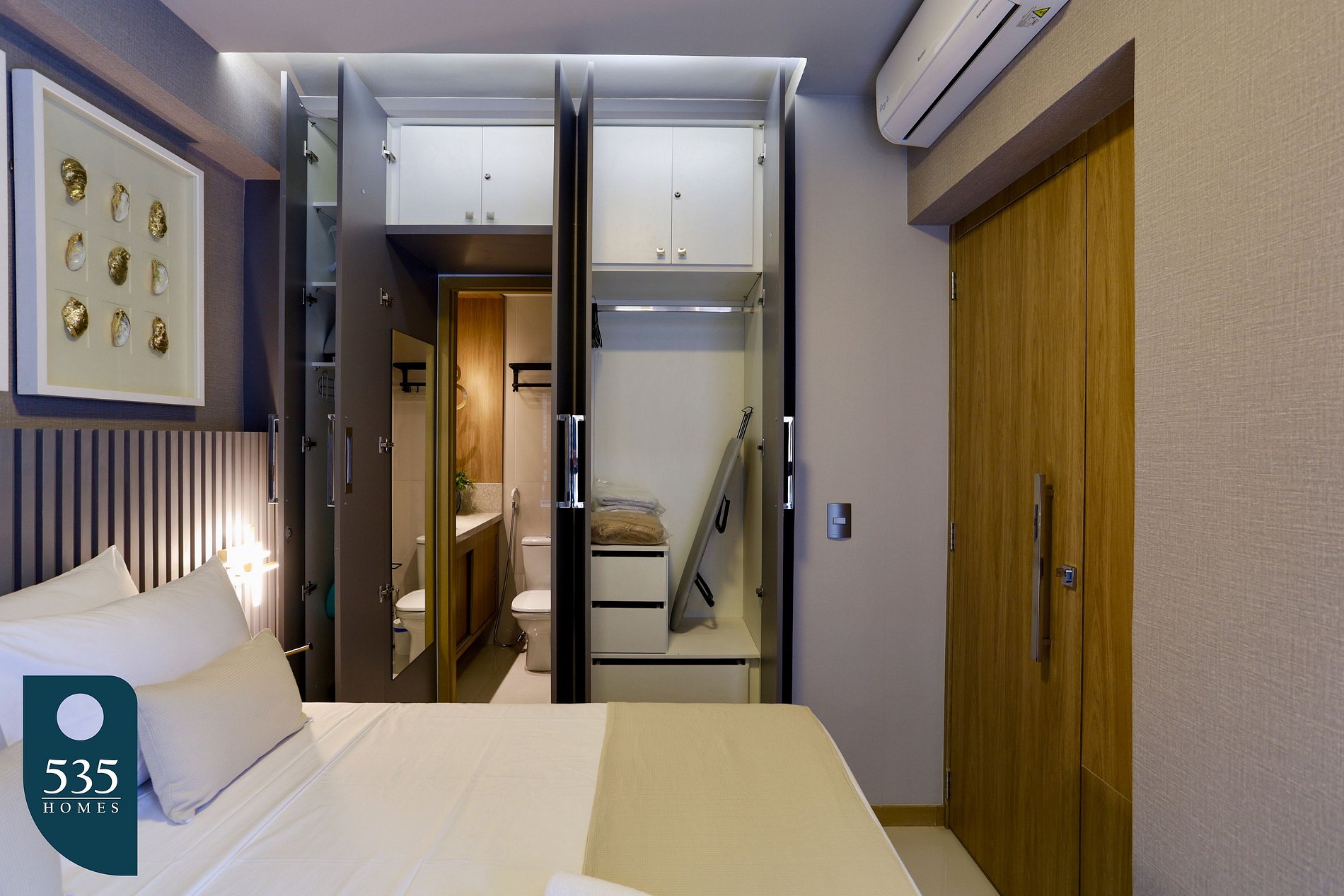 O quarto oferece ar-condicionado, espelho de corpo inteiro, mesa compacta para passar roupa, ferro de passar, varal de chão, prendedores de roupa e balde, garantindo praticidade e organização durante toda a estadia.