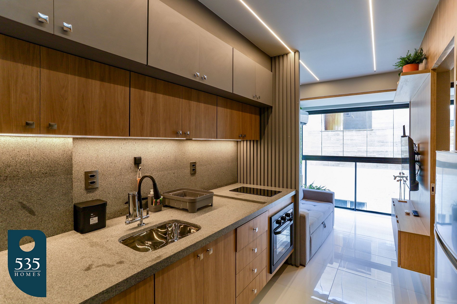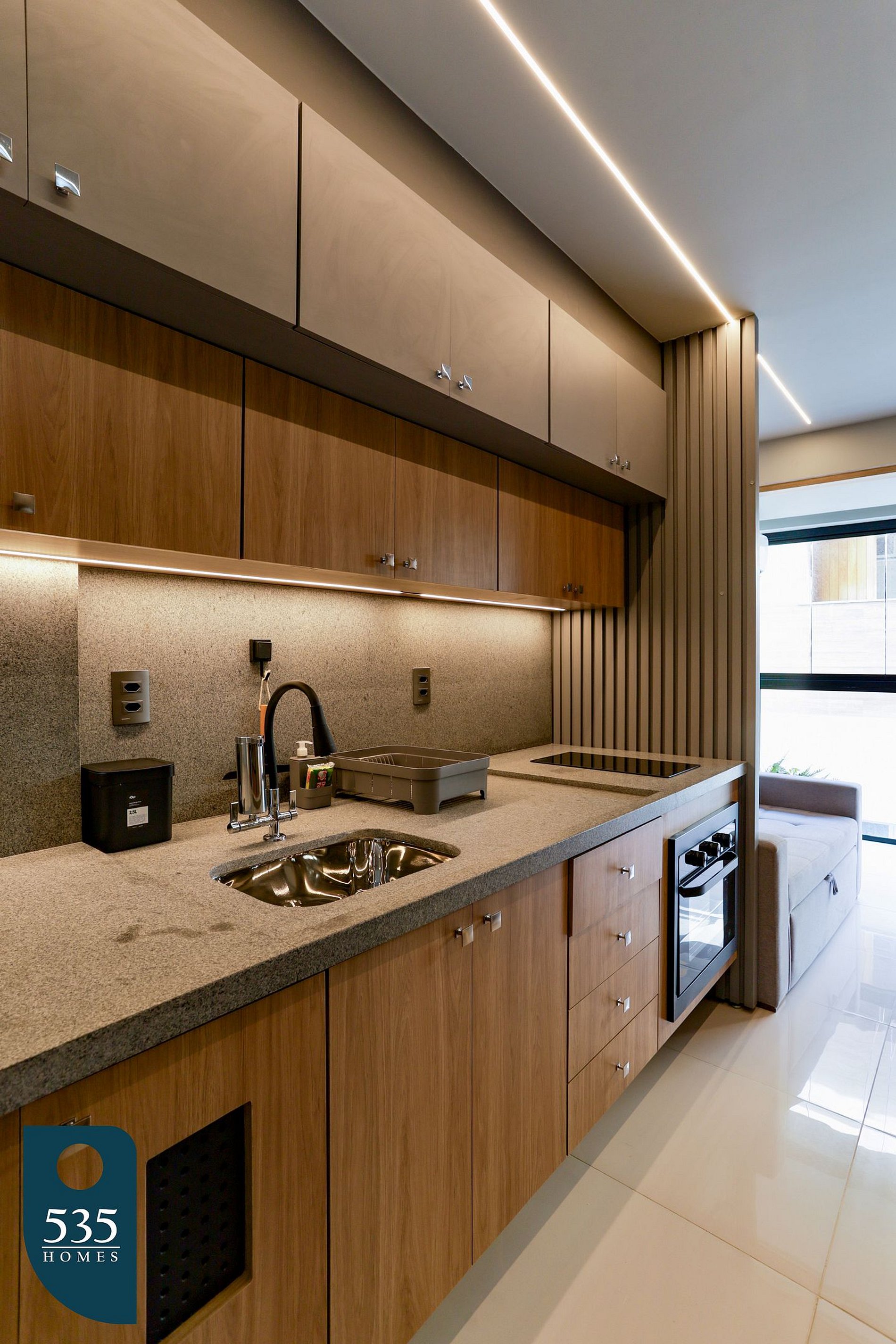 A cozinha é super equipada, perfeita para preparar desde um café da manhã até refeições completas. Conta com máquina de lavar e secar roupa, cafeteira elétrica, máquina de café em cápsulas, cooktop de indução com 2 bocas, geladeira, forno elétrico, micro-ondas, sanduicheira e purificador de água acoplado à torneira da pia.