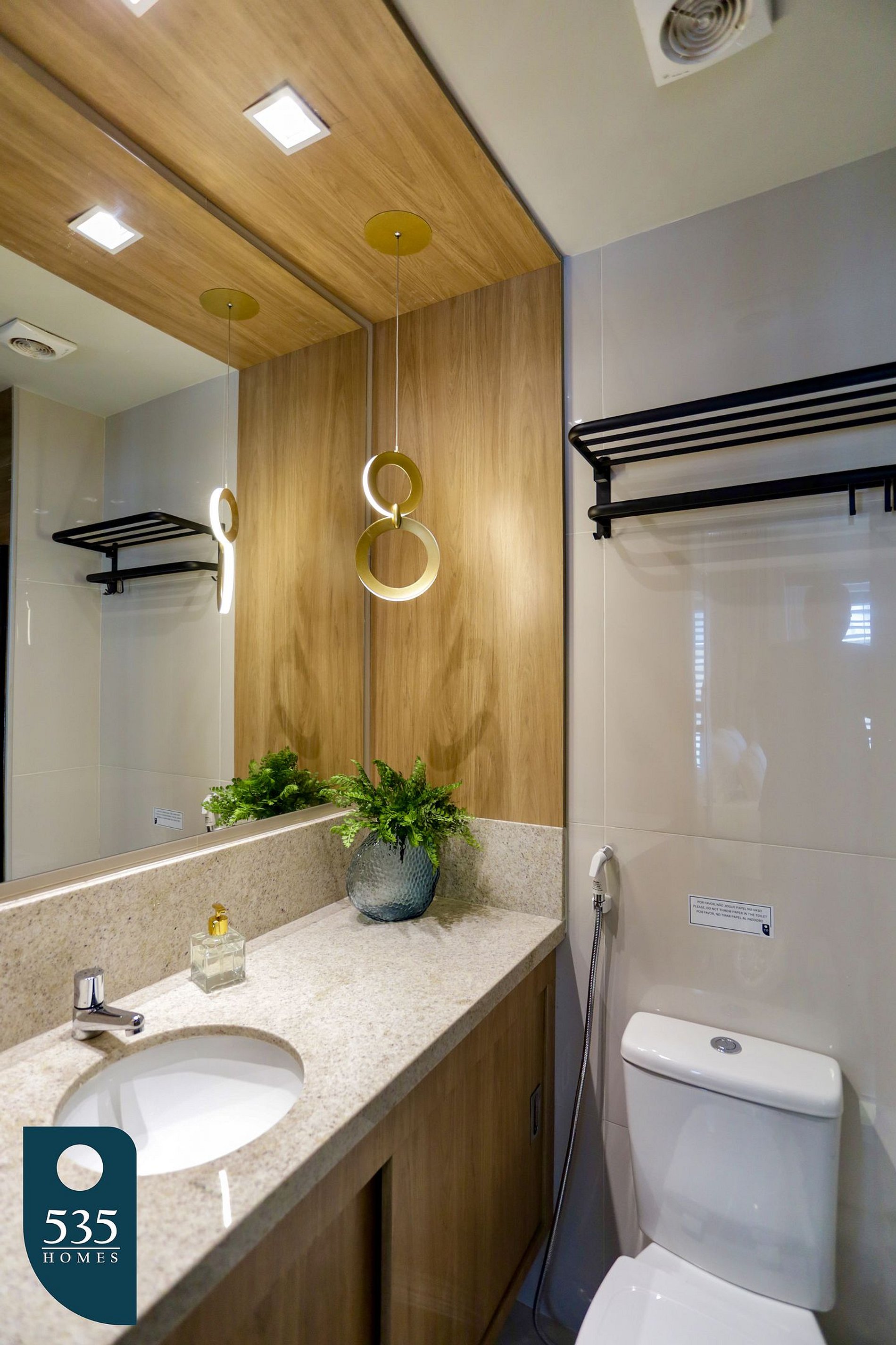 O banheiro é funcional e bem ventilado, equipado com ducha higiênica, secador de cabelo e exaustor, proporcionando conforto e praticidade no dia a dia.