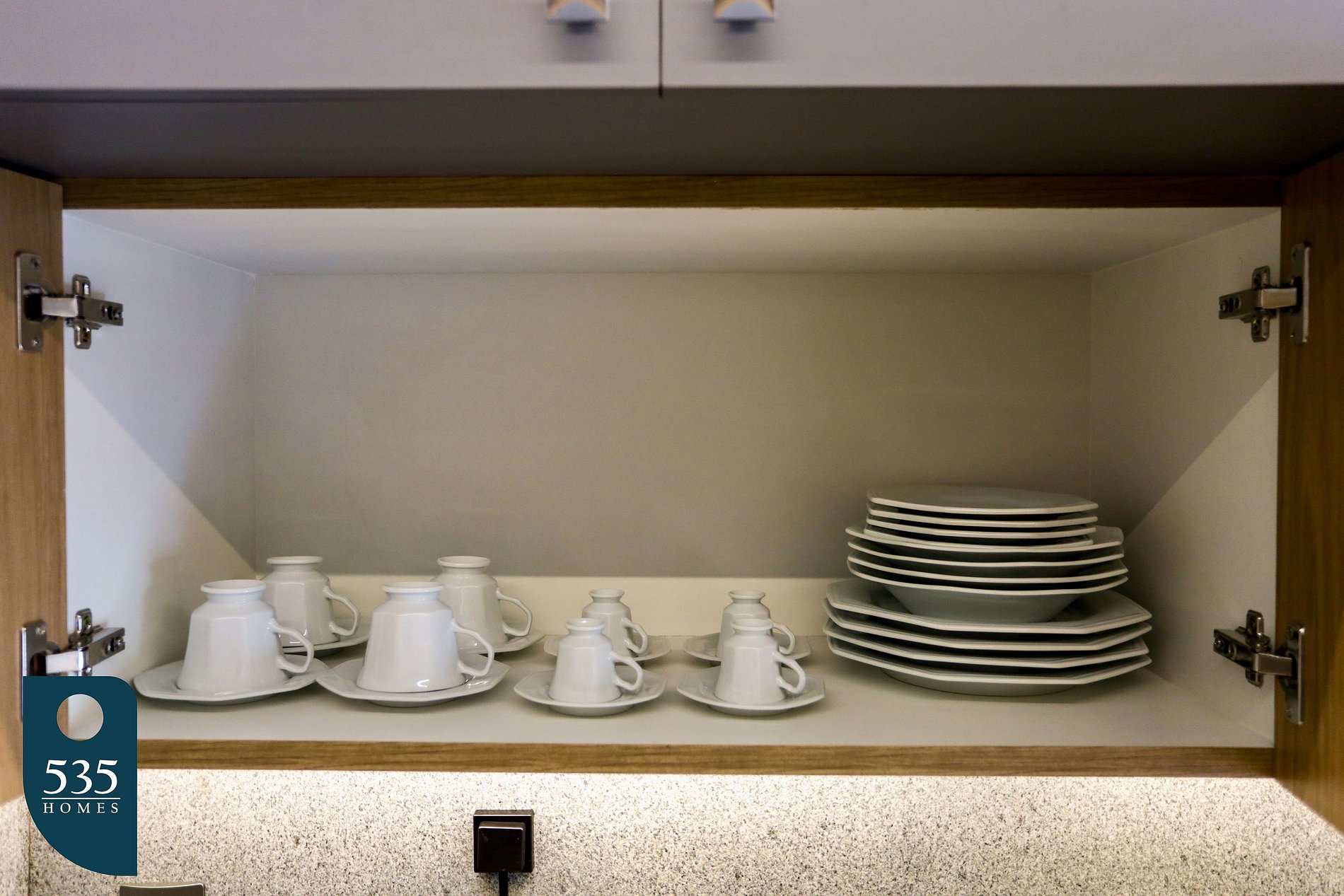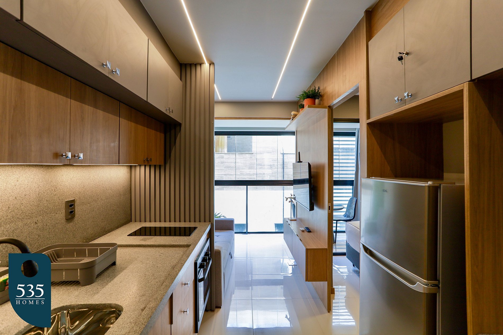 A cozinha é super equipada, perfeita para preparar desde um café da manhã até refeições completas. Conta com máquina de lavar e secar roupa, cafeteira elétrica, máquina de café em cápsulas, cooktop de indução com 2 bocas, geladeira, forno elétrico, micro-ondas, sanduicheira e purificador de água acoplado à torneira da pia.