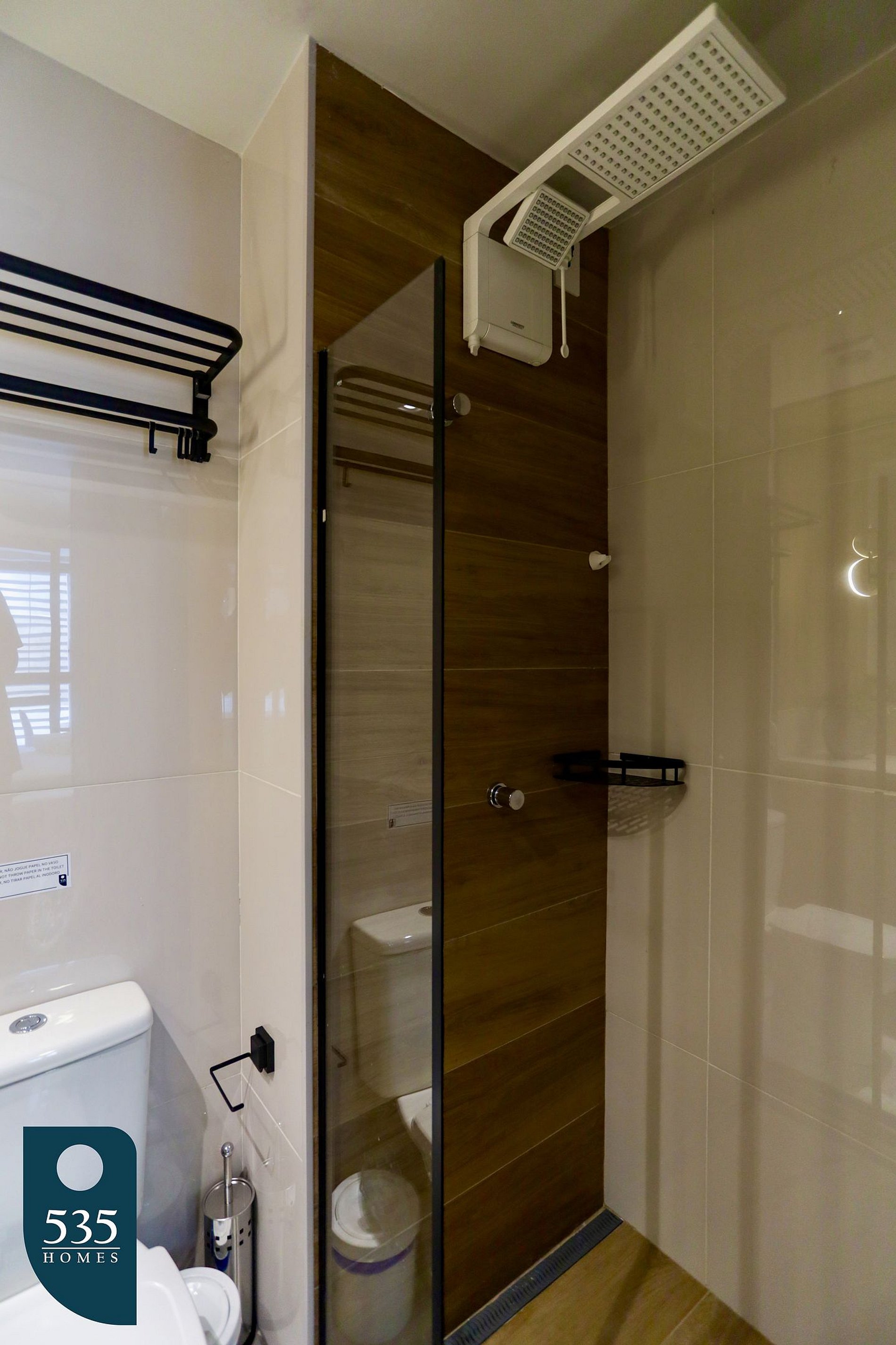O banheiro é funcional e bem ventilado, equipado com ducha higiênica, secador de cabelo e exaustor, proporcionando conforto e praticidade no dia a dia.