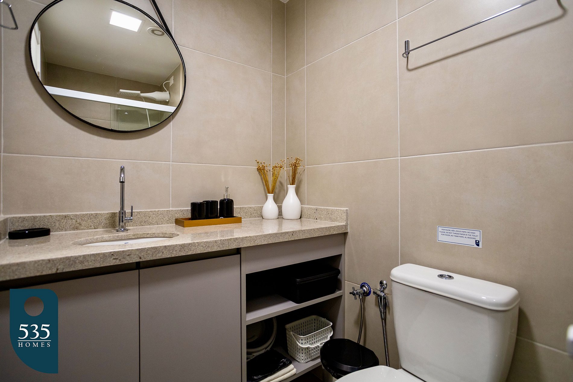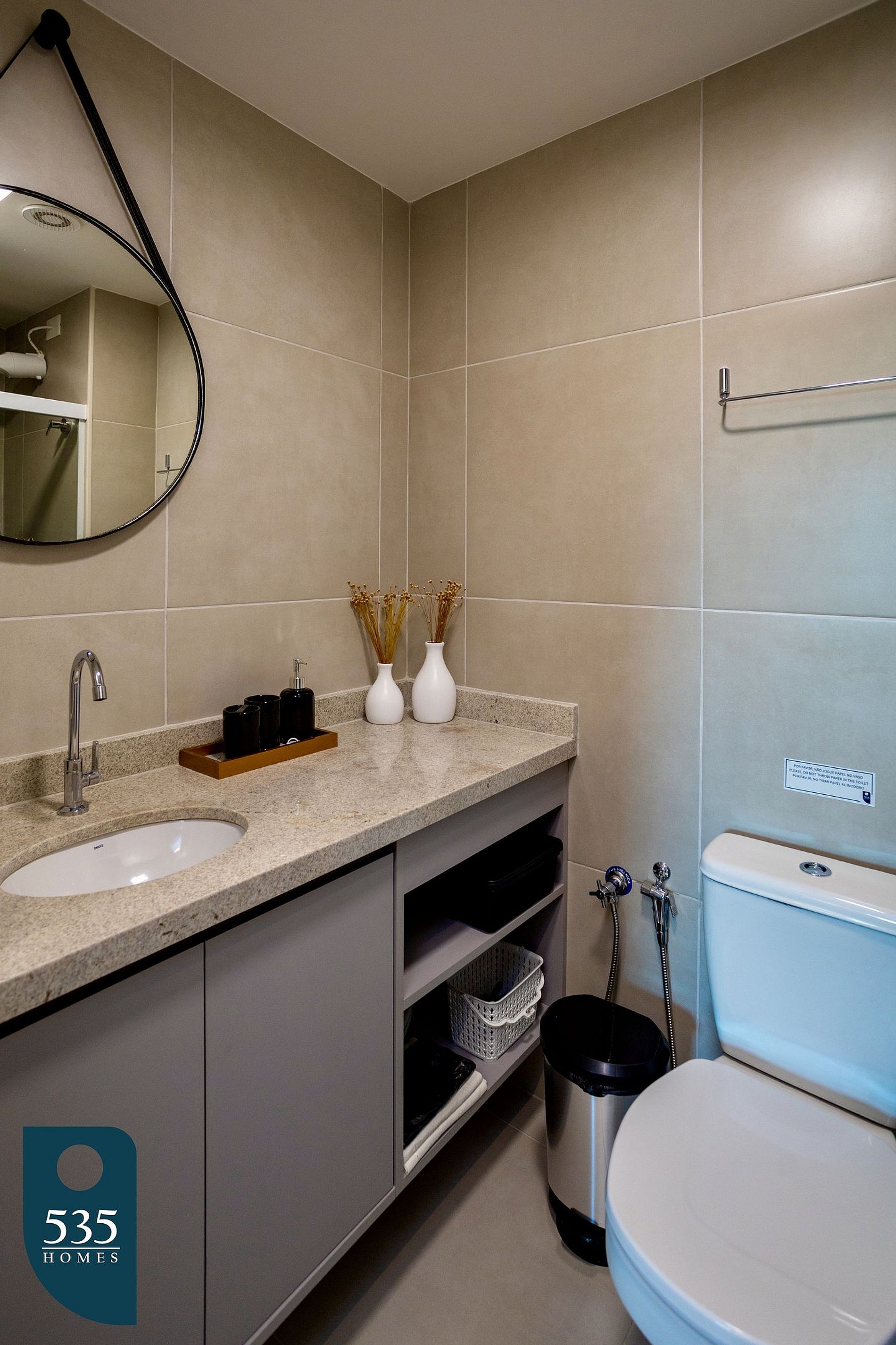O banheiro é completo e funcional, equipado com chuveiro elétrico, ducha higiênica, exaustor e secador de cabelo, garantindo comodidade e bem-estar durante toda a estadia.