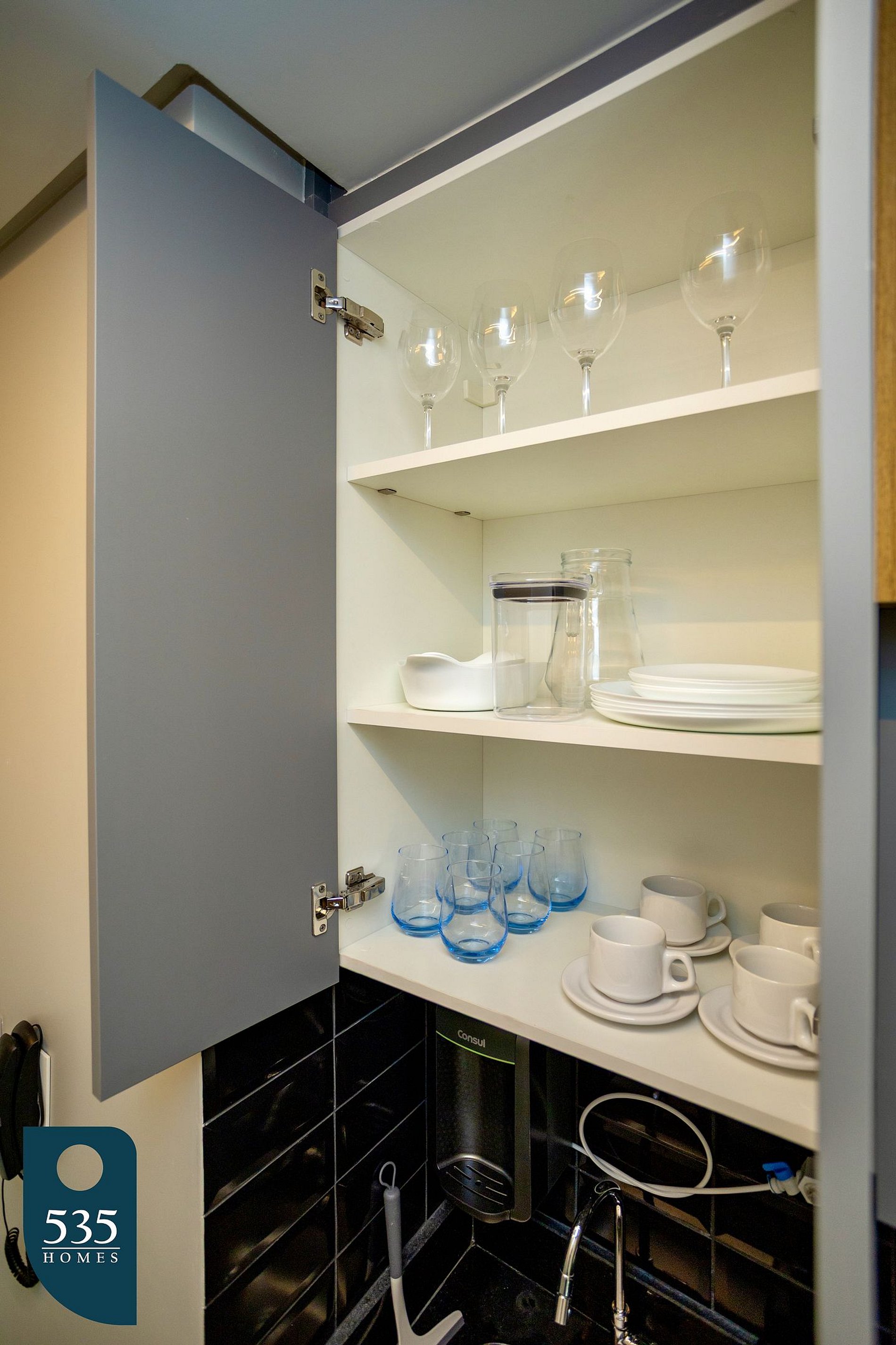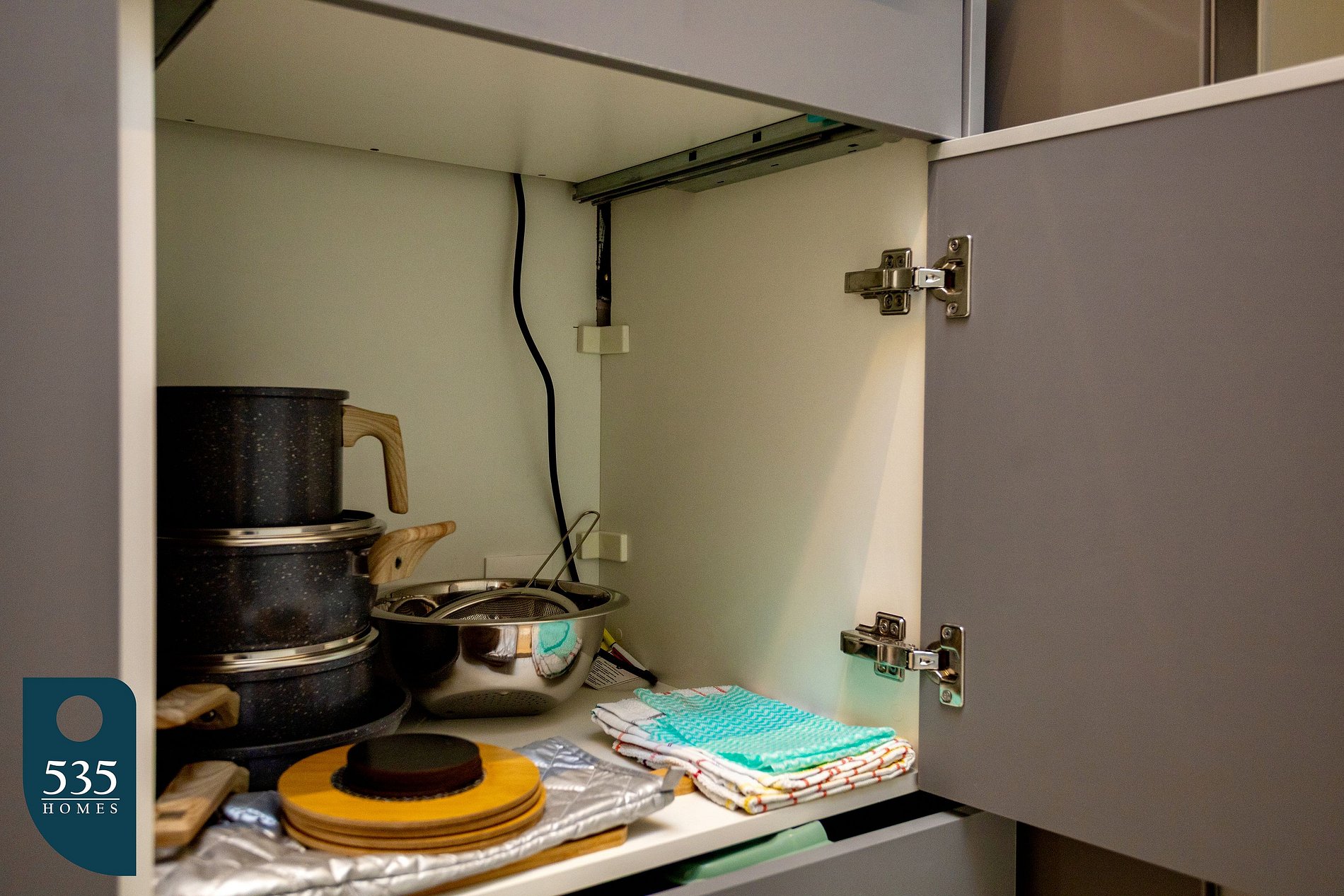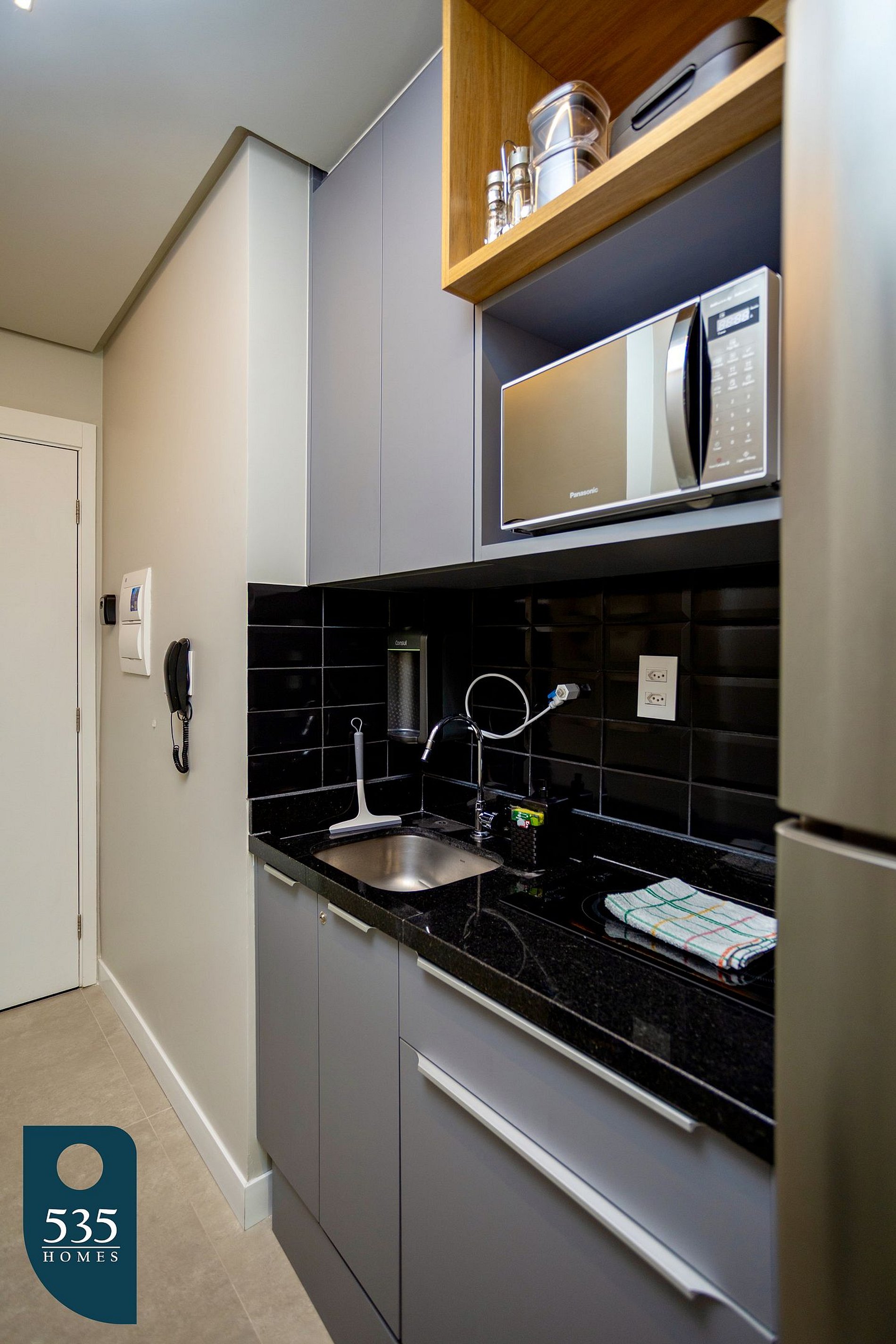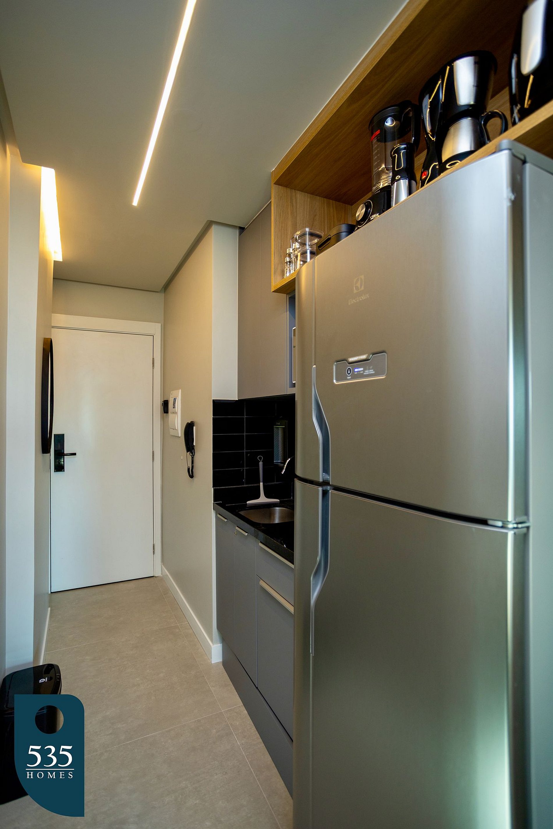A cozinha conta com cooktop de indução de 2 bocas, geladeira, micro-ondas, airfryer, liquidificador, cafeteira elétrica, sanduicheira e purificador de água, oferecendo tudo o que você precisa para preparar suas refeições com facilidade.