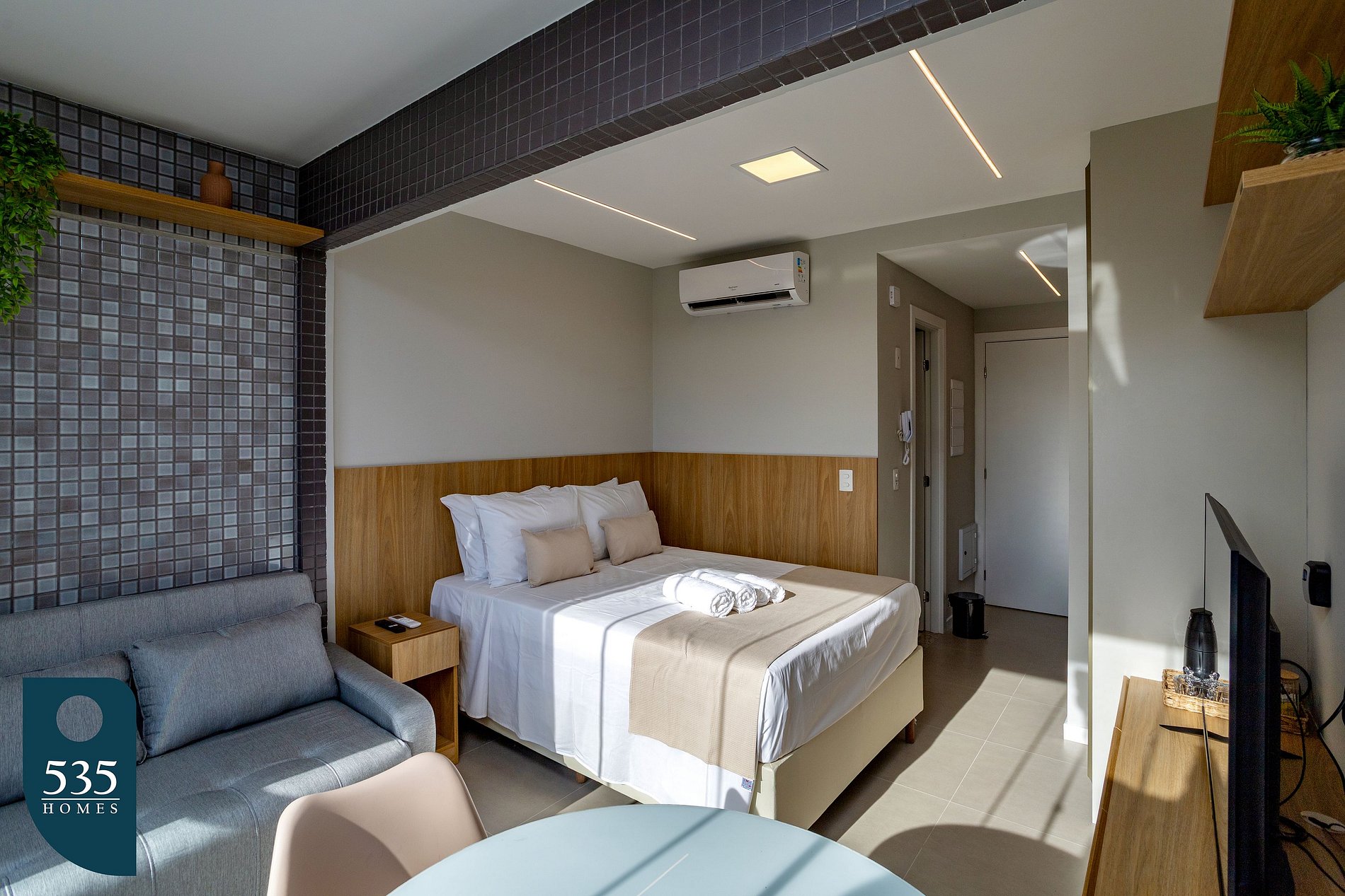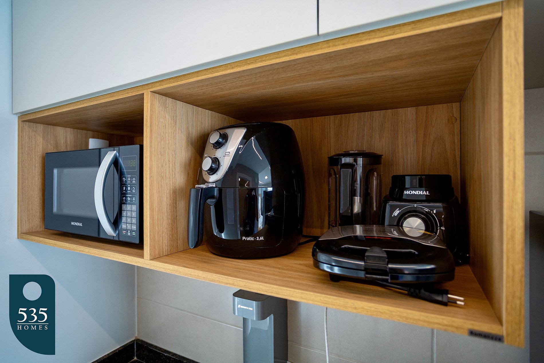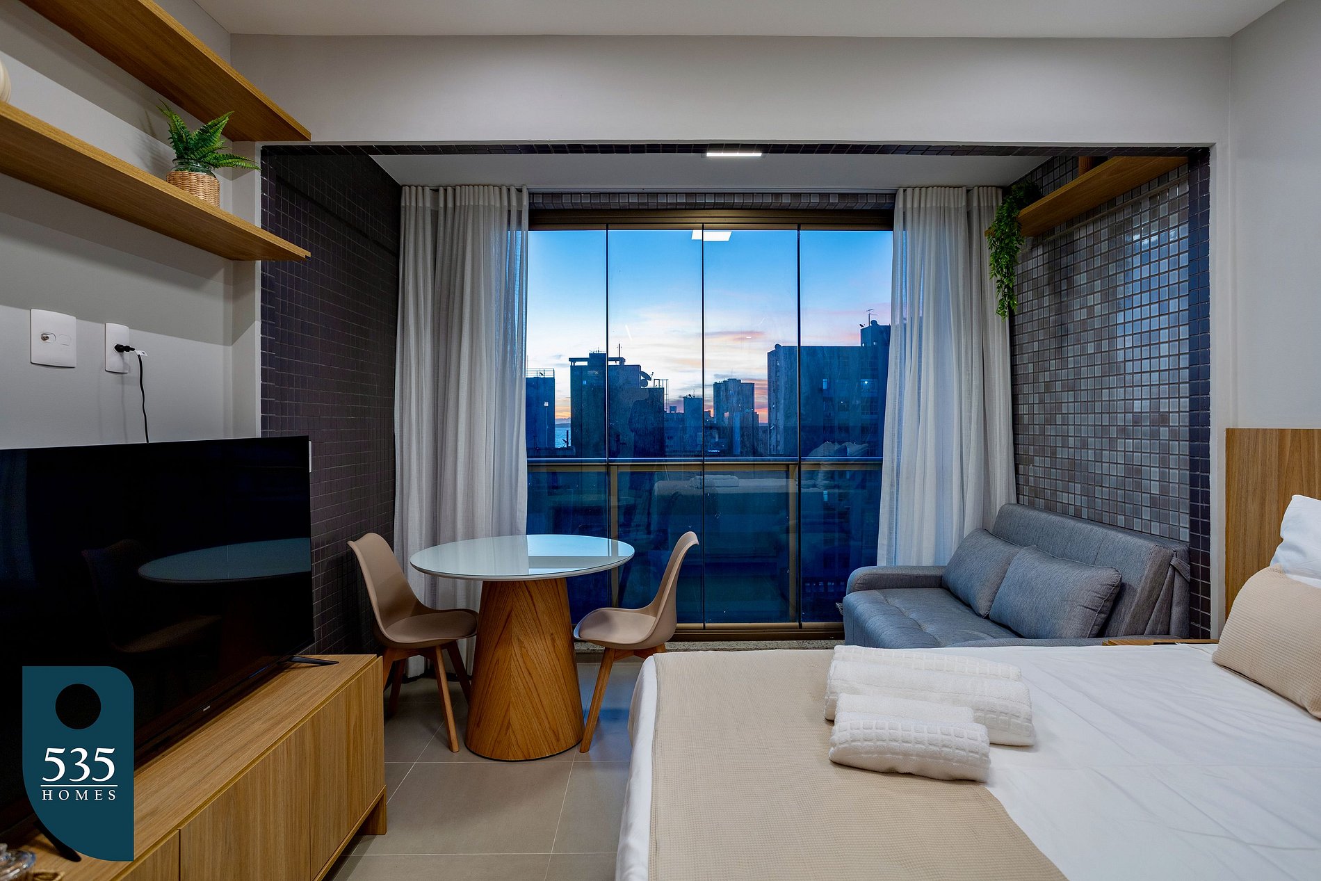 O apartamento é equipado com uma cozinha prática e funcional, que conta com cooktop de indução de duas bocas, geladeira, purificador de água, micro-ondas, sanduicheira, airfryer, liquidificador e máquina de café em cápsulas, oferecendo toda a conveniência para preparar suas refeições com conforto. No banheiro, há ducha higiênica, secador de cabelo, balde retrátil e varal de roupas fixo, garantindo praticidade para o dia a dia. No quarto, o ambiente é bem planejado e confortável, com Smart TV de 50 polegadas, cortina blackout que proporciona um ótimo escurecimento, mesa de refeições com duas cadeiras, ferro de passar roupa e mesa compacta para passar, unindo funcionalidade e bem-estar em um só lugar.