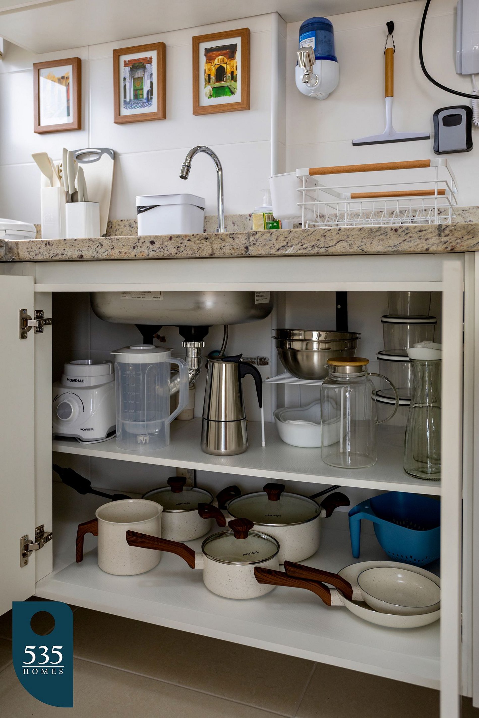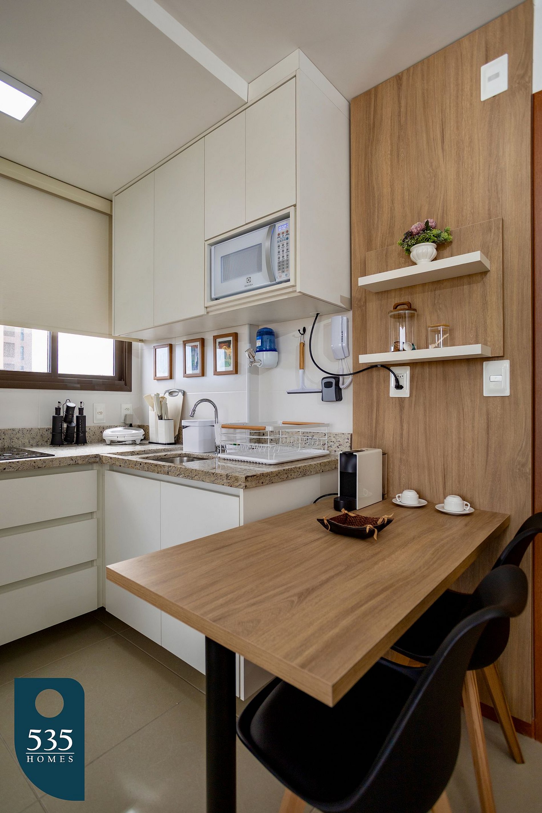 A cozinha é totalmente equipada, contando com cooktop de indução de duas bocas, micro-ondas com tampa protetora, máquina de café em cápsulas, cafeteira italiana, liquidificador, sanduicheira, geladeira, purificador de água, escorredor de pratos, rodinho de pia, lixeira, dispenser de detergente, além de um jogo de três panelas com tampas de vidro, frigideiras, leiteira, porta-condimentos, escorredor de arroz/macarrão, bowls de inox, potes para armazenar alimentos, assadeira de vidro para micro-ondas, jarras, copos, taças, xícaras de café, cuba de gelo, aparelho de jantar e jogo americano. Para preparar as refeições com praticidade, o studio também dispõe de diversos utensílios como tesoura multiuso, talheres, jogo de facas, tábua de corte, abridor de lata, abridor de vinho, descanso de panela, peneiras, luva térmica e demais itens indispensáveis.