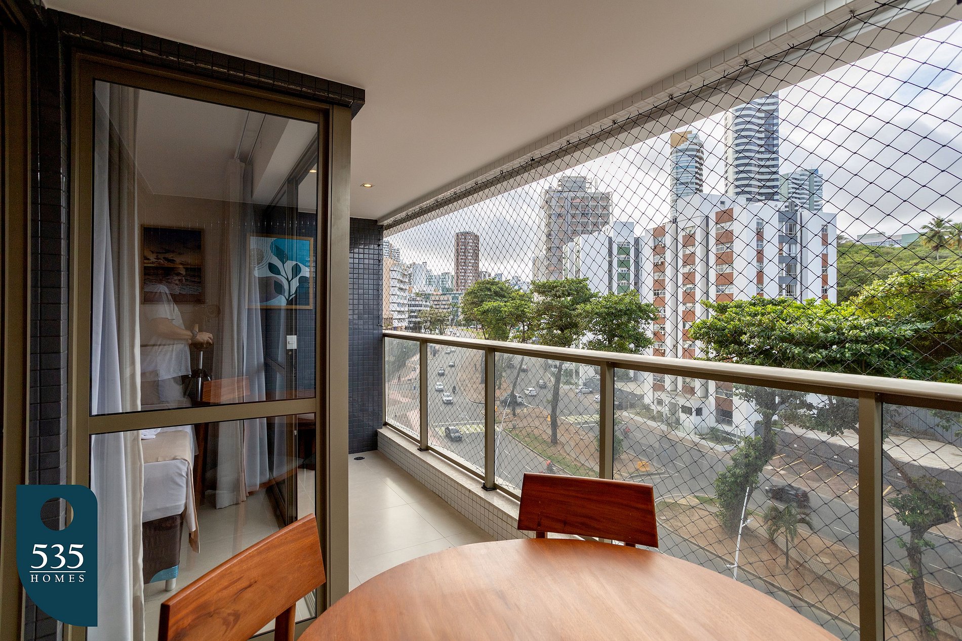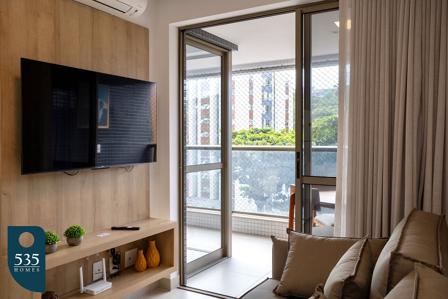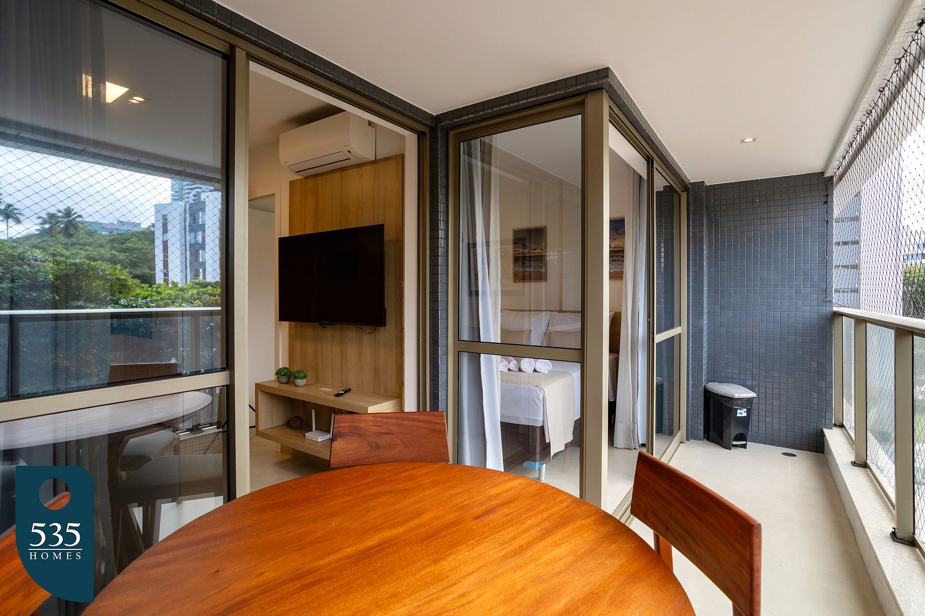 O apartamento está cuidadosamente equipado para proporcionar uma estadia confortável e prática. A cozinha conta com micro-ondas, sanduicheira, liquidificador, cafeteira italiana, torneira com filtro de água acoplado, além de diversos utensílios como xícaras de chá e de café com pires, taças de vinho, copos, pratos rasos, fundos e de sobremesa, jarra de suco, potes plásticos, escorredor de pratos, dispenser para detergente, rodinho e lixeira de pia, açucareiro, jogo de talheres, jogo americano, descanso de panela, jogo de panelas com tampas, frigideira, escorredor de macarrão, bowl, tábua de corte, peneira, abridores de lata e de vinho, descascador de legumes e jogo de facas. A sala é climatizada com ar-condicionado, conta com Smart TV de 50", cortina com blackout, poltronas e sofá, criando um ambiente agradável para descanso e entretenimento. Na varanda, há mesa com cadeiras, lixeira de pedal e tela de proteção, ideal para momentos de relaxamento ao ar livre. O quarto oferece conforto com ar-condicionado, cortina blackout, armário com gavetas, cabides, mesa de passar roupa compacta e ferro de passar. Já o banheiro dispõe de lixeira, ducha higiênica, secador de cabelo, dispenser de sabonete líquido, balde retrátil, vassoura, rodo de chão, varal de chão, pá de lixo e pregadores de roupa, garantindo praticidade durante toda a estadia.