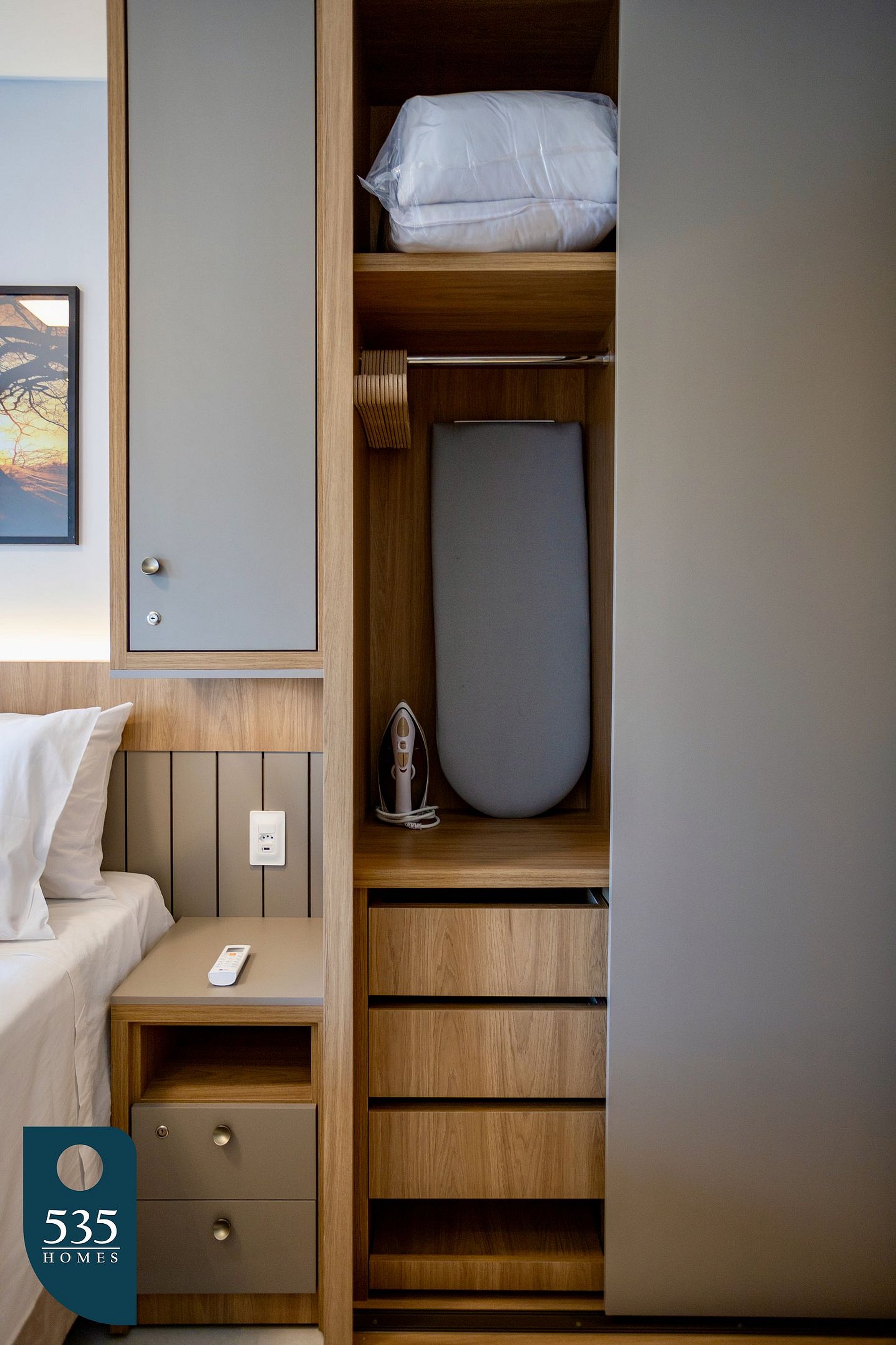 O apartamento foi projetado para oferecer praticidade e bem-estar em todos os ambientes. A cozinha dispõe de bancada para refeições, micro-ondas, airfryer, liquidificador, sanduicheira, máquina de café, purificador de água e cooktop de indução com duas bocas, além de garrafa térmica, escorredor de macarrão e arroz e tábua de corte, proporcionando praticidade para o preparo das refeições. Na cozinha também estão disponíveis vassoura, pá de lixo, varal de chão, pregadores de roupa, rodo de chão e balde, garantindo comodidade nas tarefas do dia a dia. A sala é equipada com Smart TV de 55” e cortina blackout com voal, perfeita para momentos de lazer e descanso. A varanda envidraçada com Reiki conta com mesa de refeição e cadeiras, criando um espaço agradável para relaxar. No quarto, o conforto é garantido com ar-condicionado, tomada USB, espelho de corpo inteiro e suporte para mala, além de ferro e mesa compacta de passar roupa, com cabides disponíveis para maior praticidade durante a estadia. O banheiro possui exaustor, chuveiro elétrico, ducha higiênica, secador de cabelo e espelho.