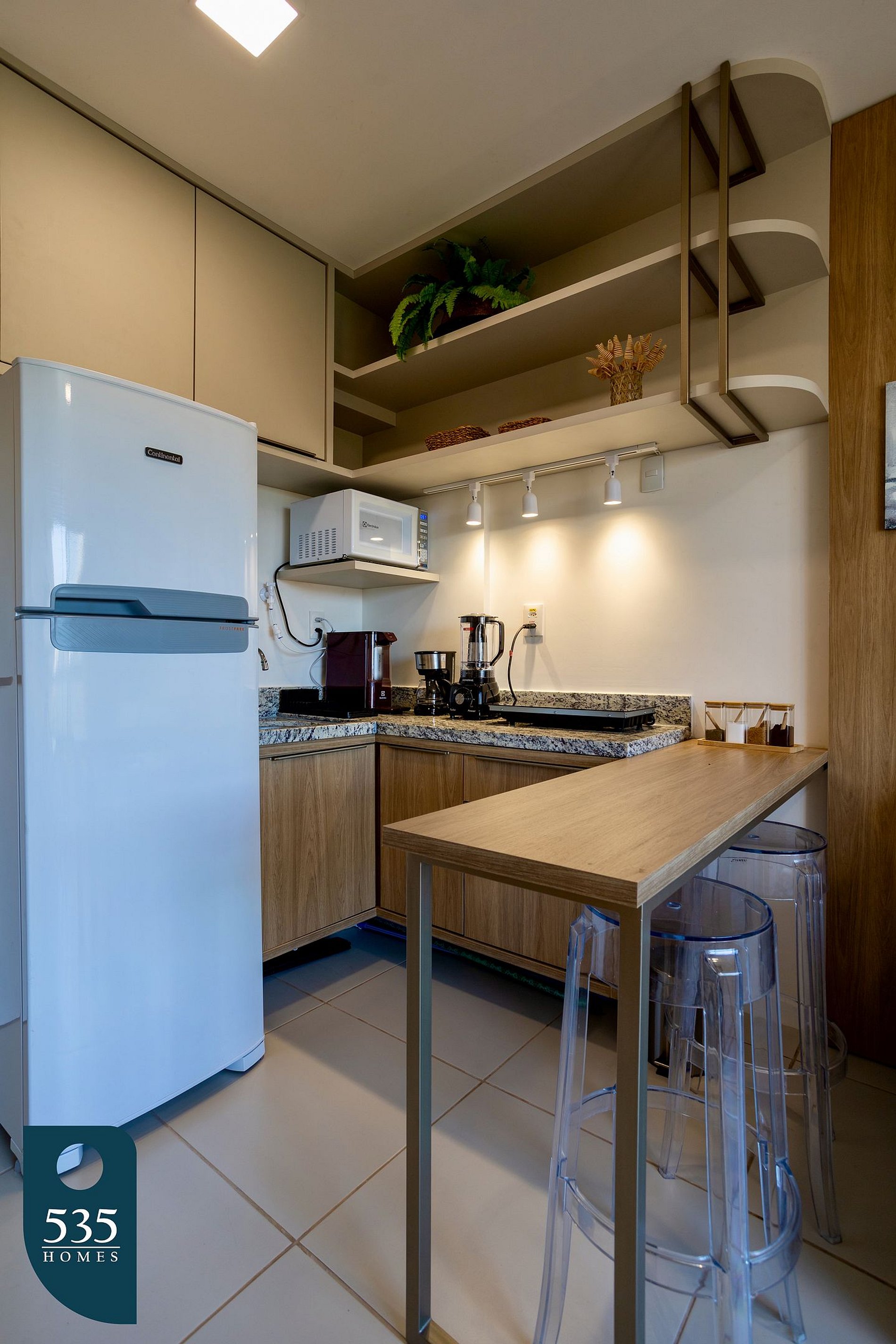 O apartamento oferece uma sala confortável com ar-condicionado, sofá retrátil e smart TV de 44", ideal para relaxar após um dia de passeios. A cozinha é completa e equipada com geladeira, micro-ondas, cooktop de indução de duas bocas, liquidificador, sanduicheira, cafeteira elétrica e cafeteira italiana de inox, além de bebedouro, escorredor de pratos, lixeiras (de chão e de pia), dispenser de detergente e rodo de pia. Conta também com utensílios como aparelho de jantar, talheres, copos para água, taças de vinho, xícaras de café, garrafa térmica, jarra de suco, jogo americano, panelas com tampa, frigideira, leiteira, abridor de lata, abridor de vinho, peneira, tábua de corte, descanso de panela, escorredor de macarrão, tesoura e diversos outros itens de cozinha.