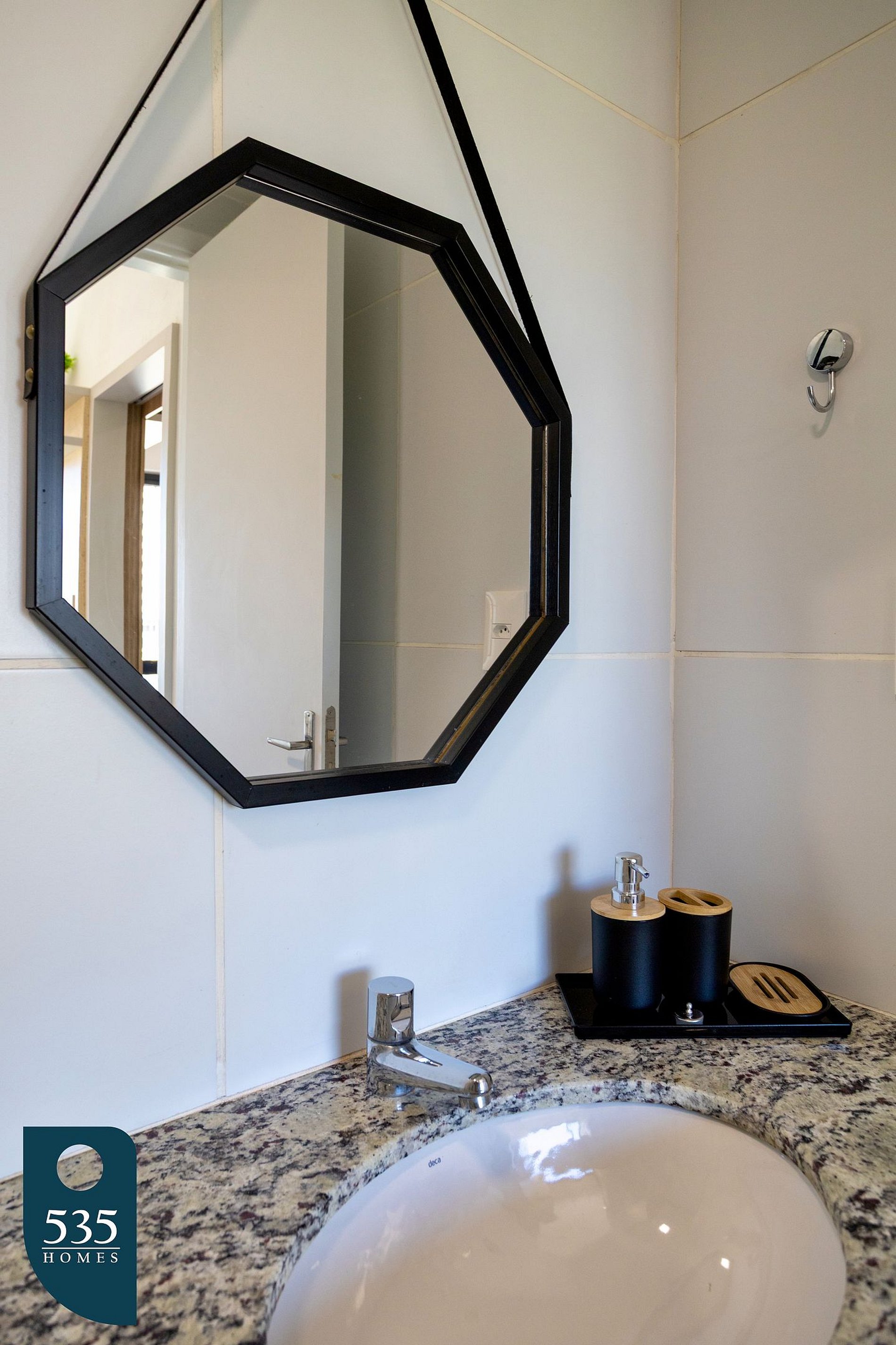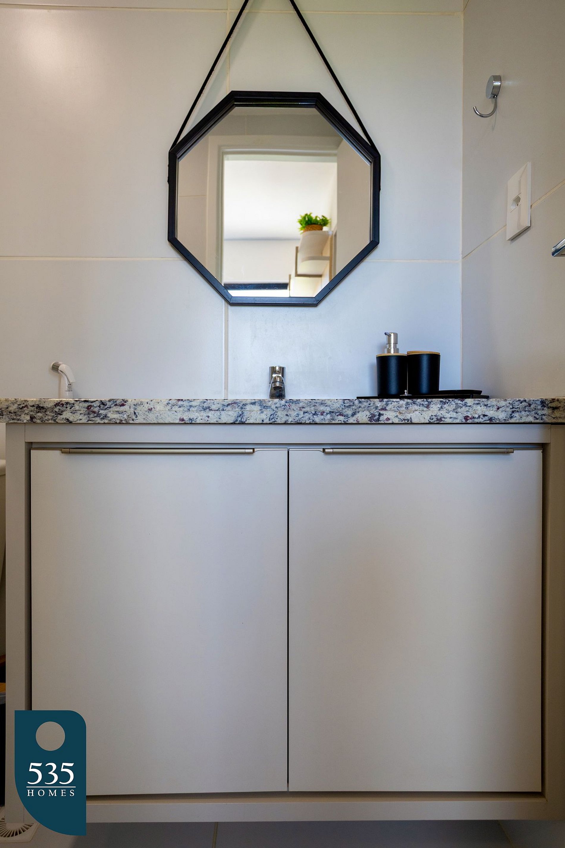 No quarto, há ar-condicionado, smart TV de 43", tábua e ferro de passar roupa, cabides e espelho de corpo inteiro. O banheiro dispõe de chuveiro elétrico, ducha higiênica, secador de cabelo, escova sanitária, lixeira com pedal e espelho. Para mais praticidade, o apartamento também inclui balde retrátil, varal de roupa e pregadores.