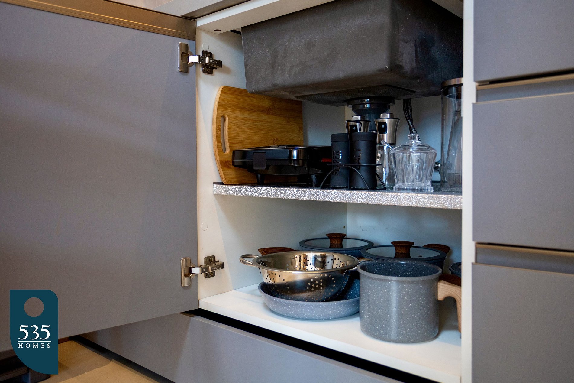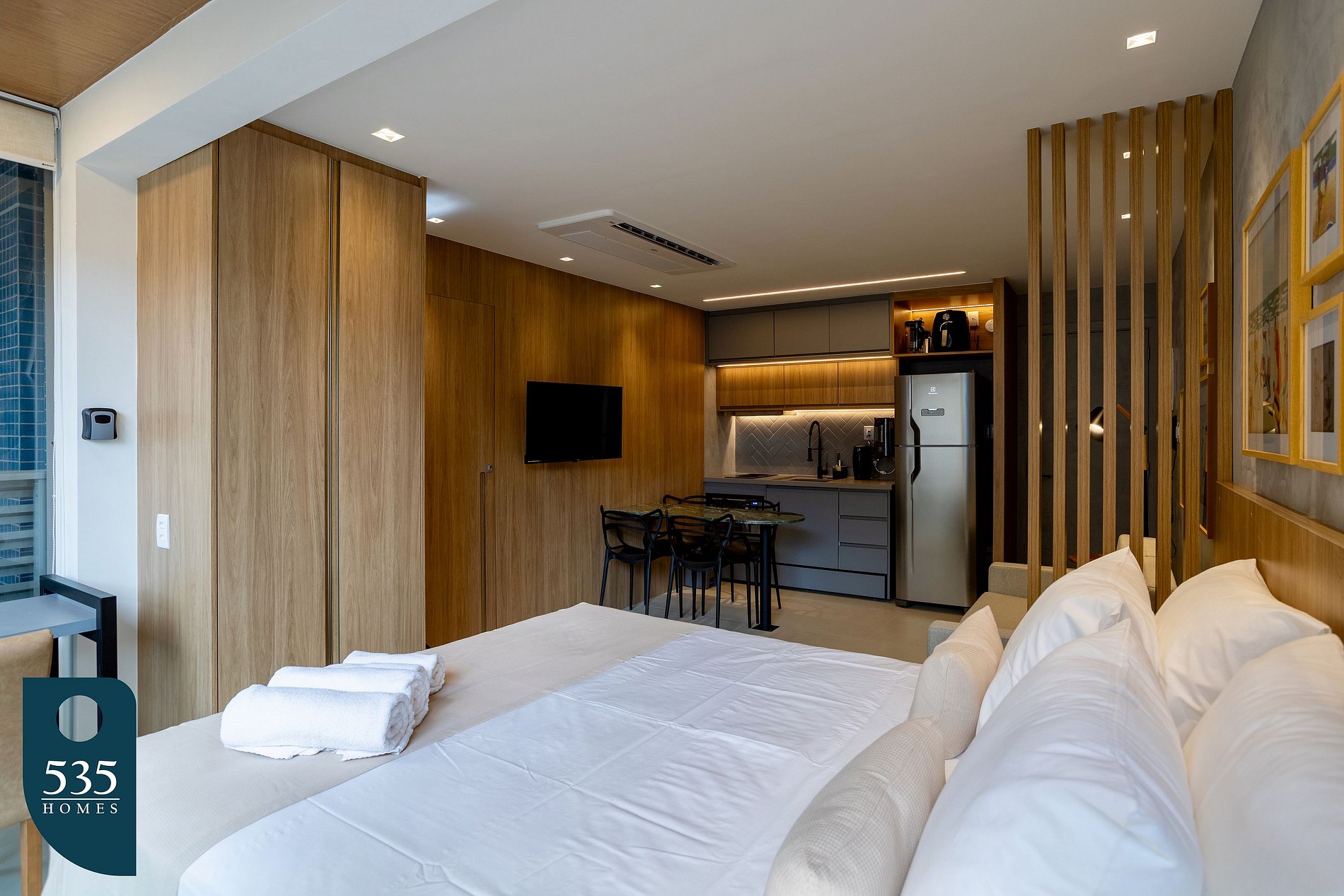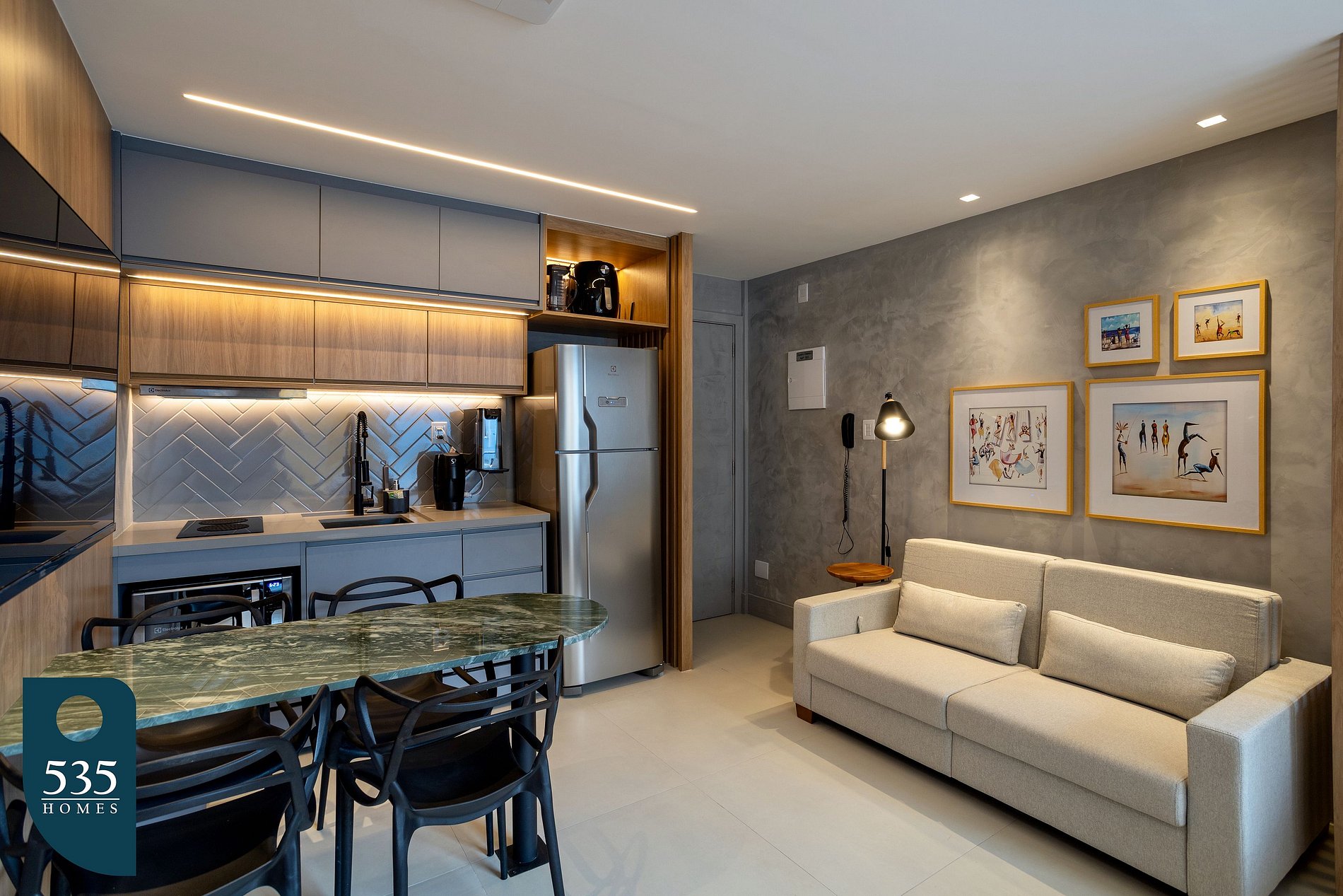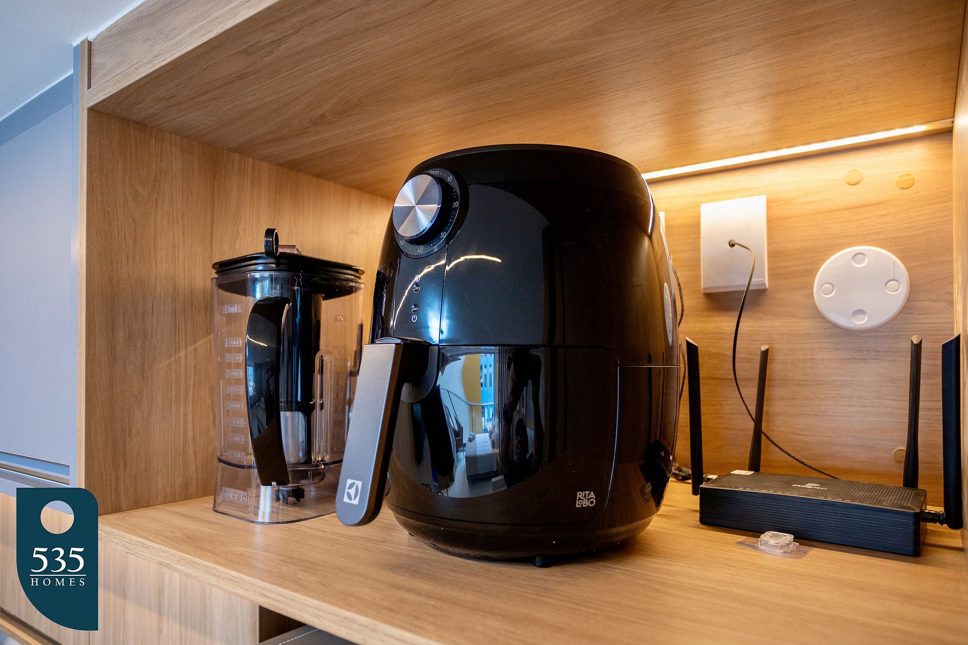 O apartamento oferece uma estrutura completa e funcional, ideal para quem busca praticidade sem abrir mão do conforto. A cozinha é equipada com cooktop de indução com duas bocas, depurador de ar retrátil, purificador de água, geladeira, micro-ondas com grill, torre de tomadas, torneira gourmet, liquidificador, sanduicheira, airfryer, máquina de café.
