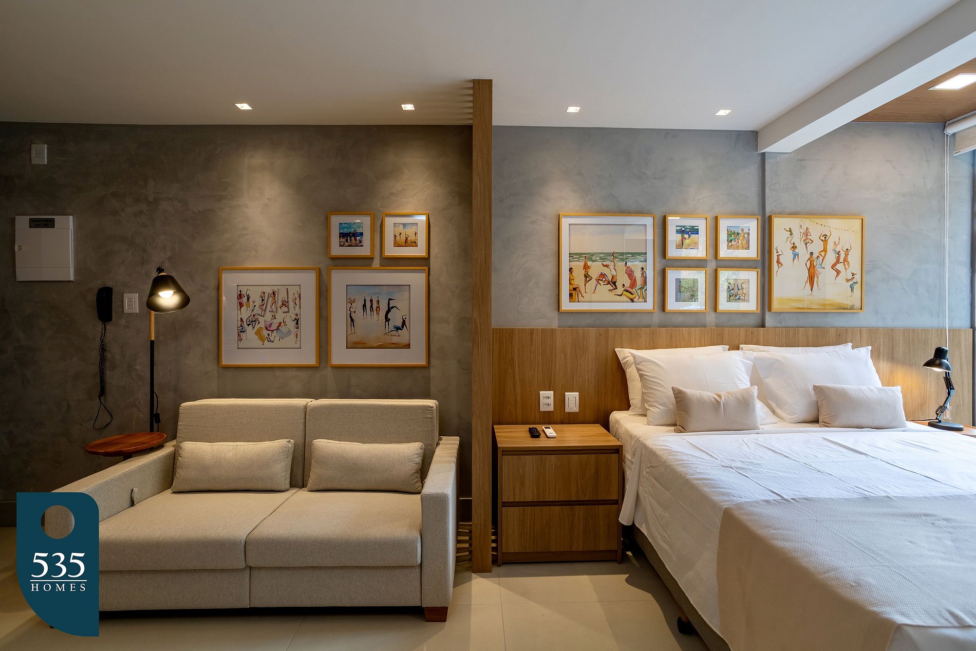 No quarto, a cama queen size, o sofá cama, o fechamento em Reiki e a persiana blackout rolô garantem, privacidade e conforto térmico, complementados por luminária de mesa, além de uma estação de trabalho com poltrona, ideal para home office.